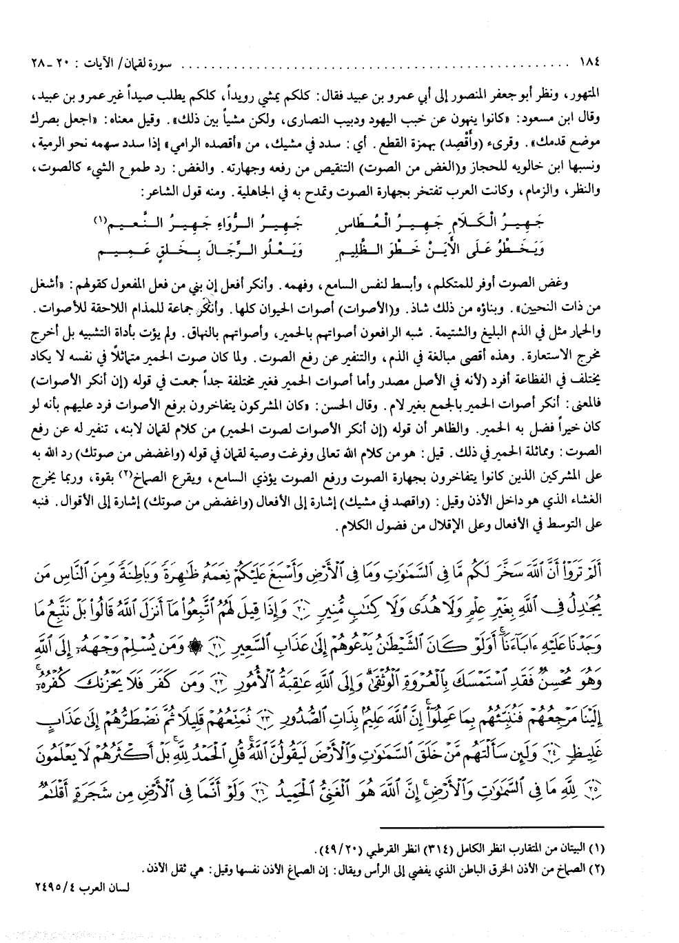 ( أَلَمْ تَرَوْاْ أَنَّ اللَّهَ سَخَّرَ لَكُمْ مَّا فِى السَّمَاوَاتِ وَمَا فِي الاْرْضِ وَأَسْبَغَ عَلَيْكُمْ نِعَمَهُ ظَاهِرَةً وَبَاطِنَةً وَمِنَ النَّاسِ مَن يُجَادِلُ فِى اللَّهِ بِغَيْرِ عِلْمٍ وَلاَ هُدًى وَلاَ كِتَابٍ مُّنِيرٍ وَإِذَا ( سقط : وإذا قيل لهم اتبعوا ما أنزل إلى آخر الآية ) ).