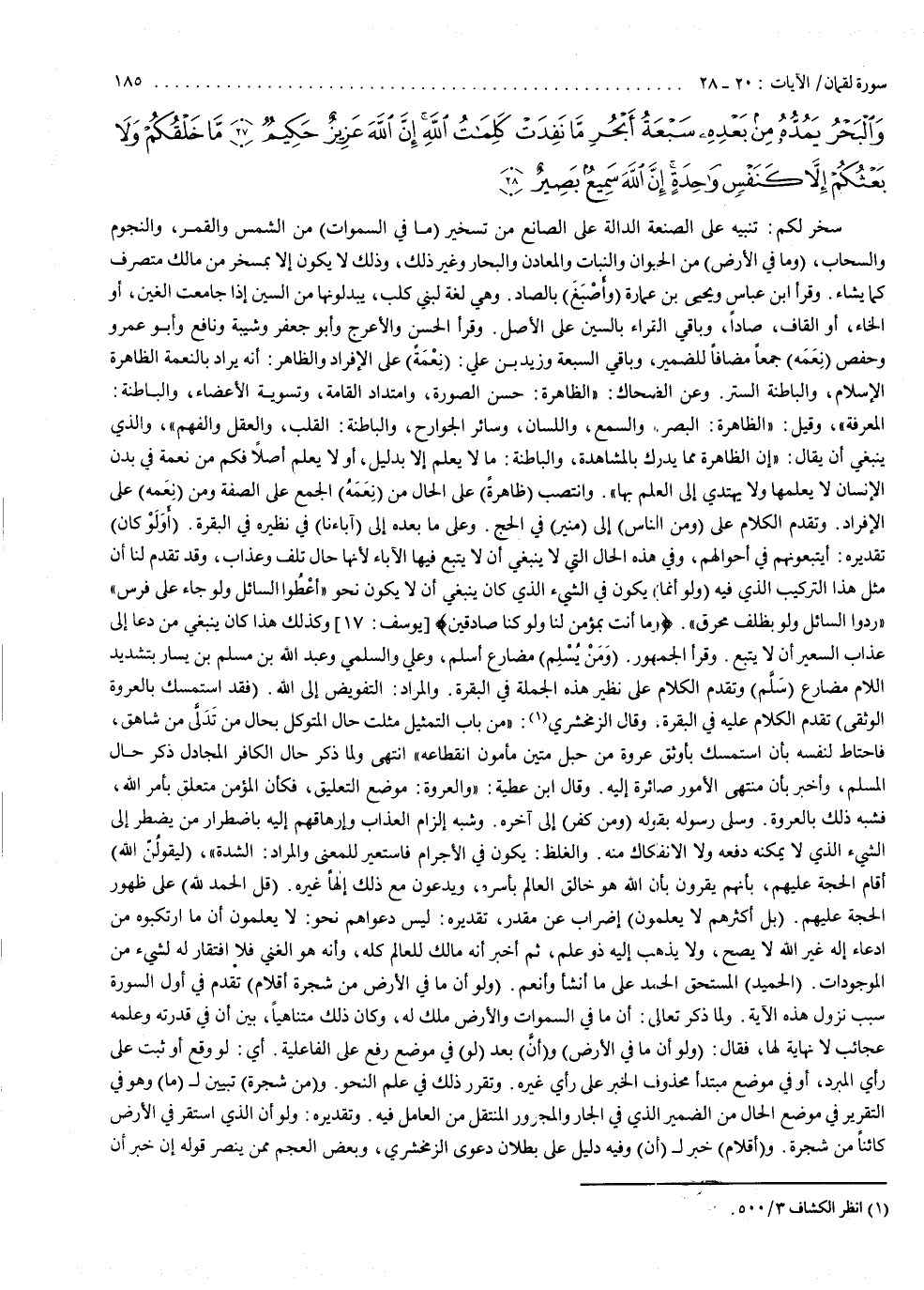 ) سَخَّرَ لَكُمُ ( : تنبيه على الصنعة الدالة على الصانع من تسخير ) مَا فِي السَّمَاوَاتِ ( : من الشمس ، والقمر ، والنجوم ، والسحاب ؛ ) وَمَا فِى الاْرْضِ ( : من الحيوان ، والنبات ، والمعادن ، والبحار ، وغير ذلك ؛ وذلك لا يكون إلا بمسخر من مالك متصرف كما يشاء . وقرأ ابن عباس ، ويحيى بن عمارة : وأصبغ بالصاد ، وهي لغة لبني كلب ، يبدلونها من السين ، إذا جامعت الغين أو الخاء أو القاف صاداً ؛ وباقي القراء : بالسين على الأصل . وقرأ الحسن ، والأعرج ، وأبو جعفر ، وشيبة ، ونافع ، وأبو عمرو ، وحفص : ) نِعَمَهُ ( ، جمعاً مضافاً للضمير ؛ وباقي السبعة ، وزيد ابن علي : نعمة ، على الإفراد . والظاهر أنه يراد بالنعمة الظاهرة : الإسلام ، والباطنة : الستر . وعن الضحاك ، الظاهرة : حسن الصورة وامتداد القامة وتسوية الأعضاء ، والباطنة : المعرفة . وقيل : الظاهرة : البصر والسمع واللسان وسائر الجوارح ، والباطنة : القلب والعقل والفهم . والذي ينبغي أن يقال : إن الظاهرة مما يدرك بالمشاهدة ، والباطنة ما لا يعلم إلا بدليل ، أو لا يعلم أصلاً . فكم من نعمة في بدن الإنسان لا يعلمها ، ولا يهتدي إلى العلم بها ؟ وانتصب ) ظَاهِرَةً ( على الحال من ) نِعَمَهُ ( ، الجمع على الصفة ، ومن نعمة على الإفراد . وتقدم الكلام على : ) وَمِنَ النَّاسِ ( إلى : ) مُّنِيرٍ ( ، في الحج ، وعلى ما بعده إلى : ) ءابَاءنَا ( ، في نظيره في البقرة . ) أَوْ لَوْ ( : كان تقديره : أيتبعونهم في أحوالهم ؟ وفي هذه الحال التي لا ينبغي أن لا يتبع فيها الآباء ؟ لأنها حال تلف وعذاب . وقد تقدم لنا أن مثل هذا التركيب الذي فيه ولو ، إنما يكون في الشيء الذي كان ينبغي أن لا يكون ، نحو : اعطوا السائل ولو جاء على فرس ، ردوا السائل ولو بظلف محرق ، ( وَمَا أَنتَ بِمُؤْمِنٍ لَّنَا وَلَوْ كُنَّا صَادِقِينَ ). وكذلك هذا ، كان ينبغي من دعا إلى عذاب السعير أن لا يتبع . وقرأ الجمهور :
