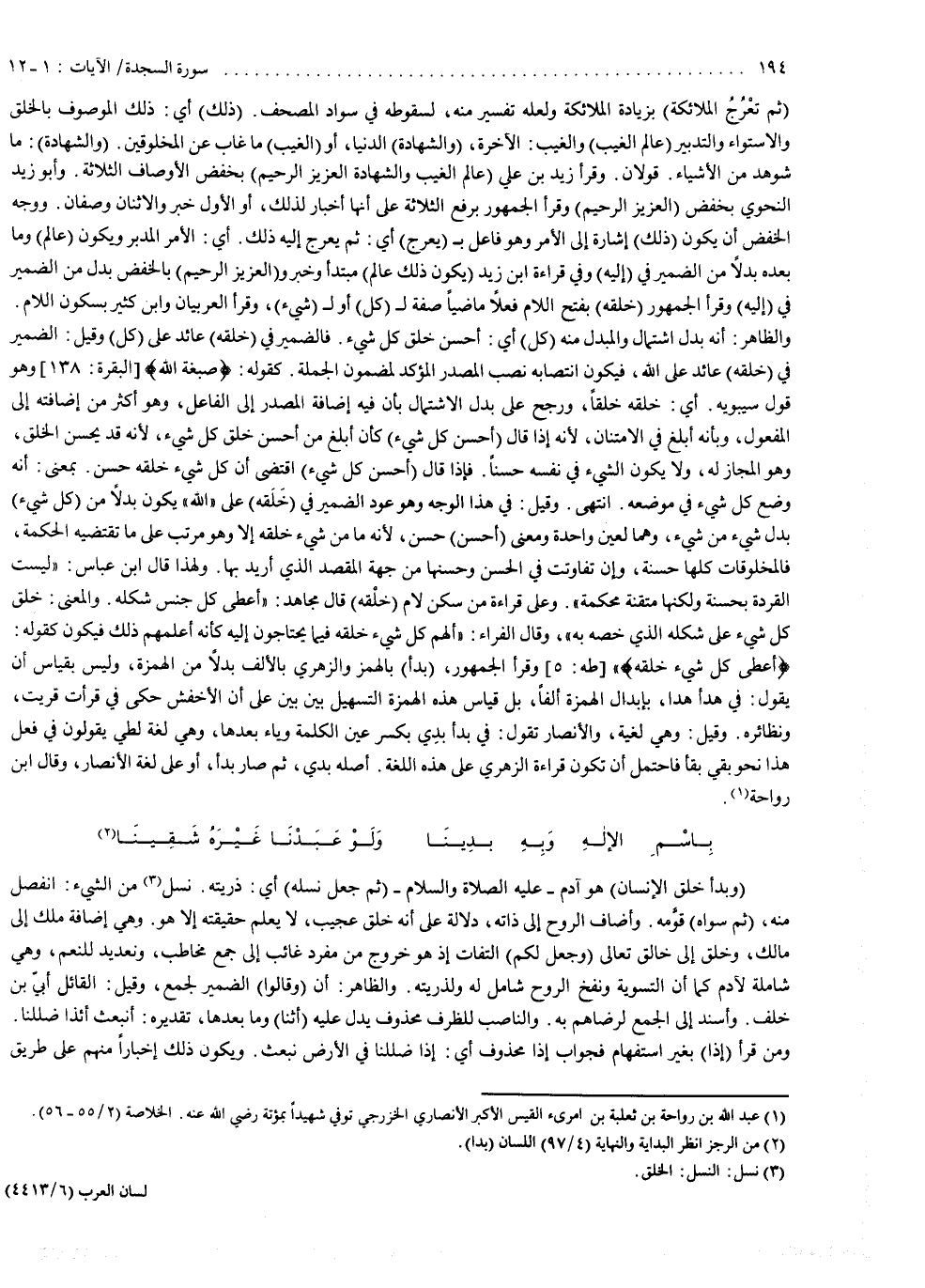 وقيل : في هذا الوجه ، وهو عود الضمير في خلقه على الله ، يكون بدلاً من كل شيء ، بدل شيء من شيء ، وهما لعين واحدة . ومعنى ) أَحْسَنُ ( : حسن ، لأنه ما من شيء خلقه إلا وهو مرتب على ما تقضيه الحكمة . فالمخلوقات كلها حسنة ، وإن تفاوتت في الحسن ، وحسنها من جهة المقصد الذي أريد بها . ولهذا قال ابن عباس : ليست القردة بحسنة ، ولكنها متقنة محكمة . وعلى قراءة من سكن لام خلقه ، قال مجاهد : أعطى كل جنس شكله ، والمعنى : خلق كل شيء على شكله الذي خصه به . وقال الفراء : ألهم كل شيء خلقه فيما يحتاجون إليه ، كأنه أعلمهم ذلك ، فيكون كقوله : ) أَعْطَى كُلَّ شَىء خَلْقَهُ ). وقرأ الجمهور : بدأ بالهمز ؛ والزهري : بالألف بدلاً من الهمزة ، وليس بقياس أن يقول في هدأ : هدا ، بإبدال الهمزة ألفاً ، بل قياس هذه الهمزة التسهيل بين بين ؛ على أن الأخفش حكى في قرأت : قريت ونظائره . وقيل : وهي لغية ؛ والأنصار تقول في بدأ : بدى ، بكسر عين الكلمة وياء بعدها ، وهي لغة لطي . يقولون في فعل هذا نحو بقى : بقأ ، فاحتمل أن تكون قراءة الزهري على هذه اللغة أصله بدى ، ثم صار بدأ ، أو على لغة الأنصار . وقال ابن رواحة : باسم الإله وبه بدينا