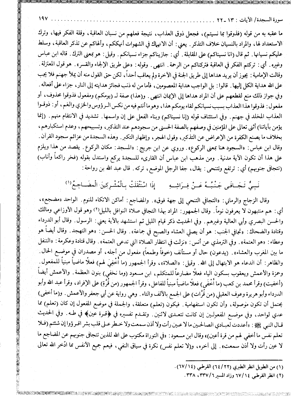 ( وَإِنَّمَا يُؤْمِنُ بِئَايَاتِنَا ( : أثنى تعالى على المؤمنين في وصفهم بالصفة الحسنى ، من سجودهم عند التذكير ، وتسبيحهم وعدم استكبارهم ؛ بخلاف ما يصنع الكفرة من الإعراض عن التذكير ، وقول الهجر ، وإظهار التكبر ؛ وهذه السجدة من عزائم سجود القرآن . وقال ابن عباس : السجود هنا بمعنى الركوع . وروي عن ابن جريج : المسجد مكان الركوع ، يقصد من هذا ويلزم على هذا أن تكون الآية مدنية ومن مذهب ابن عباس أن القارىء للسجدة يركع ، واستدل بقوله : ) وَخَرَّ رَاكِعاً وَأَنَابَ ). ) تَتَجَافَى جُنُوبُهُمْ ( : أي ترتفع وتتنحى ، يقال : جفا الرجل الموضع : تركه . قال عبد الله بن رواحة : نبي تجافى جنبه عن فراشه