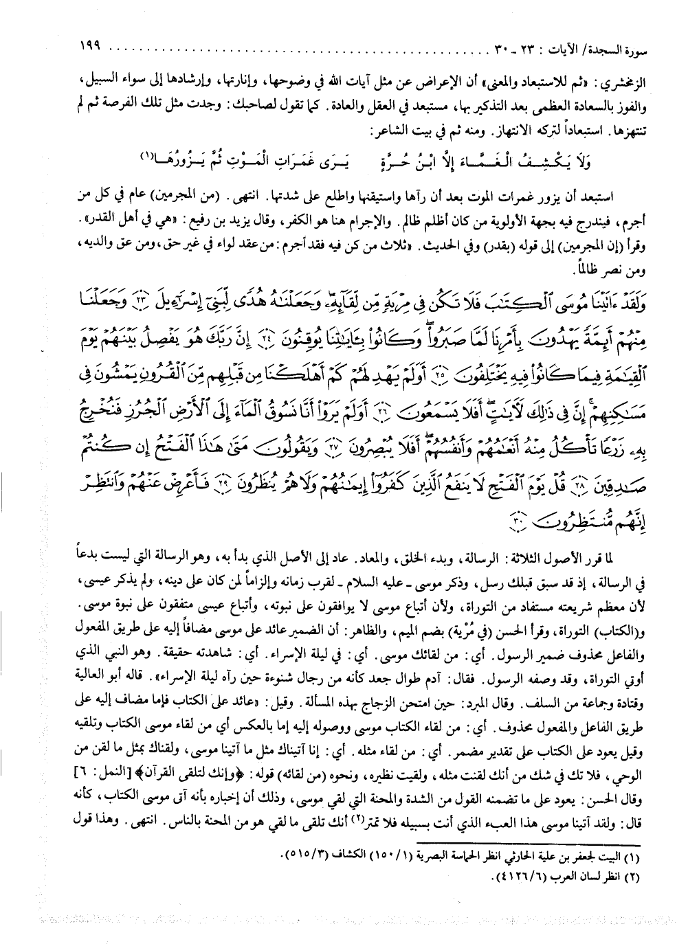 ( وَلَقَدْ ءاتَيْنَا مُوسَى الْكِتَابَ فَلاَ تَكُن فِى مِرْيَةٍ مّن لّقَائِهِ وَجَعَلْنَاهُ هُدًى لِنَبِىّ إِسْراءيلَ وَجَعَلْنَا مِنْهُمْ أَئِمَّةً يَهْتَدُونَ وَجَعَلْنَا مِنْهُمْ أَئِمَّةً يَهْدُونَ بِأَمْرِنَا لَمَّا إِنَّ رَبَّكَ هُوَ يَفْصِلُ بَيْنَهُمْ يَوْمَ الْقَيَامَةِ فِيمَا كَانُواْ فِيهِ يَخْتَلِفُونَ أَوَ لَمْ يَهْدِ لَهُمْ كَمْ أَهْلَكْنَا مِن قَبْلِهِمْ مّنَ الْقُرُونِ يَمْشُونَ فِى مَسَاكِنِهِمْ إِنَّ فِى ذَلِكَ لاَيَاتٍ أَفَلاَ يَسْمَعُونَ أَوَ لَمْ يَرَوْاْ أَنَّا نَسُوقُ الْمَاء إِلَى الاْرْضِ الْجُرُزِ فَنُخْرِجُ بِهِ زَرْعاً تَأْكُلُ مِنْهُ أَنْعَامُهُمْ وَأَنفُسُهُمْ أَفَلاَ يُبْصِرُونَ وَيَقُولُونَ مَتَى هَاذَا الْفَتْحُ إِن كُنتُمْ صَادِقِينَ قُلْ يَوْمَ الْفَتْحِ لاَ يَنفَعُ الَّذِينَ كَفَرُواْ إِيَمَانُهُمْ وَلاَ هُمْ يُنظَرُونَ فَأَعْرِضْ عَنْهُمْ وَانتَظِرْ إِنَّهُمْ مُّنتَظِرُونَ ).