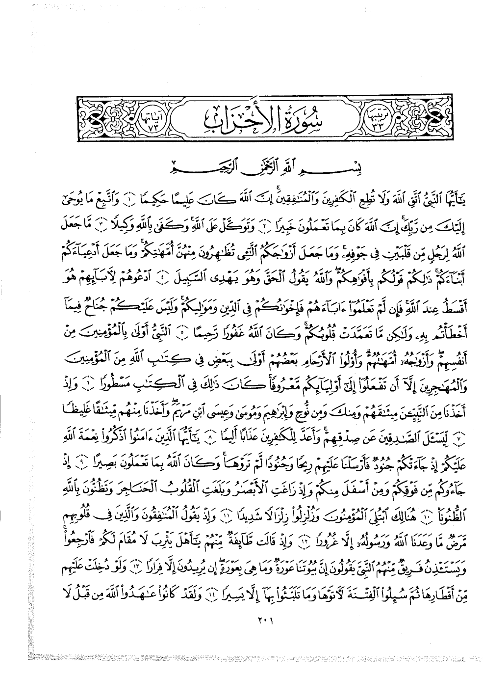 2 ( ) يأَيُّهَا النَّبِىِّ اتَّقِ اللَّهَ وَلاَ تُطِعِ الْكَافِرِينَ وَالْمُنَافِقِينَ إِنَّ اللَّهَ كَانَ عَلِيماً حَكِيماً وَاتَّبِعْ مَا يُوحَى إِلَيْكَ مِن رَبِّكَ إِنَّ اللَّهَ كَانَ بِمَا تَعْمَلُونَ خَبِيراً وَتَوَكَّلْ عَلَى اللَّهِ وَكَفَى بِاللَّهِ وَكِيلاً مَّا جَعَلَ اللَّهُ لِرَجُلٍ مِّن قَلْبَيْنِ فِى جَوْفِهِ وَمَا جَعَلَ أَزْوَاجَكُمُ اللاَّئِى تُظَاهِرُونَ مِنْهُنَّ أُمَّهَاتِكُمْ وَمَا جَعَلَ أَدْعِيَآءَكُمْ أَبْنَآءَكُمْ ذَلِكُمْ قَوْلُكُم بِأَفْوَاهِكُمْ وَاللَّهُ يَقُولُ الْحَقَّ وَهُوَ يَهْدِى السَّبِيلَ ادْعُوهُمْ لاًّبَآئِهِمْ هُوَ أَقْسَطُ عِندَ اللَّهِ فَإِن لَّمْ تَعْلَمُواْ ءَابَاءَهُمْ فَإِخوَانُكُمْ فِى الدِّينِ وَمَوَالِيكُمْ وَلَيْسَ عَلَيْكُمْ جُنَاحٌ فِيمَآ أَخْطَأْتُمْ بِهِ وَلَاكِن مَّا تَعَمَّدَتْ قُلُوبُكُمْ وَكَانَ اللَّهُ غَفُوراً رَّحِيماً النَّبِىُّ أَوْلَى بِالْمُؤْمِنِينَ مِنْ أَنْفُسِهِمْ وَأَزْوَاجُهُ أُمَّهَاتُهُمْ وَأُوْلُو الاٌّ رْحَامِ بَعْضُهُمْ أَوْلَى بِبَعْضٍ فِى كِتَابِ اللَّهِ مِنَ الْمُؤْمِنِينَ وَالْمُهَاجِرِينَ إِلاَّ أَن تَفْعَلُواْ إِلَى أَوْلِيَآئِكُمْ مَّعْرُوفاً كَانَ ذَلِكَ فِى الْكِتَابِ مَسْطُوراً وَإِذْ أَخَذْنَا مِنَ النَّبِيِّيْنَ مِيثَاقَهُمْ وَمِنْكَ وَمِن نُّوحٍ وَإِبْرَاهِيمَ وَمُوسَى وَعِيسَى ابْنِ مَرْيَمَ وَأَخَذْنَا مِنْهُمْ مِّيثَاقًا غَلِيظاً لِّيَسْأَلَ الصَّادِقِينَ عَن صِدْقِهِمْ وَأَعَدَّ لِلْكَافِرِينَ عَذَاباً أَلِيماً ياأَيُّهَا الَّذِينَ ءَامَنُواْ اذْكُرُواْ نِعْمَةَ اللَّهِ عَلَيْكُمْ إِذْ جَآءَتْكُمْ جُنُودٌ فَأَرْسَلْنَا عَلَيْهِمْ رِيحاً وَجُنُوداً لَّمْ تَرَوْهَا وَكَانَ اللَّهُ بِمَا تَعْمَلُونَ بَصِيراً إِذْ جَآءُوكُمْ مِّن فَوْقِكُمْ وَمِنْ أَسْفَلَ مِنكُمْ وَإِذْ زَاغَتِ الاٌّ بْصَارُ وَبَلَغَتِ الْقُلُوبُ الْحَنَاجِرَ وَتَظُنُّونَ بِاللَّهِ الظُّنُونَاْ هُنَالِكَ ابْتُلِىَ الْمُؤْمِنُونَ وَزُلْزِلُواْ زِلْزَالاً شَدِيداً وَإِذْ يَقُولُ الْمُنَافِقُونَ وَالَّذِينَ فِى قُلُوبِهِم مَّرَضٌ مَّا وَعَدَنَا اللَّهُ وَرَسُولُهُ إِلاَّ غُرُوراً وَإِذْ قَالَت طَّآئِفَةٌ مِّنْهُمْ ياأَهْلَ . يَثْرِبَ لاَ مُقَامَ لَكُمْ فَارْجِعُواْ وَيَسْتَأْذِنُ فَرِيقٌ مِّنْهُمُ النَّبِىَّ يَقُولُونَ إِنَّ بُيُوتَنَا عَوْرَةٌ وَمَا هِىَ بِعَوْرَةٍ إِن يُرِيدُونَ إِلاَّ فِرَاراً وَلَوْ دُخِلَتْ عَلَيْهِمْ مِّنْ أَقْطَارِهَا ثُمَّ سُئِلُواْ الْفِتْنَةَ لاّتَوْهَا وَمَا تَلَبَّثُواْ بِهَآ إِلاَّ يَسِيراً وَلَقَدْ كَانُواْ عَاهَدُواْ اللَّهَ مِن قَبْلُ لا