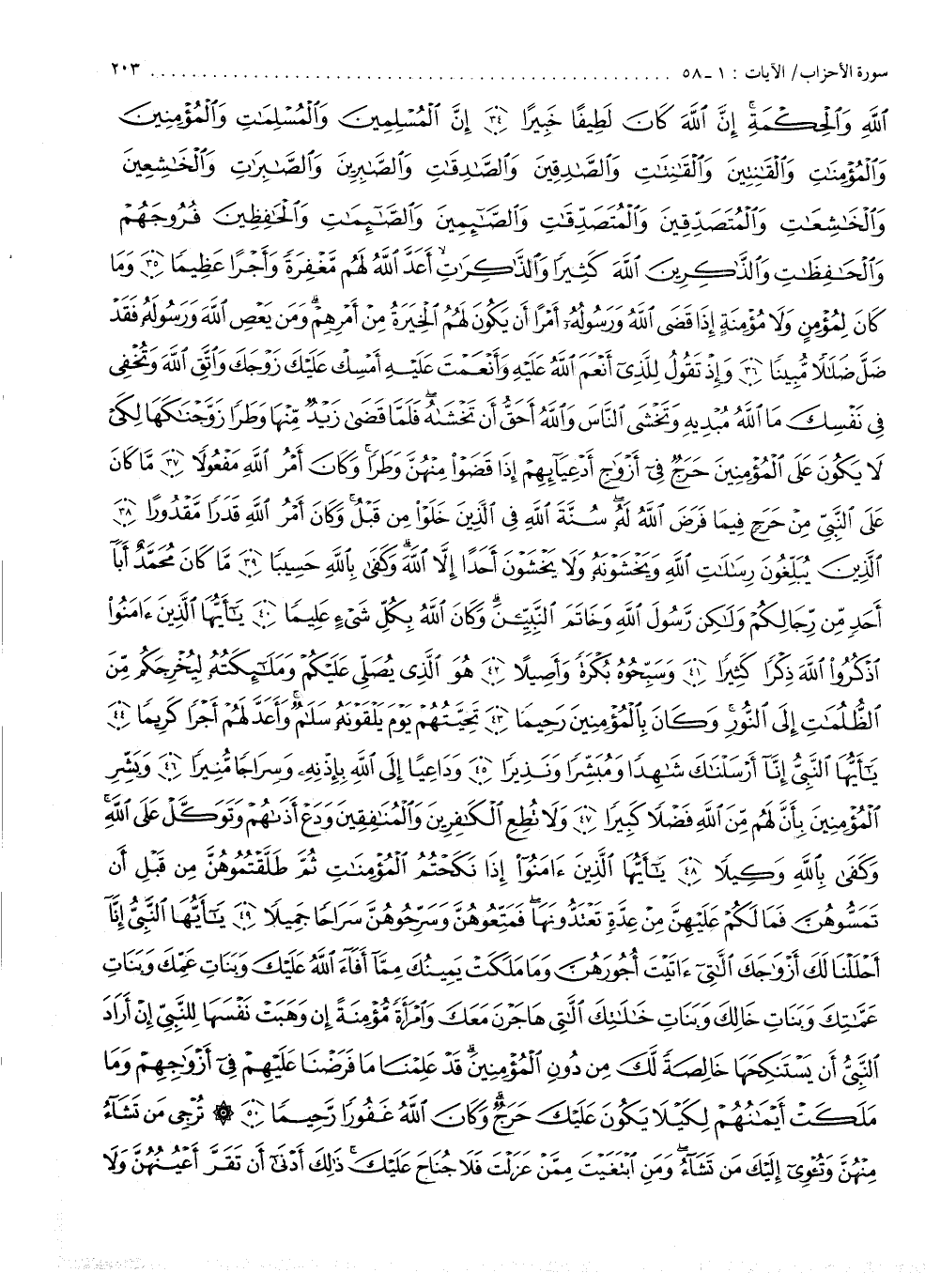 وَالْحِكْمَةِ إِنَّ اللَّهَ كَانَ لَطِيفاً خَبِيراً إِنَّ الْمُسْلِمِينَ وَالْمُسْلِمَاتِ وَالْمُؤْمِنِينَ وَالْمُؤْمِنَاتِ وَالْقَانِتِينَ وَالْقَانِتَاتِ وَالصَّادِقِينَ وَالصَّادِقَاتِ وَالصَّابِرِينَ وَالصَّابِرَاتِ وَالْخَاشِعِينَ وَالْخَاشِعَاتِ وَالْمُتَصَدِّقِينَ وَالْمُتَصَدِّقَاتِ والصَّائِمِينَ والصَّائِمَاتِ وَالْحَافِظِينَ فُرُوجَهُمْ وَالْحَافِظَاتِ وَالذَاكِرِينَ اللَّهَ كَثِيراً وَالذَاكِرَاتِ أَعَدَّ اللَّهُ لَهُم مَّغْفِرَةً وَأَجْراً عَظِيماً وَمَا كَانَ لِمُؤْمِنٍ وَلاَ مُؤْمِنَةٍ إِذَا قَضَى اللَّهُ وَرَسُولُهُ أَمْراً أَن يَكُونَ لَهُمُ الْخِيَرَةُ مِنْ أَمْرِهِمْ وَمَن يَعْصِ اللَّهَ وَرَسُولَهُ فَقَدْ ضَلَّ ضَلَالاً مُّبِيناً وَإِذْ تَقُولُ لِلَّذِىأَنعَمَ اللَّهُ عَلَيْهِ وَأَنْعَمْتَ عَلَيْهِ أَمْسِكْ عَلَيْكَ زَوْجَكَ وَاتَّقِ اللَّهَ وَتُخْفِى فِى نِفْسِكَ مَا اللَّهُ مُبْدِيهِ وَتَخْشَى النَّاسَ وَاللَّهُ أَحَقُّ أَن تَخْشَاهُ فَلَمَّا قَضَى زَيْدٌ مِّنْهَا وَطَراً زَوَّجْنَاكَهَا لِكَىْ لاَ يَكُونَ عَلَى الْمُؤْمِنِينَ حَرَجٌ فِىأَزْوَاجِ أَدْعِيَآئِهِمْ إِذَا قَضَوْاْ مِنْهُنَّ وَطَراً وَكَانَ أَمْرُ اللَّهِ مَفْعُولاً مَّا كَانَ عَلَى النَّبِىِّ مِنْ حَرَجٍ فِيمَا فَرَضَ اللَّهُ لَهُ سُنَّةَ اللَّهِ فِى الَّذِينَ خَلَوْاْ مِن قَبْلُ وَكَانَ أَمْرُ اللَّهِ قَدَراً مَّقْدُوراً الَّذِينَ يُبَلِّغُونَ رِسَالاتِ اللَّهِ وَيَخْشَوْنَهُ وَلاَ يَخْشَوْنَ أَحَداً إِلاَّ اللَّهَ وَكَفَى بِاللَّهِ حَسِيباً مَّا كَانَ مُحَمَّدٌ أَبَآ أَحَدٍ مّن رِّجَالِكُمْ وَلَاكِن رَّسُولَ اللَّهِ وَخَاتَمَ النَّبِيِّينَ وَكَانَ اللَّهُ بِكُلِّ شَىْءٍ عَلِيماً ياأَيُّهَا الَّذِينَ ءَامَنُواْ اذْكُرُواْ اللَّهَ ذِكْراً كَثِيراً وَسَبِّحُوهُ بُكْرَةً وَأَصِيلاً هُوَ الَّذِى يُصَلِّى عَلَيْكُمْ وَمَلَائِكَتُهُ لِيُخْرِجَكُمْ مِّنَ الظُّلُمَاتِ إِلَى النُّورِ وَكَانَ بِالْمُؤْمِنِينَ رَحِيماً تَحِيَّتُهُمْ يَوْمَ يَلْقَوْنَهُ سَلَامٌ وَأَعَدَّ لَهُمْ أَجْراً كَرِيماً ياأَيُّهَا النَّبِىُّ إِنَّآ أَرْسَلْنَاكَ شَاهِداً وَمُبَشِّراً وَنَذِيراً وَدَاعِياً إِلَى اللَّهِ بِإِذْنِهِ وَسِرَاجاً مُّنِيراً وَبَشِّرِ الْمُؤْمِنِينَ بِأَنَّ لَهُمْ مِّنَ اللَّهِ فَضْلاً كِبِيراً وَلاَ تُطِعِ الْكَافِرِينَ وَالْمُنَافِقِينَ وَدَعْ أَذَاهُمْ وَتَوَكَّلْ عَلَى اللَّهِ وَكَفَى بِاللَّهِ وَكِيلاً ياأَيُّهَا الَّذِينَ ءَامَنُواْ إِذَا نَكَحْتُمُ الْمُؤْمِنَاتِ ثُمَّ طَلَّقْتُمُوهُنَّ مِن قَبْلِ أَن تَمَسُّوهُنَّ فَمَا لَكُمْ عَلَيْهِنَّ مِنْ عِدَّةٍ تَعْتَدُّونَهَا فَمَتِّعُوهُنَّ وَسَرِّحُوهُنَّ سَرَاحاً جَمِيلاً ياأَيُّهَا النَّبِىُّ إِنَّآ أَحْلَلْنَا لَكَ أَزْوَاجَكَ اللاَّتِىءَاتَيْتَ أُجُورَهُنَّ وَمَا مَلَكَتْ يَمِينُكَ مِمَّآ أَفَآءَ اللَّهُ عَلَيْكَ وَبَنَاتِ عَمِّكَ وَبَنَاتِ عَمَّاتِكَ وَبَنَاتِ خَالِكَ وَبَنَاتِ خَالَاتِكَ اللاَّتِى هَاجَرْنَ مَعَكَ وَامْرَأَةً مُّؤْمِنَةً إِن وَهَبَتْ نَفْسَهَا لِلنَّبِىِّ إِنْ أَرَادَ النَّبِىُّ أَن يَسْتَنكِحَهَا خَالِصَةً لَّكَ مِن دُونِ الْمُؤْمِنِينَ قَدْ عَلِمْنَا مَا فَرَضْنَا عَلَيْهِمْ فِىأَزْوَاجِهِمْ وَمَا مَلَكَتْ أَيْمَانُهُمْ لِكَيْلاَ يَكُونَ عَلَيْكَ حَرَجٌ وَكَانَ اللَّهُ غَفُوراً رَّحِيماً تُرْجِى مَن تَشَآءُ مِنْهُنَّ وَتُؤْوِىإِلَيْكَ مَن تَشَآءُ وَمَنِ ابْتَغَيْتَ مِمَّنْ عَزَلْتَ فَلاَ جُنَاحَ عَلَيْكَ ذَلِكَ أَدْنَى أَن تَقَرَّ أَعْيُنُهُنَّ وَلاَ