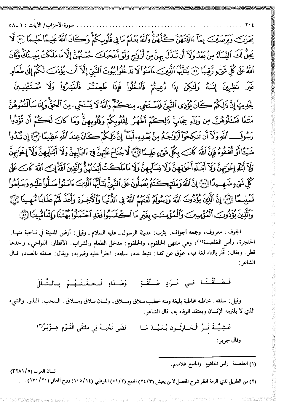 يَحْزَنَّ وَيَرْضَيْنَ بِمَآ ءَاتَيْتَهُنَّ كُلُّهُنَّ وَاللَّهُ يَعْلَمُ مَا فِى قلُوبِكُمْ وَكَانَ اللَّهُ عَلِيماً حَلِيماً لاَّ يَحِلُّ لَكَ النِّسَآءُ مِن بَعْدُ وَلاَ أَن تَبَدَّلَ بِهِنَّ مِنْ أَزْوَاجٍ وَلَوْ أَعْجَبَكَ حُسْنُهُنَّ إِلاَّ مَا مَلَكَتْ يَمِينُكَ وَكَانَ اللَّهُ عَلَى كُلِّ شَىْءٍ رَّقِيباً ياأَيُّهَا الَّذِينَ ءَامَنُواْ لاَ تَدْخُلُواْ بُيُوتَ النَّبِىِّ إِلاَّ أَن يُؤْذَنَ لَكُمْ إِلَى طَعَامٍ غَيْرَ نَاظِرِينَ إِنَاهُ وَلَكِنْ إِذَا دُعِيتُمْ فَادْخُلُواْ فَإِذَا طَعِمْتُمْ فَانْتَشِرُواْ وَلاَ مُسْتَأْنِسِينَ لِحَدِيثٍ إِنَّ ذَلِكُمْ كَانَ يُؤْذِى النَّبِىِّ فَيَسْتَحْيِى مِنكُمْ وَاللَّهُ لاَ يَسْتَحْىِ مِنَ الْحَقِّ وَإِذَا سَأَلْتُمُوهُنَّ مَتَاعاً فَاسْألُوهُنَّ مِن وَرَآءِ حِجَابٍ ذالِكُمْ أَطْهَرُ لِقُلُوبِكُمْ وَقُلُوبِهِنَّ وَمَا كَانَ لَكُمْ أَن تؤْذُواْ رَسُولَ اللَّهِ وَلاَ أَن تَنكِحُواْ أَزْوَاجَهُ مِن بَعْدِهِ أَبَداً إِنَّ ذالِكُمْ كَانَ عِندَ اللَّهِ عَظِيماً إِن تُبْدُواْ شَيْئاً أَوْ تُخْفُوهُ فَإِنَّ اللَّهَ كَانَ بِكُلِّ شَىْءٍ عَلِيماً لاَّ جُنَاحَ عَلَيْهِنَّ فِىءَابَآئِهِنَّ وَلاَ أَبْنَآئِهِنَّ وَلاَ إِخْوَانِهِنَّ وَلاَ أَبْنَآءِ إِخْوَانِهِنَّ وَلاَ أَبْنَآءِ أَخَوَاتِهِنَّ وَلاَ نِسَآئِهِنَّ وَلاَ مَا مَلَكَتْ أَيْمَانُهُنَّ وَاتَّقِينَ اللَّهَ إِنَّ اللَّهَ كَانَ عَلَى كُلِّ شَىْءٍ شَهِيداً إِنَّ اللَّهَ وَمَلَائِكَتَهُ يُصَلُّونَ عَلَى النَّبِىِّ ياأَيُّهَا الَّذِينَ ءَامَنُواْ صَلُّواْ عَلَيْهِ وَسَلِّمُواْ تَسْلِيماً إِنَّ الَّذِينَ يُؤْذُونَ اللَّهَ وَرَسُولَهُ لَعَنَهُمُ اللَّهُ فِى الدُّنْيَا وَالاٌّ خِرَةِ وَأَعَدَّ لَهُمْ عَذَاباً مُّهِيناً وَالَّذِينَ يُؤْذُونَ الْمُؤْمِنِينَ وَالْمُؤْمِنَاتِ بِغَيْرِ مَا اكْتَسَبُواْ فَقَدِ احْتَمَلُواْ بُهْتَاناً وَإِثْماً مُّبِيناً ياأَيُّهَا النَّبِىُّ قُل لاًّزْوَاجِكَ وَبَنَاتِكَ وَنِسَآءِ الْمُؤْمِنِينَ يُدْنِينَ عَلَيْهِنَّ مِن جَلَابِيبِهِنَّ ذالِكَ أَدْنَى أَن يُعْرَفْنَ فَلاَ يُؤْذَيْنَ وَكَانَ اللَّهُ غَفُوراً رَّحِيماً لَّئِن لَّمْ يَنتَهِ الْمُنَافِقُونَ وَالَّذِينَ فِى قُلُوبِهِمْ مَّرَضٌ وَالْمُرْجِفُونَ فِى الْمَدِينَةِ لَنُغْرِيَنَّكَ بِهِمْ ثُمَّ لاَ يُجَاوِرُونَكَ فِيهَآ إِلاَّ قَلِيلاً مَّلْعُونِينَ أَيْنَمَا ثُقِفُواْ أُخِذُواْ وَقُتِّلُواْ تَقْتِيلاً سُنَّةَ اللَّهِ فِى الَّذِينَ خَلَوْاْ مِن قَبْلُ وَلَن تَجِدَ لِسُنَّةِ اللَّهِ تَبْدِيلاً يَسْألُكَ النَّاسُ عَنِ السَّاعَةِ قُلْ إِنَّمَا عِلْمُهَا عِندَ اللَّهِ وَمَا يُدْرِيكَ لَعَلَّ السَّاعَةَ تَكُونُ قَرِيباً إِنَّ اللَّهَ لَعَنَ الْكَافِرِينَ وَأَعَدَّ لَهُمْ سَعِيراً خَالِدِينَ فِيهَآ أَبَداً لاَّ يَجِدُونَ وَلِيّاً وَلاَ نَصِيراً يَوْمَ تُقَلَّبُ وُجُوهُهُمْ فِى النَّارِ يَقُولُونَ يالَيْتَنَآ أَطَعْنَا اللَّهَ وَأَطَعْنَا الرَّسُولاَ وَقَالُواْ رَبَّنَآ إِنَّآ أَطَعْنَا سَادَتَنَا وَكُبَرَآءَنَا فَأَضَلُّونَا السَّبِيلاْ رَبَّنَآ ءَاتِهِمْ ضِعْفَيْنِ مِنَ الْعَذَابِ وَالْعَنْهُمْ لَعْناً كَبِيراً ياأَيُّهَا الَّذِينَ ءَامَنُواْ لاَ تَكُونُواْ كَالَّذِينَ ءَاذَوْاْ مُوسَى فَبرَّأَهُ اللَّهُ مِمَّا قَالُواْ وَكَانَ عِندَ اللَّهِ وَجِيهاً ياأَيُّهَا الَّذِينَ ءَامَنُواْ اتَّقُواْ اللَّهَ وَقُولُواْ قَوْلاً سَدِيداً يُصْلِحْ لَكُمْ أَعْمَالَكُمْ وَيَغْفِرْ لَكُمْ ذُنُوبَكُمْ وَمَن يُطِعِ اللَّهَ وَرَسُولَهُ فَقَدْ فَازَ فَوْزاً عَظِيماً إِنَّا عَرَضْنَا الاٌّ مَانَةَ عَلَى السَّمَاوَاتِ وَالاٌّ رْضِ وَالْجِبَالِ فَأبَيْنَ أَن يَحْمِلْنَهَا وَأَش