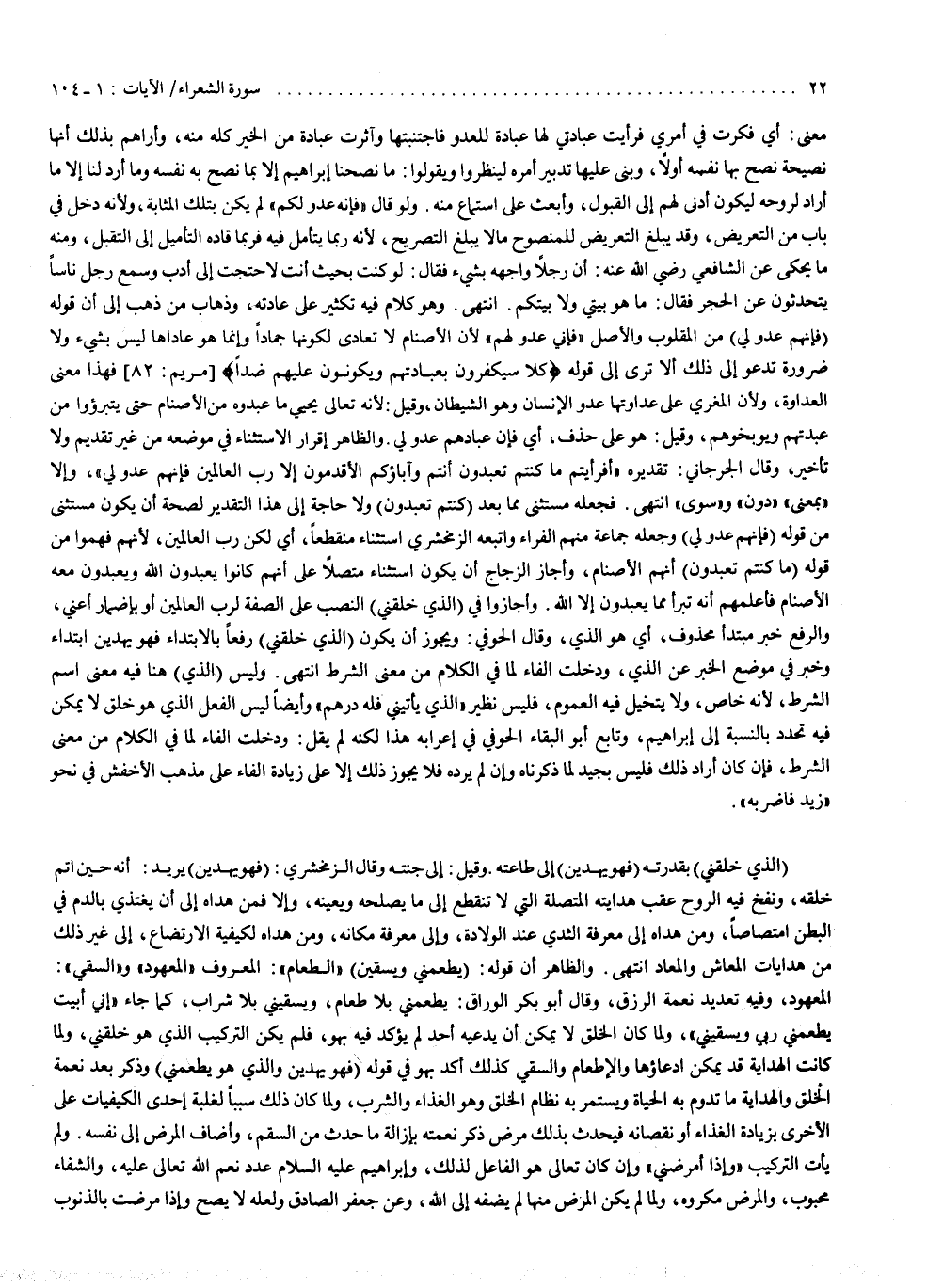 معنى : أي فكرت في أمري ، فرأيت عبادتي لها عبادة للعدو ، فاجتنبتها وآثرت عبادة من الخير كله منه ، وأراهم بذلك أنها نصيحة نصح بها نفسه أولاً ، وبنى عليها تدبير أمره ، لينظروا ويقولوا : ما نصحنا إبراهيم إلا بما نصح به نفسه ، وما أراد لنا إلا ما أرادو لروحه ، ليكون أدنى لهم إلى القبول ، وأبعث على استماع منه . ولو قال : فإنه عدو لكم ، لم يكن بتلك المثابة ، ولأنه دخل في باب من التعريض ، وقد يبلغ التعريض للمنضوح . ما لا يبلغ التصريح ، لأنه ربما يتأمل فيه ، فربما قاده التأميل إلى التقبل . ومنه ما يحكى عن الشافعي رضي الله عنه ، أن رجلاً واجهه بشيء فقال : لو كنت بحيث أنت لاحتجت إلى أدب ؛ وسمع رجل ناساً يتحدثون عن الحجر فقال : ما هو بيتي ولا بيتكم . انتهى . وهو كلام فيه تكثير على عادته ، وذهاب من ذهب إلى أن قوله : ) فَإِنَّهُمْ عَدُوٌّ لِى ( ، من المقلوب والأصل : فإني عدو لهم ، لأن الأصنام لا تعادي لكونها جماداً ، وإنما هو عاداها ليس بشيء ولا ضرورة تدعو إلى ذلك . ألا ترى إلى قوله : ) كَلاَّ سَيَكْفُرُونَ بِعِبَادَتِهِمْ وَيَكُونُونَ عَلَيْهِمْ ضِدّاً ( ، فهذا معنى العداوة ، ولأن المغري على عداوتها عدو الإنسان ، وهو الشيطان . وقيل : لأنه تعالى يحيي ما عبدوه من الأصنام حتى يبترؤوا من عبدتهم ويوبخوهم . وقيل : هو على حذف ، أي : فإن عبادهم عدولي . والظاهر إقرار الاستثناء في موضعه من غير تقديم ولا تأخير . وقال الجرجاني : تقديره : أفرأيتم ما كنتم تعبدون أنتم وآباؤكم الأقدمون إلا رب العالمين ، فإنهم عدو لي ، وإلا : بمعنى دون وسوى . انتهى . فجعله مستثنى مما بعد كنتم تعبدون ، ولا حاجة إلى هذا التقدير لصحة أن يكون مستثنى من قوله : ) فَإِنَّهُمْ عَدُوٌّ لِى ). وجعله جماعة منهم الفراء ، واتبعه الزمخشري استثناء منقطعاً ، أي لكن رب العالمين ، لأنهم فهموا من قوله : ما كنتم تعبدون أنهم الأصنام . وأجاز الزجاج أن يكون استثناء متصلاً على أنهم كانوا يعبدون الله ويعبدون معه الأصنام ، فأعلمهم أنه تبرأ مما يعبدون إلا الله ، وأجازوا في ) الَّذِى خَلَقَنِى ( النصب على الصفة لرب العالمين ، أو بإضمار ، أعني : والرفع خبر مبتدأ محذوف ، أي هو الذي . وقال الحوفي : ويجوز أن يكون ) الَّذِى خَلَقَنِى ( رفعاً بالابتداء ، ( فَهُوَ يَهْدِينِ ( : ابتداء وخبر في موضع الخبر عن الذي ، ودخلت الفاء لما في الكلام من معنى الشرط . انتهى . وليس الذي هنا فيه معنى اسم الشرط لأنه خاص ، ولا يتخيل فيه العموم ، فليس نظير : الذي يأتيني فله درهم ، وأيضاً ليس الفعل الذي هو خلق لا يمكن فيه تحدد بالنسبة إلى إبراهيم .