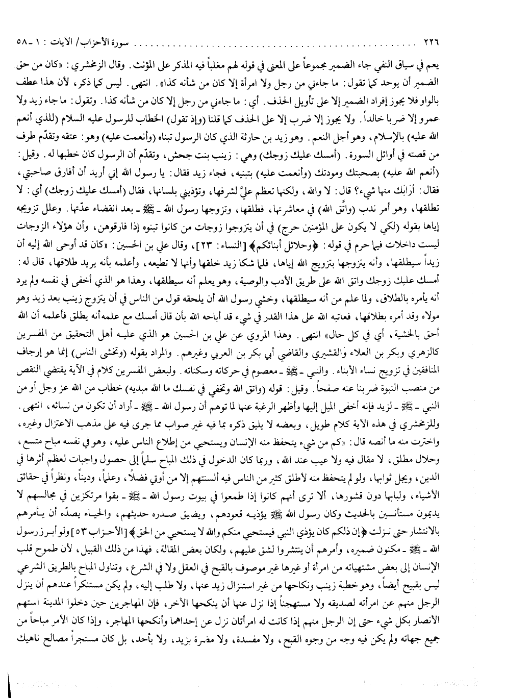 وللزمخشري : في هذه الآية كلام طويل ، وبعضه لا يليق ذكره بما فيه غير صواب مما جرى فيه على مذهب الاعتزال وغيره ، واخترت منه ما أنصه . قال : كم من شيء يتحفظ منه الإنسان ويستحيي من إطلاع الناس عليه ، وهو في نفسه مباح متسع وحلال مطلق ، لا مقال فيه ولا عيب عند الله . وربما كان الدخول في ذلك المباح سلماً إلى حصول واجبات ، لعظم أثرها في الدين ، ويجل ثوابها ، ولو لم يتحفظ منه ، لأطلق كثير من الناس فيه ألسنتهم ، إلا من أوتي فضلاً وعلماً وديناً ونظراً في حقائق الأشياء ولبابها دون قشورها . ألا ترى أنهم كانوا إذا طمعوا في بيوت رسول الله ( صلى الله عليه وسلم ) ) ، بقوا مرتكزين في مجالسهم لا يديمون مستأنسين بالحديث . وكان رسول الله ( صلى الله عليه وسلم ) ) يؤذيه قعودهم ، ويضيق صدره حديثهم ، والحياء يصدّه أن يأمرهم بالانتشار حتى نزلت : ) يأَيُّهَا الَّذِينَ ءامَنُواْ لاَ تَدْخُلُواْ بُيُوتَ النَّبِىّ إِلاَّ أَن يُؤْذَنَ لَكُمْ إِلَى ). ولو أبرز رسول الله ( صلى الله عليه وسلم ) ) مكنون ضميره ، وأمرهم أن ينتشروا ، لشق عليهم ، ولكان بعض المقالة . فهذا من ذلك القبيل ، لأن طموح قلب الإنسان إلى بعض مشتهياته ، من امرأة أو غيرها ، غير موصوف بالقبح في العقل ولا في الشرع . وتناول المباح بالطريق الشرعي ليس بقبيح أيضاً ، وهو خطبة زينب ونكاحها من غير استنزال زيد عنها ، ولا طلب إليه . ولم يكن مستنكراً عندهم أن ينزل الرجل منهم عن امرأته لصديقه ، ولا مستهجناً إذا نزل عنها أن ينكحها الآخر . فإن المهاجرين حين دخلوا المدينة ، استهم الأنصار بكل شيء ، حتى أن الرجل منهم إذا كانت له امرأتان نزل عن إحداهما وأنكحها المهاجر . وإذا كان الأمر مباحاً من جميع جهاته ، ولم يكن فيه وجه من وجوه القبح ، ولا مفسدة ولا مضرة بزيد ولا بأحد ، بل كان مستجراً مصالح ؛ ناهيك