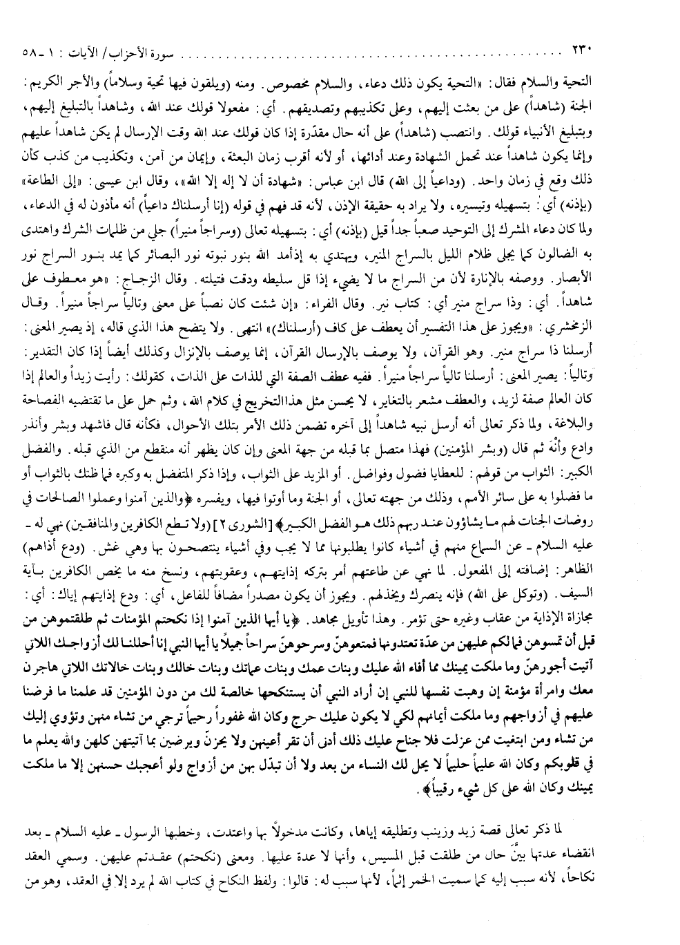 التحية والسلام فقال : التحية يكون ذلك دعاء ، والسلام مخصوص ، ومنه : ) وَيُلَقَّوْنَ فِيهَا تَحِيَّةً وَسَلَاماً ). والأجر الكريم : الجنة ، ( شَاهِداً ( على من بعثت إليهم ، وعلى تكذيبهم وتصديقهم ، أي مفعولاً قولك عند الله ، وشاهداً بالتبليغ إليهم ، وبتبليغ الأنبياء قولك . وانتصب ) شَاهِداً ( على أنه حال مقدّرة ، إذا كان قولك عند الله وقت الإرسال لم يكن شاهداً عليهم ، وإنما يكون شاهداً عند تحمل الشهادة وعند أدائها ، أو لأنه أقرب زمان البعثة ، وإيمان من آمن وتكذيب من كذب كان ذلك وقع في زمان واحد .
