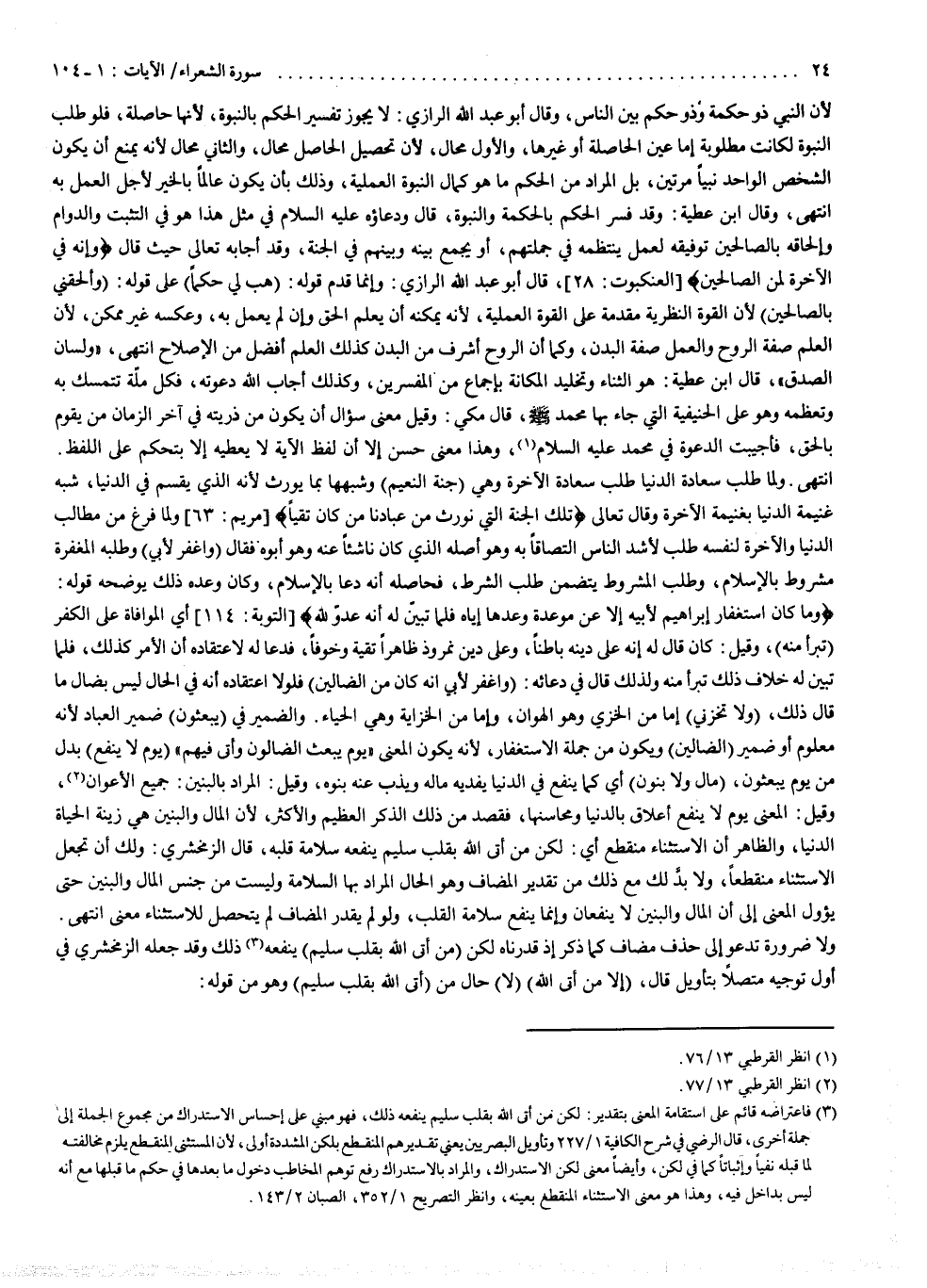 قال أبو عبد الله الرازي : وإنما قدّم قوله : ) هَبْ لِى حُكْماً ( على قوله : ) وَأَلْحِقْنِى بِالصَّالِحِينَ ( ، لأن القوة النظرية مقدمة على القوة العملية ، لأنه يمكنه أن يعلم الحق ، وإن لم يعمل به ، وعكسه غير ممكن ، لأن العلم صفة الروح ، والعمل صفة البدن ، وكما أن الروح أشرف من البدن ، كذلك العلم أفضل من الإصلاح . انتهى . ولسان الصدق ، قال ابن عطية : هو الثناء وتخليد المكانة بإجماع من المفسرين . وكذلك أجاب الله دعوته ، فكل ملة تتمسك به وتعظمه ، وهو على الحنيفية التي جاء بها محمد ( صلى الله عليه وسلم ) ) . قال مكي : وقيل معنى سؤاله أن يكون من ذريته في آخر الزمان من يقوم بالحق ، فأجيبت الدعوة في محمد عليه السلام ، وهذا معنى حسن ، إلا أن لفظ الآية لا يعطيه إلا بتحكم على اللفظ . انتهى . ولما طلب سعادة الدنيا ، طلب سعادة الآخرة ، وهي جنة النعيم ، وشبهها بما يورث ، لأنه الذي يقسم في الدنيا شبه غنيمة الدنيا بغنيمة الآخرة ، وقال تعالى : ) تِلْكَ الْجَنَّةُ الَّتِى نُورِثُ مِنْ عِبَادِنَا مَن كَانَ تَقِيّاً ).