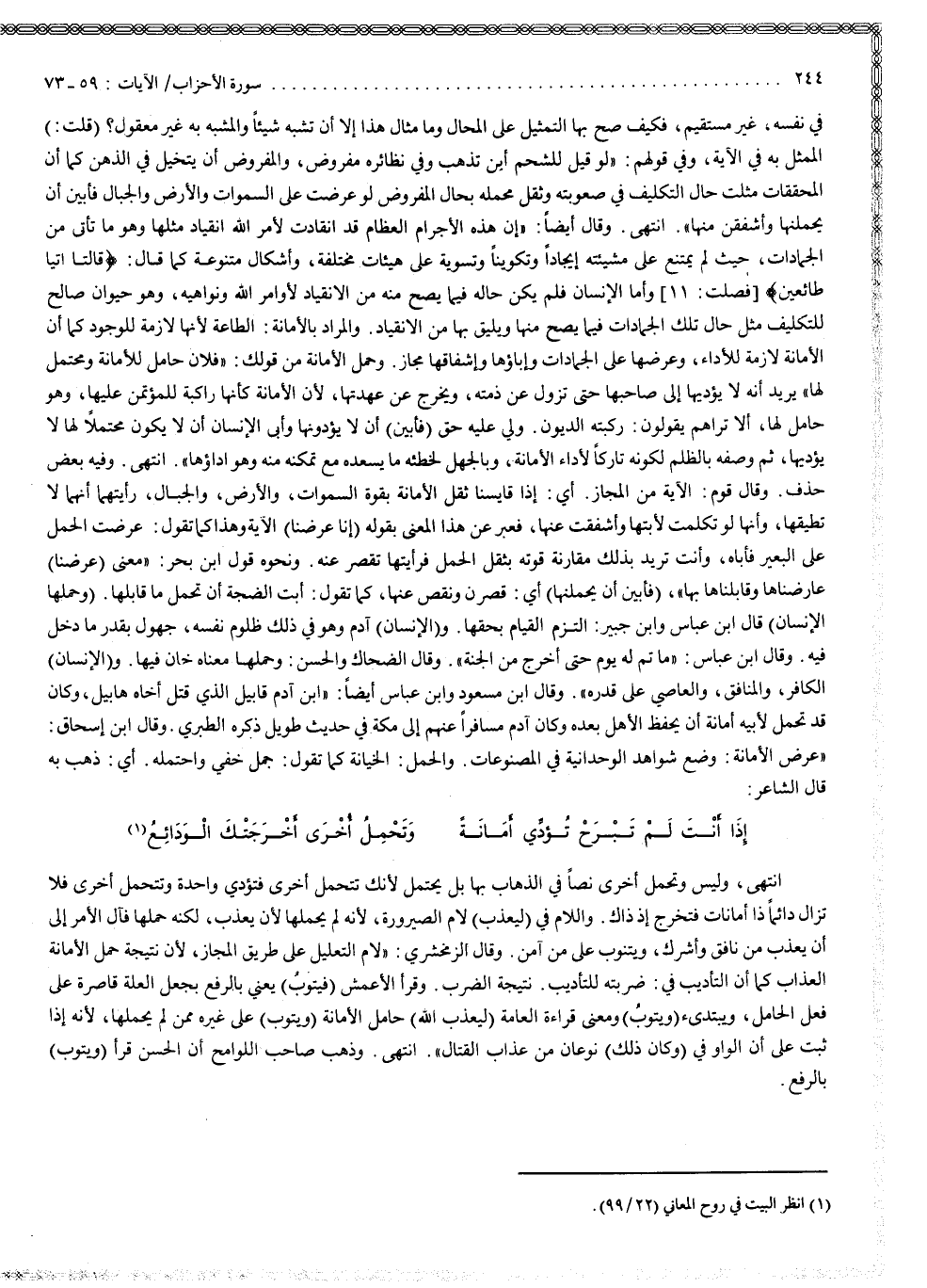 وقال أيضاً : إن هذه الأجرام العظام قد انقادت لأمر الله انقياد مثلها ، وهو ما تأتي من الجمادات ، حيث لم يمتنع على مشيئته إيجاداً وتكويناً وتسوية على هيئات مختلفة وأشكال متنوعة . كما قال : ) قَالَتَا أَتَيْنَا طَائِعِينَ ). وأما الإنسان ، فلم يكن حاله فيما يصح منه من الانقياد لأوامر الله ونواهيه ، وهو حيوان إن صالح للتكليف ، مثل حال تلك الجمادات فيما يصح منها ويليق بها من الانقياد . والمراد بالأمانة : الطاعة ، لأنها لازمة للوجود . كما أن الأمانة لازمة للأداء ، وعرضها على الجمادات وإباؤها وإشفاقها مجاز . وحمل الأمانة من قولك : فلان حامل للأمانة ومحتمل لها ، يريد أنه لا يؤديها إلى صاحبها حتى تزول عن ذمته ويخرج عن عهدتها ، لأن الأمانة كأنها راكبة للمؤتمن عليها ، وهو حامل لها . ألا تراهم يقولون : ركبته الديون ؟ ولي عليه حق ؟ فأبين أن لا يؤدونها ، وأبى الإنسان أن لا يكون محتملاً لها لا يؤديها . ثم وصفه بالظلم لكونه تاركاً لأداء الأمانة ، وبالجهل لخطئه ما يسعده مع تمكنه منه وهو أداؤها . انتهى ، وفيه بعض حذف .