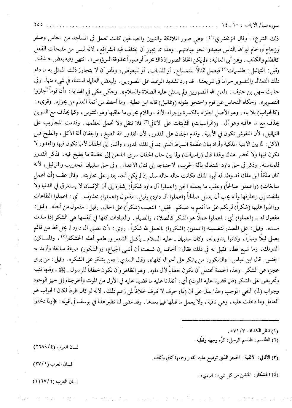 ذلك الشرع . وقال الزمخشري : هي صور الملائكة والنبين والصالحين ، كانت تعمل في المساجد من نحاس وصفر وزجاج ورخام ، ليراها الناس ، فيعبدوا نحو عبادتهم ، وهذا مما يجوز أن يختلف فيه الشرائع ، لأنه ليس من مقبحات الفعل ، كالظلم والكذب . وعن أبي العالية : لم يكن اتخاذ الصور إذ ذاك محرماً ، أو صوراً محذوفة الرؤوس . انتهى ، وفيه بعض حذف . وقيل : التماثيل طلسمات ، فيعمل تمثالاً للتمساح ، أو للذباب ، أو للبعوض ، ويأمر أن لا يتجاوز ذلك الممثل به ما دام ذلك التمثال والتصوير حراما في شريعتنا . وقد ورد تشديد الوعيد على المصورين ، ولبعض العلماء استثناء في شيء منها . وفي حديث سهل بن حنيف : لعن الله المصورين ، ولم يستثن عليه الصلاة والسلام . وحكى مكي في الهداية أن قوماً أجازوا التصوير ، وحكاه النحاس عن قوم واحتجوا بقوله : ) وَتَمَاثِيلَ ( ، قاله ابن عطية ، وما أحفظ من أئمة العلم من يجوزه . وقرىء : ) كَالْجَوَابِ ( بلاياء ، وهو الأصل ، اجتزاء بالكسرة ، واجراء الألف واللام مجرى ما عاقبها ، وهو التنوين ، وكما يحذف مع التنوين يحذف مع ما عاقبه ، وهو أل . و ) الراسيات ( : الثابتات على الأثافي ، فلا تنقل ولا تحمل لعظمها . وقدمت المحاريب على التماثيل ، لأن النقوش تكون في الأبنية . وقدم الجفان على القدور ، لأن القدور آلة الطبخ ، والجفان آلة الأكل ، والطبخ قبل الأكل ، لما بين الأبنية الملكية . وأراد بيان عظمة السماط الذي يمد في تلك الدور ، وأشار إلى الجفان لأنها تكون فيها ، والقدور لا تكون فيها ولا تحضر هناك ، ولهذا قال : ) وَقُدُورٍ رسِيَاتٍ ). ولما بين حال الجفان ، سرى الذهن إلى عظمة ما يطبخ فيه ، فذكر القدور للمناسبة ، وذكر في حق داود اشتغاله بآلة الحرب لاحتياجه إلى قتال الأعداء ، وفي حق سليمان المحاريب والتماثيل ، لأنه كان ملكاً ابن ملك ، قد وطدله أبوه الملك ، فكانت حاله حالة سلم ، إذ لم يكن أحد يقدر على محاربته .