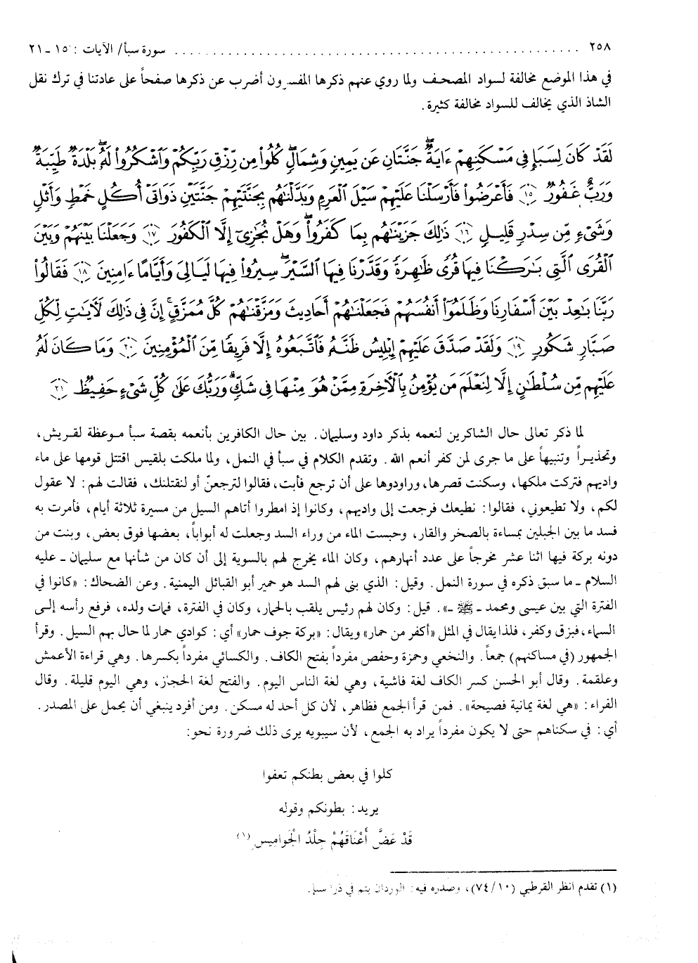 ( لَقَدْ كَانَ لِسَبَإٍ فِى مَسَاكِنِهِمْ جَنَّتَانِ عَن يَمِينٍ وَشِمَالٍ كُلُواْ مِن رّزْقِ رَبّكُمْ وَاشْكُرُواْ لَهُ بَلْدَةٌ بَلْدَةٌ طَيّبَةٌ وَرَبٌّ غَفُورٌ فَأَعْرَضُواْ فَأَرْسَلْنَا عَلَيْهِمْ سَيْلَ الْعَرِمِ وَبَدَّلْنَاهُمْ بِجَنَّاتِهِمْ جَنَّتَيْنِ ذَوَاتَىْ أُكُلٍ خَمْطٍ وَأَثْلٍ وَشَىْء مّن سِدْرٍ قَلِيلٍ ذَلِكَ جَزَيْنَاهُمْ بِمَا كَفَرُواْ وَهَلْ نُجْزِى إِلاَّ الْكَفُورَ وَجَعَلْنَا بَيْنَهُمْ وَبَيْنَ الْقُرَى الَّتِى بَارَكْنَا فِيهَا قُرًى ظَاهِرَةً وَقَدَّرْنَا فِيهَا السَّيْرَ سِيرُواْ فِيهَا لَيَالِىَ وَأَيَّاماً ءامِنِينَ فَقَالُواْ رَبَّنَا بَاعِدْ بَيْنَ أَسْفَارِنَا وَظَلَمُواْ أَنفُسَهُمْ فَجَعَلْنَاهُمْ أَحَادِيثَ وَمَزَّقْنَاهُمْ كُلَّ مُمَزَّقٍ إِنَّ فِى ذَلِكَ لاَيَاتٍ لّكُلّ صَبَّارٍ شَكُور ( سقط : ولقد صدق عليهم إبليس ظنه فاتبعوه إلا فريقا من المؤمنين ) وما كان له عليهم من سلطان إلا لنعلم من يؤمن بالآخرة ممن هو منها في شك وربك على كل شيء حفيظ ) ٍ ). لما ذكر تعالى حال الشاكرين لنعمه بذكر داود وسليمان ، بيّن حال الكافرين بأنعمه بقصة سبأ ، موعظة لقريش وتحذيراً وتنبيهاً على ما جرى لمن كفر أنعم الله ، وتقدم الكلام في سبأ في النمل . ولما ملكت بلقيس ، اقتتل قومها على ماء واديهم ، فتركت ملكها وسكنت قصرها ، وراودوها على أن ترجع فأبت فقالوا : لترجعنّ أو لنقتلنك ، فقالت لهم : لا عقول لكم ولا تطيعوني ، فقالوا : نطيعك ، فرجعت إلى واديهم ، وكانوا إذا مطروا ، أتاهم السيل من مسيرة ثلاثة أيام ، فأمرت به فسد ما بين الجبلين بمساءة بالصخر والقار ، وحبست الماء من وراء السد ، وجعلت له أبواباً بعضها فوق بعض ، وبنت من دونه بركة فيها اثنان عشر مخرجاً على عدد أنهارهم ، وكان الماء يخرج لهم بالسوية إلى أن كان من شأنها مع سليمان ، عليه السلام ، ما سبق ذكره في سورة النمل . وقيل : الذي بنى لهم السد هو حمير أبو القبائل اليمنية . وعن الضحاك : كانوا في الفترة التي بين عيسى ومحمد ( صلى الله عليه وسلم ) ) . قيل : وكان لهم رئيس يلقب بالحمار ، وكان في الفترة ، فمات ولده فرفع رأسه إلى السماء فبزق وكفر ، فلذا يقال في المثل : أكفر من حمار ، ويقال : بركة جوف حمار ، أي كوادي حمار ، لما حال بهم السيل .