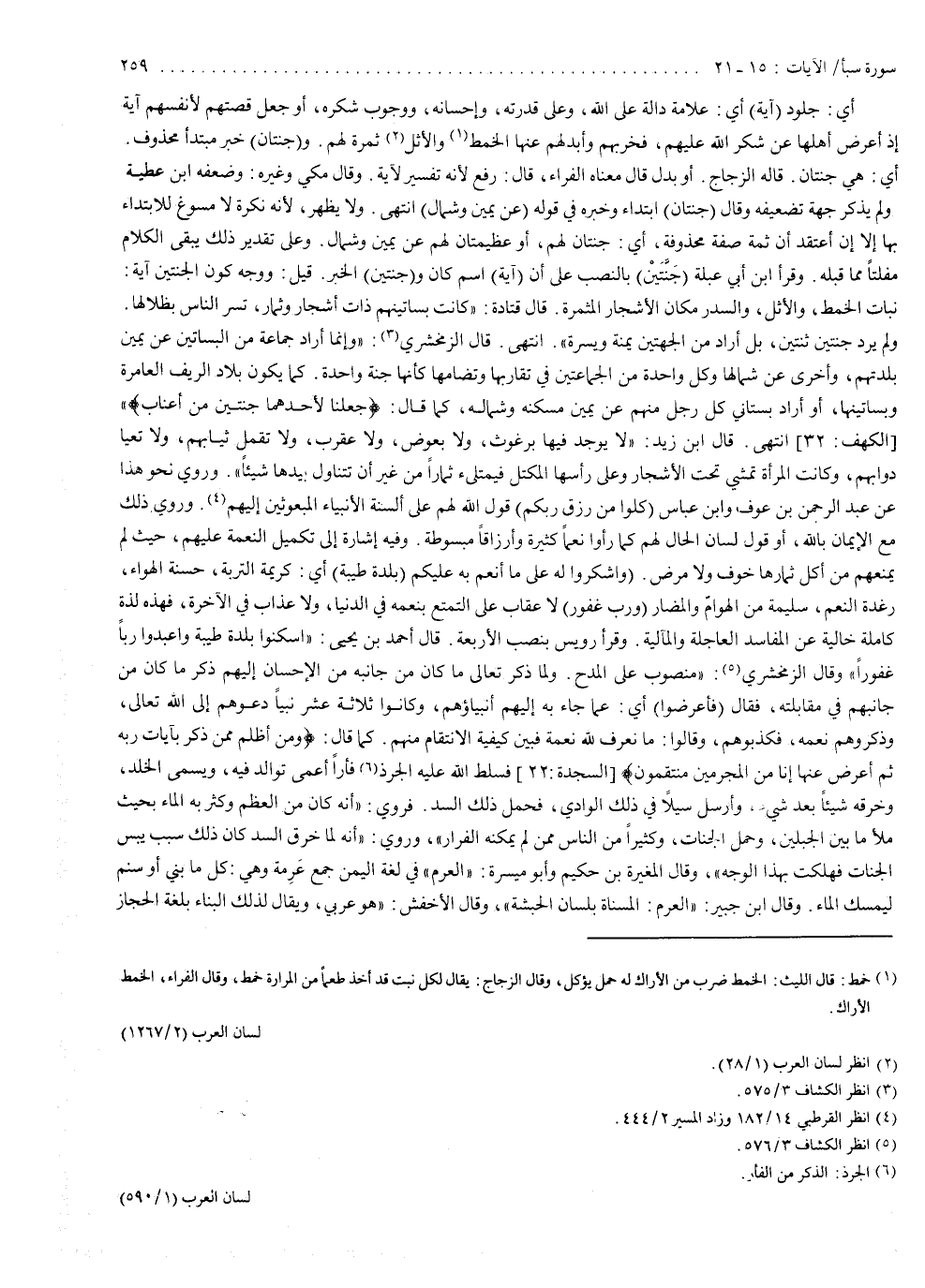 آية : أي علامة دالة على الله وعلى قدرته وإحسانه ووجوب شكره ، أو جعل قصتهم لأنفسهم آية ، إذ : أعرض أهلها عن شكر الله عليهم ، فخر بهم وأبدلهم عنها الخمط والإثل ثمرة لهم ؛ و ) جَنَّتَانِ ( : خبر مبتدأ محذوف ، أي هي جنتان ، قاله الزجاج ، أو بدل ، قال معناه الفراء ، قال : رفع لأنه تفسير لآية . وقال مكي وغيره ، وضعفه ابن عطية ، ولم يذكر جهة تضعيفه . وقال : ) جَنَّتَانِ ( ابتداء ، وخبره في قوله : ) عَن يَمِينٍ وَشِمَالٍ ). انتهى . ولا يظهر لأنه نكرة لا مسوغ للابتداء بها ، إلا إن اعتقد إن ثمة صفة محذوفة ، أي جنتان لهم ، أو عظيمتان لهم ) عَن يَمِينٍ وَشِمَالٍ ( ، وعلى تقدير ذلك يبقى الكلام مفلتاً مما قبله . وقرأ ابن أبي عبلة : جنتين بالنصب ، على أن آية اسم كان ، وجنتين الخبر . قيل : ووجه كون الجنتين آية نبات الخمط والإثل والسدر مكان الأشجار المثمرة . قال قتادة : كانت بساتينهم ذات أشجار وثمار تسر الناس بظلالها ، ولم يرد جنتين ثنتين ، بل أراد من الجهتين يمنة ويسرة . انتهى . قال الزمخشري : وإنما أراد جماعة من البساتين عن يمين بلدتهم ، وأخرى عن شمالها ، وكل واحدة من الجماعتين في تقاربها وتضامها كأنها جنة واحدة ، كما يكون بلاد الريف العامرة وبساتينها ، أو أراد بستاني كل رجل منهم عن يمين مسكنه وشماله ، كما قال : ) جَعَلْنَا لاِحَدِهِمَا جَنَّتَيْنِ مِنْ أَعْنَابٍ ). انتهى . قال ابن زيد : لا يوجد فيها برغوث ، ولا بعوض ، ولا عقرب ، ولا تقمل ثيابهم ، ولا تعيا دوابهم ؛ وكانت المرأة تمشي تحت الأشجار ، وعلى رأسها المكتل ، فيمتلىء ثماراً من غير أن تتناول بيدها شيئاً . وروي نحو هذا عن عبد الرحمن بن عوف وابن عباس .