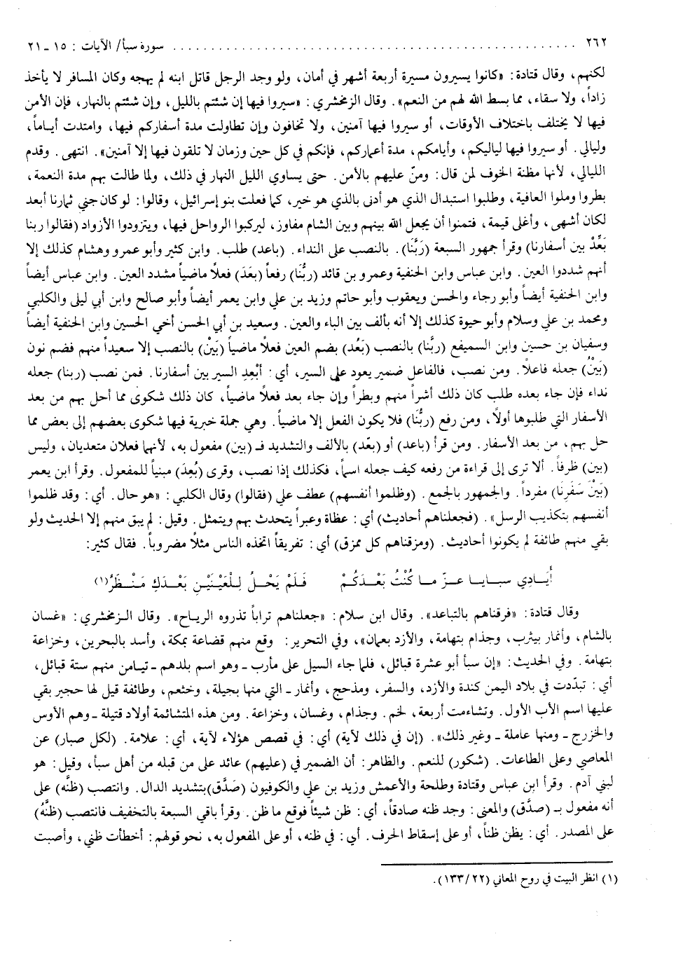 ولما طالت بهم مدة النعمة بطروا وملوا العافية ، وطلبوا استبدال الذي هو أدنى بالذي هو خير ، كما فعلت بنو إسرائيل ، وقالوا : لو كان جني ثمارنا أبعد لكان أشهى وأغلى قيمة ، فتمنوا أن يجعل الله بينهم وبين الشام مفاوز ليركبوا الرواحل فيها ويتزودوا الأزواد فقالوا : ) رَبَّنَا بَاعِدْ بَيْنَ أَسْفَارِنَا ). وقرأ جمهور السبعة : ربنا بالنصب على النداء ، باعد : طلب ؛ وابن كثير ، وأبو عمرو ، وهشام : كذلك ، إلا أنهم شددوا العين ؛ وابن عباس ، وابن الحنفية ، وعمرو بن فائد : ربنا رفعاً ، بعد فعلاً ماضياً مشدد العين ؛ وابن عباس أيضاً ، وابن الحنفية أيضاً ؛ وأبو رجاء ، والحسن ، ويعقوب ، وأبو حاتم ، وزيد بن علي ، وابن يعمر أيضاً ؛ وأبو صالح ، وابن أبي ليلى ، والكلبي ، ومحمد بن علي ، وسلام ، وأبو حيوة : كذلك ، إلا أنه بألف بين الباء والعين ؛ وسعيد بن أبي الحسن أخي الحسين ، وابن الحنفية أيضاً ، وسفيان بن حسين ، وابن السميفع : ربنا بالنصب ، بعد بضم العين فعلاً ماضياً بين بالنصب ، إلا سعيداً منهم ، فضم نون بين جعله فاعلاً ، ومن نصب ، فالفاعل ضمير يعود على السير ، أي أبعد السير بين أسفارنا ، فمن نصب ربنا جعله نداء ، فإن جاء بعده طلب كان ذلك أشراً منهم وبطراً وإن جاء بعد فعلاً ماضياً كان ذلك شكوى مما أحل بهم من بعد الأسفار التي طلبوها أولاً ، ومن رفع ربنا فلا يكون الفعل إلا ماضياً ، وهي جملة خبرية فيها شكوى بعضهم إلى بعض مما حل بهم من بعد الأسفار . ومن قرأ باعد ، أو بعد بالألف والتشديد ، فبين مفعول ، به لأنهما فعلان متعديان ، وليس بين ظرفاً . ألا ترى إلى قراءة من رفعه كيف جعله اسماً ؟ ) فَكَذَلِكَ ( إذا نصب وقرىء بعد مبنياً للمفعول . وقرأ ابن يعمر : بين سفرنا مفرداً ؛ والجمهور : بالجمع . ) وَظَلَمُواْ أَنفُسَهُمْ ( : عطف على ) فَقَالُواْ ). وقال الكلبي : هو حال ، أي وقد ظلموا أنفسهم بتكذيب الرسل . ) فَجَعَلْنَاهُمْ أَحَادِيثَ ( : أي عظاة وعبراً يتحدث بهم ويتمثل . وقيل : لم يبق منهم إلا الحديث ، ولو بقي منهم طائفة لم يكونوا أحاديث . ) وَمَزَّقْنَاهُمْ كُلَّ مُمَزَّقٍ ( : أي تفريفاً ، اتخذه الناس مثلاً مضروباً ، فقال كثير : أيادي سبايا عز ما كنت بعدكم