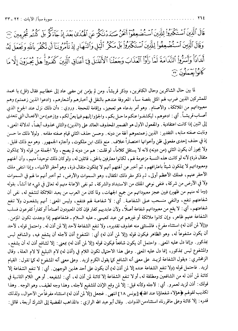 ولما كان من العرب من يعبد الملائكة لتشفع له ، نفى أن شفاعتهم تنفع ، والنفي منسحب على الشفاعة ، أي لا شفاعة لهم فتنفع ، وليس المعنى أنهم يشفعون ، ولا تنفع شفاعتهم ، أي لا يقع من معبوداتهم شفاعة أصلاً . ولأن عابديهم كفار ، فإن كان المعبودون أصناماً أو كفاراً ، كفرعون ، فسلب الشفاعة عنهم ظاهر ، وإن كانوا ملائكة أو غيرهم ممن عبد ، كعيسى عليه السلام ، فشفاعتهم إذا وجدت تكون لمؤمن . و ) إِلاَّ لِمَنْ أَذِنَ لَهُ ( : استثناء مفرغ ، فالمستثنى منه محذوف تقديره : ولا تنفع الشفاعة لأحد ) إِلاَّ لِمَنْ أَذِنَ لَهُ ). واحتمل قوله لأحد أن يكون مشفوعاً له ، وهو الظاهر ، فيكون قوله : ) إِلاَّ لِمَنْ أَذِنَ لَهُ ( ، أي المشفوع ، أذن لأجله أن يشفع فيه ؛ والشافع ليس بمذكور ، وإنما دل عليه المعنى . واحتمل أن يكون شافعاً ، فيكون قوله : ) إِلاَّ لِمَنْ أَذِنَ لَهُ ( بمعنى : إلا لشافع أذن له أن يشفع ، والمشفوع ليس بمذكور ، إنما دل عليه المعنى . وعلى هذا الاحتمال تكون اللام في ) أَذِنَ لَهُ ( لام التبليغ ، لا لام العلة . وقال الزمخشري : يقول : الشفاعة لزيد على معنى أنه الشافع ، كما يقول : الكرم لزيد ، وعلى معنى أنه المشفوع له ، كما تقول : القيام لزيد ، فاحتمل قوله : ) وَلاَ تَنفَعُ الشَّفَاعَةُ عِندَهُ إِلاَّ لِمَنْ أَذِنَ لَهُ ( أن يكون على أحد هذين الوجهين ، أي لا تنفع الشفاعة إلا كائنة لمن أذن له من الشافعين ومطلقة له ، أو لا تنفع الشافعة إلا كائنة لمن أذن له ، أي لشفيعه ، أو هي اللام الثانية في قولك : أذن لزيد لعمرو ، أي لأجله ، وكأنه قيل : إلا لمن وقع الإذن للشفيع لأجله ، وهذا وجه لطيف ، وهو الوجه ، وهذا تكذيب لقولهم : هؤلاء شفعاؤنا عند الله . انتهى . فجعل إلا لمن أذن له استثناء مفرغاً من الأحوال ، ولذلك قدره : إلا كائنة ، وعلى ما قررناه استثناء من الذوات .