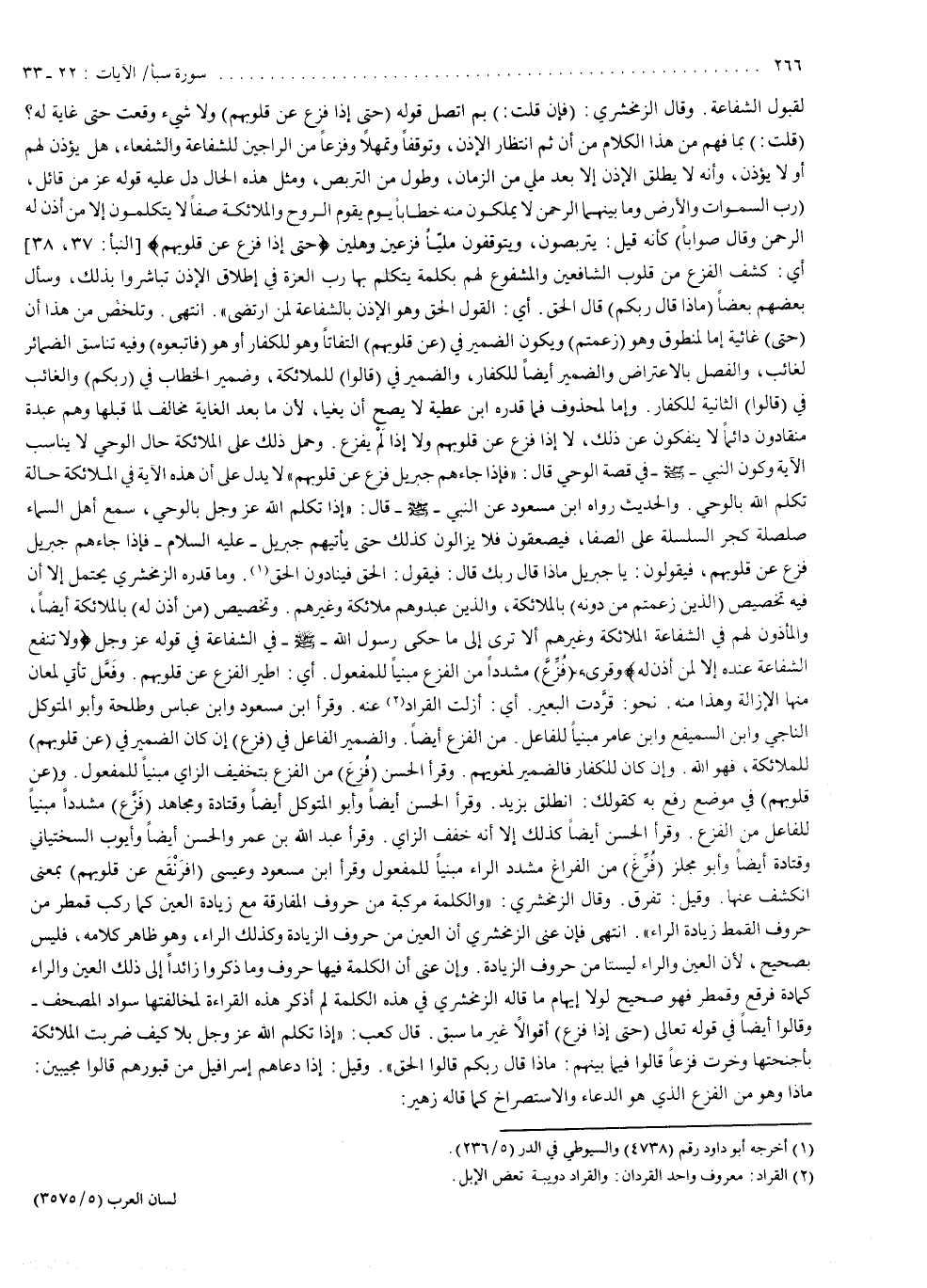 لقبول الشفاعة . وقال الزمخشري : فإن قلت بم اتصل قوله : ) حَتَّى إِذَا فُزّعَ عَن قُلُوبِهِمْ ( ؟ ولا شيء وقعت حتى غاية له . قلت : بما فهم من هذا الكلام من أن ثم انتظار الإذن وتوقفاً وتمهلاً وفزعاً من الراجين للشفاعة والشفعاء ، هل يؤذن لهم أو لا يؤذن ؟ وأنه لا يطلق الإذن إلا بعد ملي من الزمان وطول من التربص . ومثل هذه الحال دل عليه قوله ، عز من قائل : ) رَبّ السَّمَاوَاتِ وَالاْرْضَ وَمَا بَيْنَهُمَا الرَّحْمَنِ لاَ يَمْلِكُونَ مِنْهُ خِطَاباً يَوْمَ يَقُومُ الرُّوحُ وَالْمَلَائِكَةُ صَفّاً لاَّ يَتَكَلَّمُونَ إِلاَّ مَنْ أَذِنَ لَهُ الرَّحْمَنُ وَقَالَ صَوَاباً ( ، كأنه قيل : يتربصون ويتوقفون ملياً فزعين وهلين .