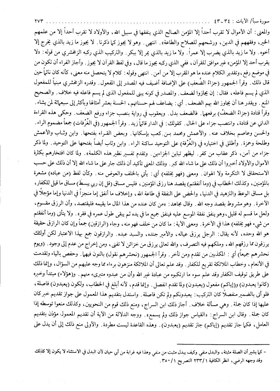 ( وَيَوْمَ يَحْشُرُهُمْ جَمِيعاً ( : أي المكذبين ، من تقدم ومن تأخر . وقرأ الجمهور : نحشرهم ، نقول بالنون فيهما ، وحفص بالياء ، وتقدمت في الأنعام وخطاب الملائكة تقريع للكفار ، وقد علم تعالى أن الملائكة منزهون برآء مما وجه عليهم من السؤال ، وإنما ذلك على طريق توقيف الكفار ، وقد علم سوء ما ارتبكوه من عبادة غير الله ، وأن من عبدوه متبرىء منهم . و ) هَؤُلاء ( مبتدأ و ، خبره ) كَانُواْ يَعْبُدُونَ ( ، و ) إِيَّاكُمْ ( مفعول ) يَعْبُدُونَ ). ولما تقدم انفصل ، وإنما قدم لأنه أبلغ في الخطاب ، ولكون ) يَعْبُدُونَ ( فاصلة . فلو أتى بالضمير منفصلاً ، كان التركيب يعبدونكم ، ولم تكن فاصلة . واستدل بتقديم هذا المعمول على جواز تقديم خبر كان عليها إذا كان جملة ، وهي مسألة خلاف ، أجاز ذلك ابن السراج ، ومنع ذلك قوم من النحويين ، وكذلك منعوا توسطه إذا كان جملة . وقال ابن السراج : القياس جواز ذلك ، ولم يسمع . ووجه الدلالة من الآية أن تقديم المعمول مؤذن بتقديم العامل ، فكما جاز تقديم ) إِيَّاكُمْ ( ، جاز تقديم ) يَعْبُدُونَ ( ، وهذه القاعدة ليست مطردة ، والأولى منع ذلك إلى أن يدل على