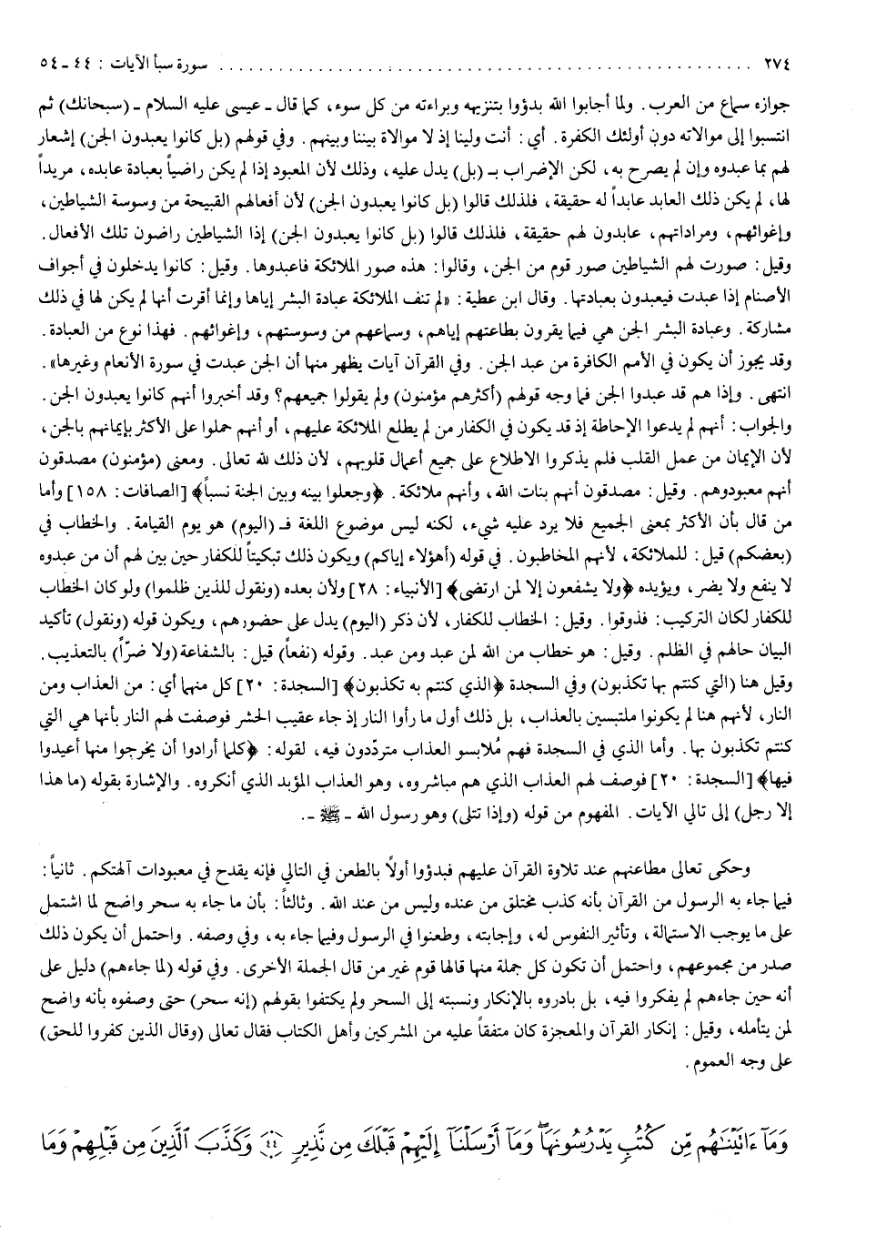 وفي قولهم : ) بَلْ كَانُواْ يَعْبُدُونَ الْجِنَّ ( ، إشعار لهم بما عبدوه ، وإن لم يصرح به . لكن الإضراب ببل يدل عليه وذلك لأن المعبود إذ لم يكن راضياً بعبادة عابده مريداً لها ، لم يكن ذلك العابد عابداً له حقيقة ، فلذلك قالوا : ) بَلْ كَانُواْ يَعْبُدُونَ الْجِنَّ ( ، لأن أفعالهم القبيحة من وسوسة الشياطين وإغوائهم ومراداتهم عابدون لهم حقيقة ، فلذلك قالوا : ) بَلْ كَانُواْ يَعْبُدُونَ الْجِنَّ ( ، إذ الشياطين راضون تلك الأفعال . وقيل : صورت لهم الشياطين صور قوم من الجن ، وقالوا : هذه صور الملائكة فاعبدوها . وقيل : كانوا يدخلون في أجواف الأصنام إذا عبدت ، فيعبدون بعبادتها . وقال ابن عطية : لم تنف الملائكة عبادة البشر اياها ، وإنما أقرت أنها لم يكن لها في ذلك مشاركة . وعبادة البشر الجن هي فيما يقرون بطاعتهم إياهم ، وسماعهم من وسوستهم واغوائهم ، فهذا نوع من العبادة . وقد يجوز أن يكون في الأمم الكافرة من عبد الجن ، وفي القرآن آيات يظهر منها أن الجن عبدت ، في سورة الأنعام وغيرها . انتهى . وإذا هم قد عبدوا الجن ، فما وجه قولهم : أكثرهم مؤمنون ، ولم يقولوا جميعهم ، وقد أخبروا أنهم كانوا يعبدون الجن ؟ والجواب أنهم لم يدعوا إلا حاطة ، إذ قد يكون في الكفارة من لم يطلع الملائكة عليهم ، أو أنهم حلموا على الأكثر بإيمانهم بالجن لأن الإيمان من عمل القلب ، فلم يذكروا الاطلاع على جميع أعمال قلوبهم ، لأن ذلك لله تعالى . ومعنى ) مُؤْمِنُونَ ( : مصدقون أنهم معبودوهم ، وقيل : مصدقون أنهم بنات الله ، وأنهم ملائكة ، ( وَجَعَلُواْ بَيْنَهُ وَبَيْنَ الْجِنَّةِ نَسَباً ). وأما من قال بأن الأكثر بمعنى الجميع ، فلا يرد عليه شيء ، لكنه ليس موضوع اللغة .