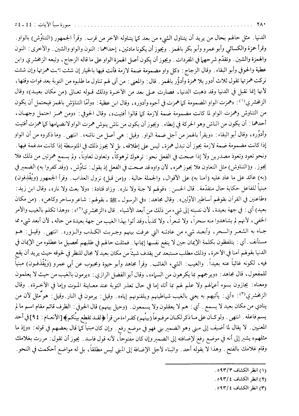 الدنيا . مثل حالهم بحال من يريد أن يتناول الشيء من بعد ، كما يتناوله الآخر من قرب . وقرأ الجمهور : التناوش بالواو . وقرأ حمزة ، والكسائي . وأبو عمرو ، وأبو بكر : بالهمز ، ويجوز أن يكونا مادتين ، إحداهما النون والواو والشين ، والأخرى والهمزة والشين ، وتقدّم شرحهما في المفردات . ويجوز أن يكون أصل الهمزة الواو ، على ما قاله الزجاج ، وتبعه الزمخشري وابن عطية والحوفي وأبو البقاء ، وقال الزجاج : كل واو مضمومة ضمة لازمة ، فأنت فيها بالخيار ، إن شئت تثبت همزتها ، وإن شئت تركت همزتها . تقول : ثلاث أدور بلا همز ، وأدؤر بالهمز . قال : والمعنى : من أنى لهم تناول ما طلبوه من التوبة بعد فوات وقتها ، لأنها إنما تقبل في الدنيا ، وقد ذهبت الدنيا فصارت على بعد من الآخرة ، وذلك قوله تعالى : ) مِن مَّكَانِ بَعِيدٍ ). وقال الزمخشري : همزت الواو المضمومة كما همزت في أجوه وأدور . وقال ابن عطية : وأمّا التناؤش بالهمز فيحتمل أن يكون من التناوش ، وهمزت الواو لما كانت مضمومة ضمة لازمة ، كما قالوا : أفتيت . وقال الحوفي : ومن همز احتمل وجهان : أحدهما : أن يكون من الناش ، وهو الحركة في إبطاء ، ويجوز أن يكون من ناش ينوش ، همزت الواو لانضمامها ، كما همزت افتيت وأدور . وقال أبو البقاء : ويقرأ بالهمز من أجل الواو ، وقيل : هي أصل من ناشه . انتهى . وما ذكروه من أن الواو إذا كانت مضمومة ضمة لازمة يجوز أن تبدل همزة ، ليس على إطلاقه ، بل لا يجوز ذلك في المتوسطة إذا كان مدغمة فيها ، ونحو يعود وتعوذ مصدرين ؛ ولا إذا صحت في الفعل نحو : ترهوك ترهوكاً ، وتعاون تعاوناً ، ولم يسمع همزتين من ذلك ، فلا يجوز . والتناوش مثل التعاون ، فلا يجوز همزه ، لأن واوه قد صحت في الفعل ، إذ يقول : تناوش .