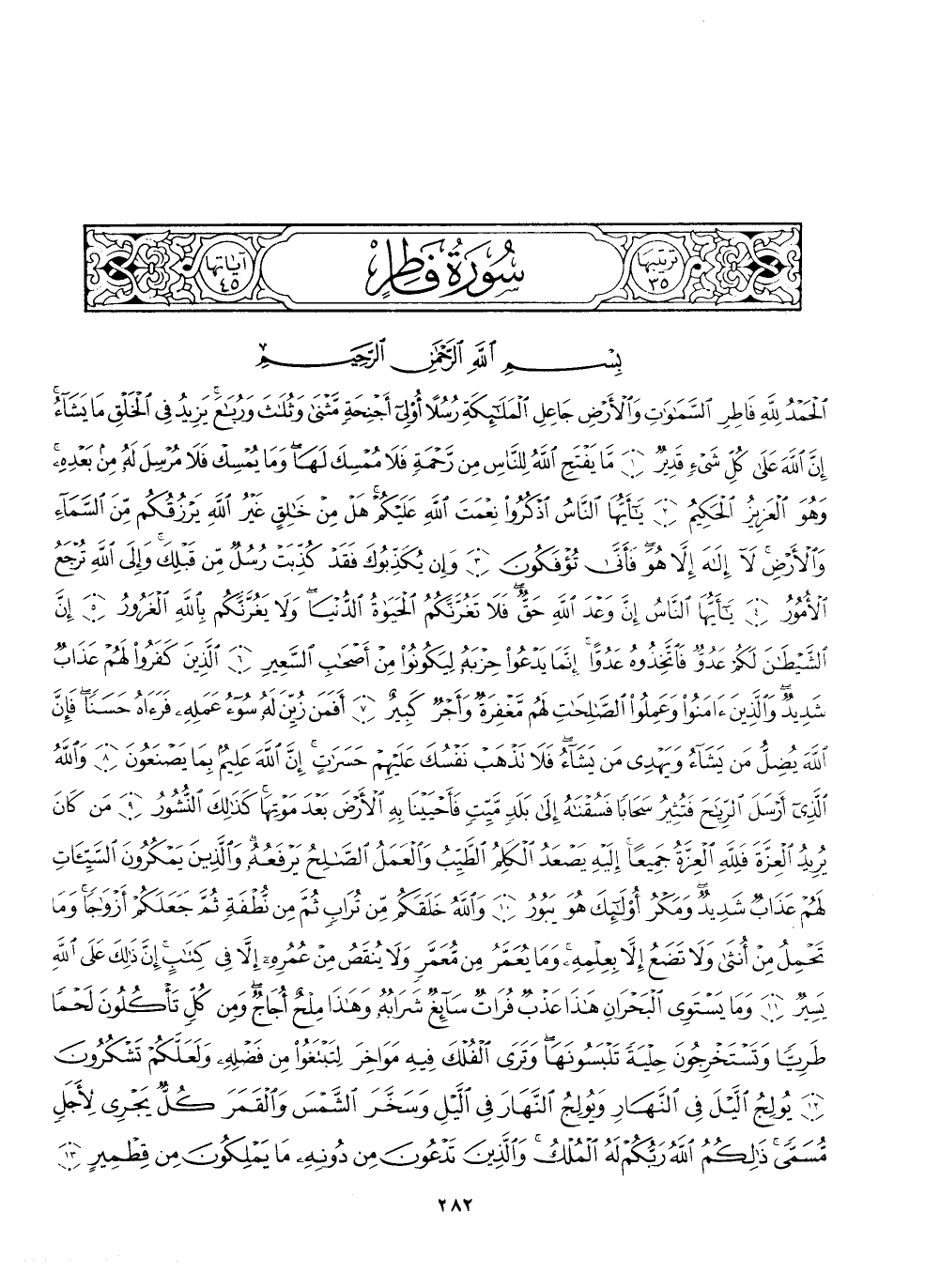 2 ( ) الْحَمْدُ للَّهِ فَاطِرِ السَّمَاوَاتِ وَالاٌّ رْضِ جَاعِلِ الْمَلَائِكَةِ رُسُلاً أُوْلِىأَجْنِحَةٍ مَّثْنَى وَثُلَاثَ وَرُبَاعَ يَزِيدُ فِى الْخَلْقِ مَا يَشَآءُ إِنَّ اللَّهَ عَلَى كُلِّ شَىْءٍ قَدِيرٌ مَّا يَفْتَحِ اللَّهُ لِلنَّاسِ مِن رَّحْمَةٍ فَلاَ مُمْسِكَ لَهَا وَمَا يُمْسِكْ فَلاَ مُرْسِلَ لَهُ مِن بَعْدِهِ وَهُوَ الْعَزِيزُ الْحَكِيمُ ياأَيُّهَا النَّاسُ اذْكُرُواْ نِعْمَةَ اللَّهِ عَلَيْكُمْ هَلْ مِنْ خَالِقٍ غَيْرُ اللَّهِ يَرْزُقُكُمْ مِّنَ السَّمَآءِ وَالاٌّ رْضِ لاَ إِلَاهَ إِلاَّ هُوَ فَأَنَّى تُؤْفَكُونَ وَإِن يُكَذِّبُوكَ فَقَدْ كُذِّبَتْ رُسُلٌ مِّن قَبْلِكَ وَإِلَى اللَّهِ تُرْجَعُ الاٍّ مُورُ ياأَيُّهَا النَّاسُ إِنَّ وَعْدَ اللَّهِ حَقٌّ فَلاَ تَغُرَّنَّكُمُ الْحَيَواةُ الدُّنْيَا وَلاَ يَغُرَّنَّكُمْ بِاللَّهِ الْغَرُورُ إِنَّ الشَّيْطَانَ لَكُمْ عَدُوٌّ فَاتَّخِذُوهُ عَدُوّاً إِنَّمَا يَدْعُو حِزْبَهُ لِيَكُونُواْ مِنْ أَصْحَابِ السَّعِيرِ الَّذِينَ كَفَرُواْ لَهُمْ عَذَابٌ شَدِيدٌ وَالَّذِينَ ءَامَنُواْ وَعَمِلُواْ الصَّالِحَاتِ لَهُم مَّغْفِرَةٌ وَأَجْرٌ كَبِيرٌ أَفَمَن زُيِّنَ لَهُ سُوءَ عَمَلِهِ فَرَءَاهُ حَسَناً فَإِنَّ اللَّهَ يُضِلُّ مَن يَشَآءُ وَيَهْدِى مَن يَشَآءُ فَلاَ تَذْهَبْ نَفْسُكَ عَلَيْهِمْ حَسَرَاتٍ إِنَّ اللَّهَ عَلِيمٌ بِمَا يَصْنَعُونَ وَاللَّهُ الَّذِىأَرْسَلَ الرِّيَاحَ فَتُثِيرُ سَحَاباً فَسُقْنَاهُ إِلَى بَلَدٍ مَّيِّتٍ فَأَحْيَيْنَا بِهِ الاٌّ رْضَ بَعْدَ مَوْتِهَا كَذَلِكَ النُّشُورُ مَن كَانَ يُرِيدُ الْعِزَّةَ فَلِلَّهِ الْعِزَّةُ جَمِيعاً إِلَيْهِ يَصْعَدُ الْكَلِمُ الطَّيِّبُ وَالْعَمَلُ الصَّالِحُ يَرْفَعُهُ وَالَّذِينَ يَمْكُرُونَ السَّيِّئَاتِ لَهُمْ عَذَابٌ شَدِيدٌ وَمَكْرُ أُوْلَائِكَ هُوَ يَبُورُ وَاللَّهُ خَلَقَكُمْ مِّن تُرَابٍ ثُمَّ مِن نُّطْفَةٍ ثُمَّ جَعَلَكُمْ أَزْوَاجاً وَمَا تَحْمِلُ مِنْ أُنْثَى وَلاَ تَضَعُ إِلاَّ بِعِلْمِهِ وَمَا يُعَمَّرُ مِن مُّعَمَّرٍ وَلاَ يُنقَصُ مِنْ عُمُرِهِ إِلاَّ فِى كِتَابٍ إِنَّ ذَلِكَ عَلَى اللَّهِ يَسِيرٌ وَمَا يَسْتَوِى الْبَحْرَانِ هَاذَا عَذْبٌ فُرَاتٌ سَآئِغٌ شَرَابُهُ وَهَاذَا مِلْحٌ أُجَاجٌ وَمِن كُلٍّ تَأْكُلُونَ لَحْماً طَرِيّاً وَتَسْتَخْرِجُونَ حِلْيَةً تَلْبَسُونَهَا وَتَرَى الْفُلْكَ فِيهِ مَوَاخِرَ لِتَبْتَغُواْ مِن فَضْلِهِ وَلَعَلَّكُمْ تَشْكُرُونَ يُولِجُ الَّيْلَ فِى النَّهَارِ وَيُولِجُ النَّهَارَ فِى الَّيْلِ وَسَخَّرَ الشَّمْسَ وَالْقَمَرَ كُلٌّ يَجْرِى لاًّجَلٍ مُّسَمًّى ذَلِكُمُ اللَّهُ رَبُّكُمْ لَهُ الْمُلْكُ وَالَّذِينَ تَدْعُونَ مِن دُونِهِ مَا يَمْلِكُونَ مِن قِطْمِيرٍ