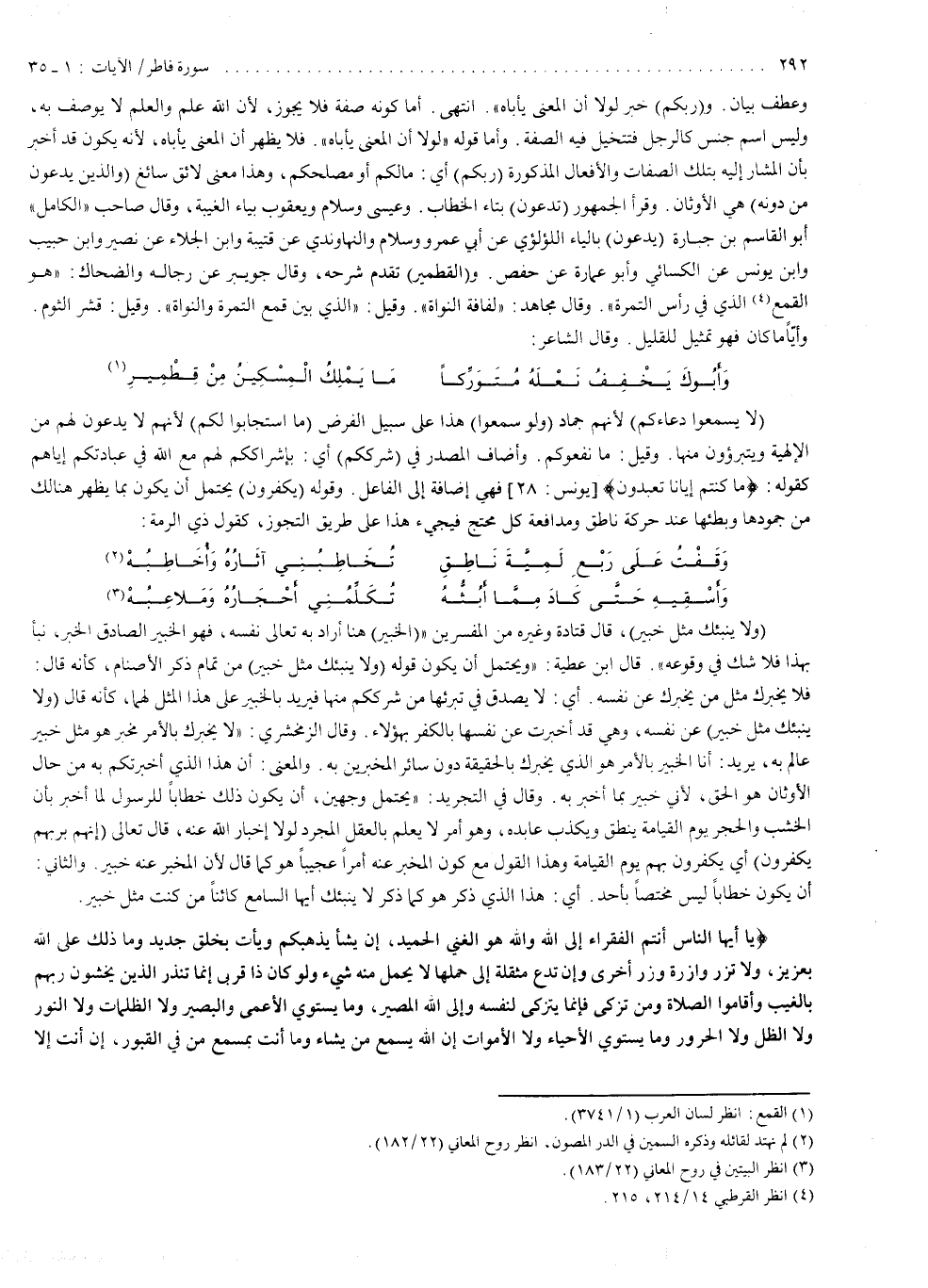 ( ياأَيُّهَا النَّاسُ أَنتُمُ الْفُقَرَاء إِلَى اللَّهِ وَاللَّهُ هُوَ الْغَنِىُّ الْحَمِيدُ إِن يَشَأْ يُذْهِبْكُمْ وَيَأْتِ بِخَلْقٍ جَدِيدٍ وَمَا ذَلِكَ عَلَى اللَّهِ بِعَزِيزٍ وَلاَ تَزِرُ وَازِرَةٌ وِزْرَ أُخْرَى وَإِن تَدْعُ مُثْقَلَةٌ إِلَى حِمْلِهَا لاَ يُحْمَلْ مِنْهُ شَىْء وَلَوْ كَانَ ذَا قُرْبَى إِنَّمَا ( سقط : الآية كاملة ) ) ).