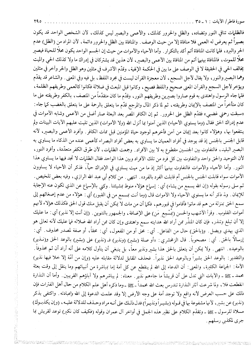 فالظلمات تنافي النور وتضاده ، والظل والحرور كذلك ، والأعمى والبصير ليس كذلك ، لأن الشخص الواحد قد يكون بصيراً . ثم يعرض له العمى ، فلا منافاة إلا من حيث الوصف . والمنافاة بين الظل والحرور دائمة ، لأن المراد من الظل عدم الحر والبرد ؛ فلما كانت المنافاة أتم ، أكد بالتكرار . وأما الأحياء والأموات من حيث أن الجسم الواحد يكون محلاً للحياة ، فيصير محلاً للموت . فالمنافاة بينهما أتم من المنافاة بين الأعمى والبصير ، لأن هذين قد يشتركان في إدراك مّا ، ولا كذلك الحي . والميت يخالف الحي في الحقيقة ، لا في الوصف ، على ما بين في الحكمة الإلهية . وقدّم الأشرف في مثلين ، وهو الظل والحر ؛ وآخر في مثلين ، وهما البصير والنور ، ولا يقال لأجل السجع ، لأن معجزة القرآن ليست في مجرد اللفظ ، بل فيه . وفي المعنى : والشاعر قد يقدّم ويؤخر لأجل السجع والقرآن . المعنى صحيح ، واللفظ فصيح ، وكانوا قبل المبعث في ضلالة ، فكانوا كالعمي ، وطريقهم الظلمة . فلما جاء الرسول ، واهتدى به قوم ، صاروا بصيرين ، وطريقهم النور ، وقدّم ما كان متقدّماً من المتصف بالكفر ، وطريقته على ما كان متأخراً من المتصف بالإيمان وطريقته . ثم لما ذكر المآل والمرجع ، قدّم ما يتعلق بالرحمة على ما يتعلق بالغضب ، كما جاء : سبقت رحمتي غضبي ، فقدّم الظل على الحرور .