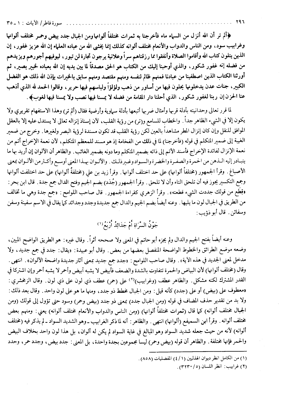 ) أَلَمْ تَرَ أَنَّ اللَّهَ أنَزَلَ مِنَ السَّمَاء مَاء فَأَخْرَجْنَا بِهِ ثَمَرَاتٍ مُّخْتَلِفاً أَلْوَانُهَا وَمِنَ الْجِبَالِ جُدَدٌ بِيضٌ وَحُمْرٌ مُّخْتَلِف ( سقط : الآية كاملة ) ٌ ).