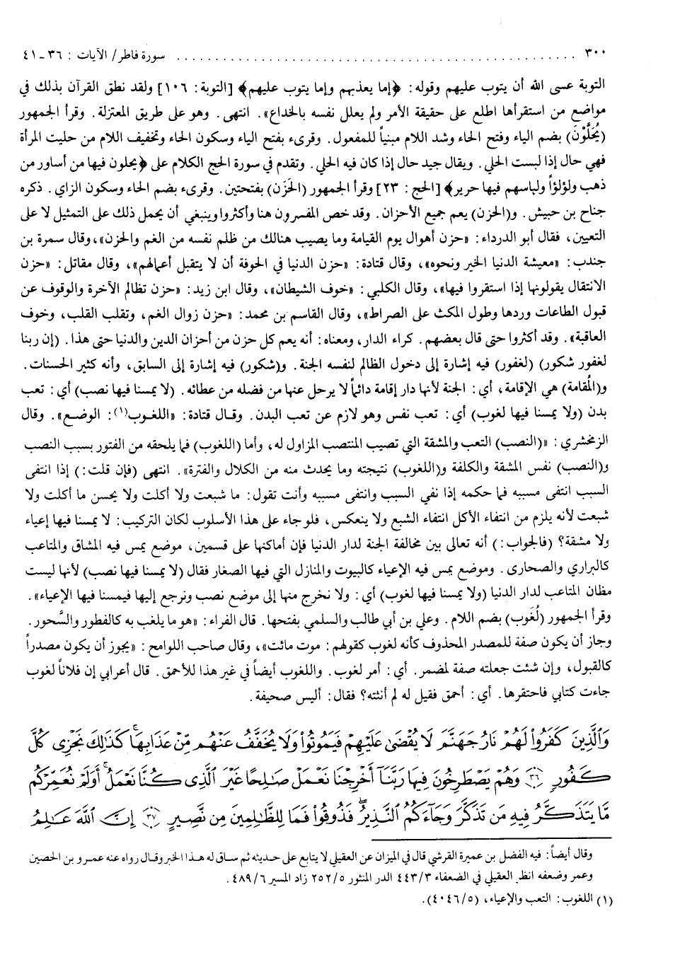 ) وَالَّذِينَ كَفَرُواْ لَهُمْ نَارُ جَهَنَّمَ لاَ يُقْضَى عَلَيْهِمْ فَيَمُوتُواْ وَلاَ يُخَفَّفُ عَنْهُمْ مّنْ عَذَابِهَا كَذَلِكَ نَجْزِى كُلَّ كَفُورٍ وَهُم ( سقط : الآية كاملة ) ْ ).