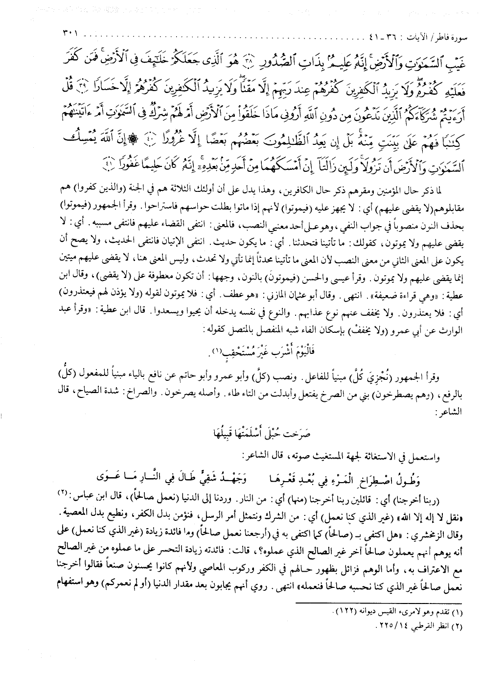 لما ذكر حال المؤمنين ومقرهم ، ذكر حال الكافرين ، وهذا يدل على أن أولئك الثلاثة هم في الجنة ، ( وَالَّذِينَ كَفَرُواْ ( هم مقابلوهم ، ( لاَ يُقْضَى عَلَيْهِمْ ( : أي لا يجهز عليهم فيموتوا ، لأنهم إذا ماتوا بطلت حواسهم فاستراحوا . وقرأ الجمهور : ) فَيَمُوتُواْ ( ، بحذف النون منصوباً في جواب النفي ، وهو على أحد معنيي النصب ؛ فالمعنى انتفى القضاء عليهم ، فانتفى مسببه ، أي لا يقضى عليهم ولا يموتون ، كقولك : ما تأتينا فتحدثنا ، أي ما يكون حديث ، انتفى الإتيان ، فانتفى الحديث . ولا يصح أن يكون على المعنى الثاني من معنى النصب ، لأن المعنى : ما تأتينا محدثاً ، إنما تأتي ولا تحدث ، وليس المعنى هنا : لا يقضى عليهم ميتين ، إنما يقضى عليهم ولا يموتون . وقرأ عيسى ، والحسن : فيموتون ، بالنون ، وجهها أن تكون معطوفة على لا يقضى . وقال ابن عطية : وهي قراءة ضعيفة . انتهى . وقال أبو عثمان المازين : هو عطف ، أي فلا يموتون ، لقوله : ) وَلاَ يُؤْذُونَ لَهُمْ فَيَعْتَذِرُونَ ( ، أي فلا يعتذرون ولا يخفف عنهم نوع عذابهم . والنوع في نفسه يدخله أن يحيوا ويسعدوا . قال ابن عطية : وقرأ عبد الوارث عن أبي عمرو : ولا يخفف بإسكان الفاء شبه المنفصل بالمتصل ، كقوله :