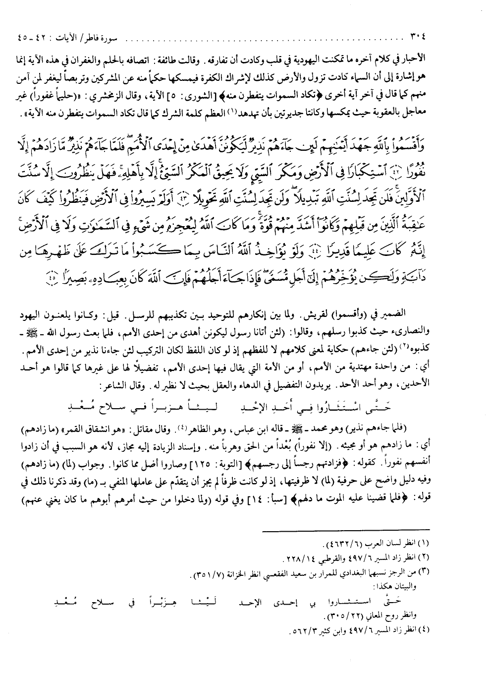 ) وَأَقْسَمُواْ بِاللَّهِ جَهْدَ أَيْمَانِهِمْ لَئِن جَاءهُمْ نَذِيرٌ لَّيَكُونُنَّ أَهْدَى مِنْ إِحْدَى الاْمَمِ فَلَمَّا جَاءهُمْ نَذِيرٌ مَّا زَادَهُمْ إِلاَّ نُفُورا ( سقط : الآية كاملة ) ً ).