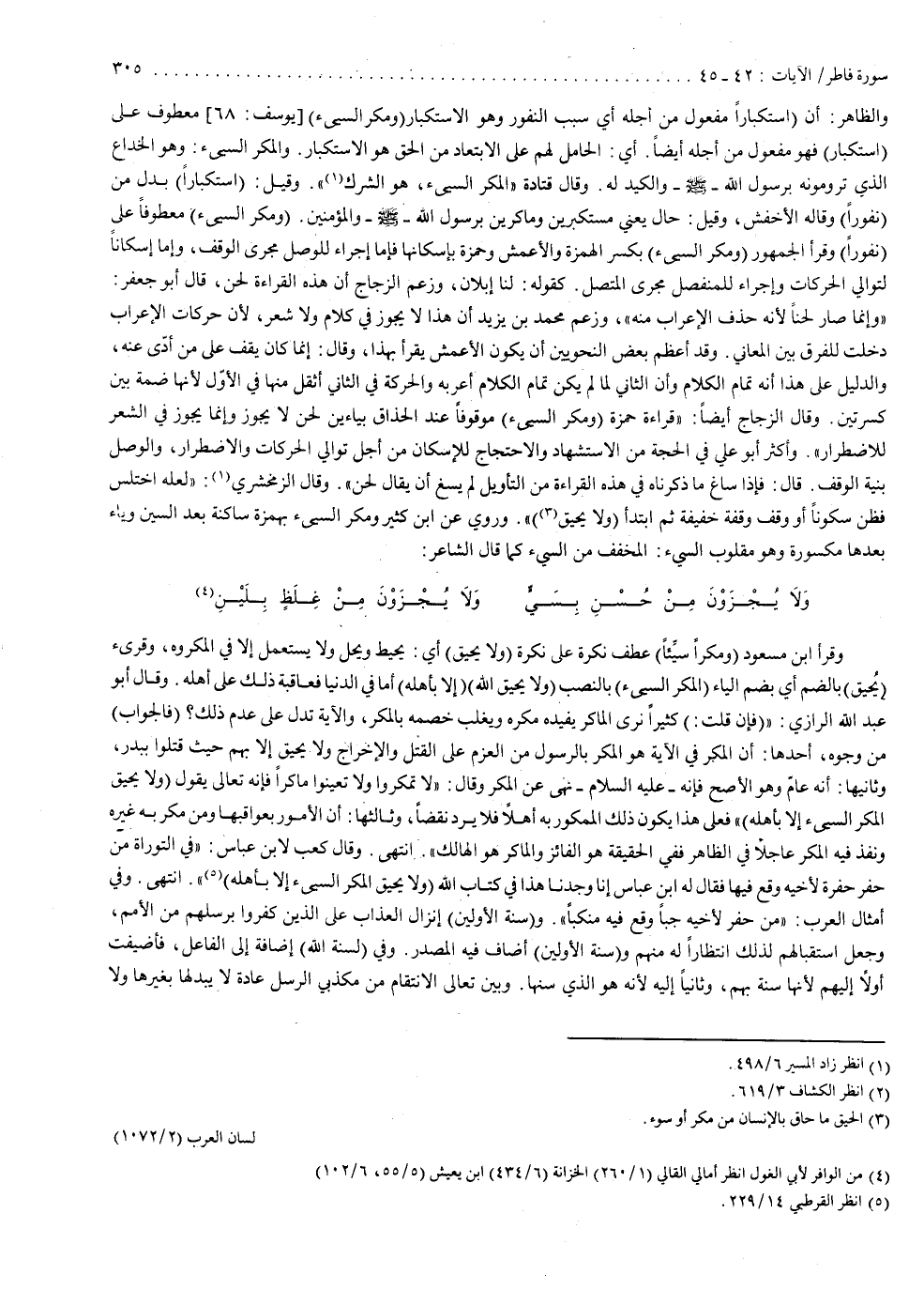والظاهر أن ) اسْتِكْبَاراً ( مفعول من أجله ، أيسبب النفور وهو الاستكبار ، ( وَمَكْرَ ( معطوف على ) وَاسْتَكْبَرُواْ اسْتِكْبَاراً ( ، فهو مفعول من أجله أيضاً ، أي الحامل لهم على الابتعاد من الحق هو الاستكبار ؛ ) والمكر السيء ( ، وهو الخداع الذي ترومونه برسول الله ( صلى الله عليه وسلم ) ) ، والكيد له . وقال قتادة : المكر السيء هو الشرك . وقيل : ) وَأَصَرُّواْ وَاسْتَكْبَرُواْ اسْتِكْبَاراً ( بدل من ) نُفُورًا ( ، وقاله الأخفش . وقيل : حال ، يعني مستكبرين وماكرين برسول الله ( صلى الله عليه وسلم ) ) والمؤمنين ، ومكر السيء من إضافة الموصوف إلى صفته ، ولذلك جاء على الأصل : ) وَلاَ يَحِيقُ الْمَكْرُ ). وقيل : يجوز أن يكون ) وَمَكْرَ ( معطوفاً على ) إِلاَّ نُفُورًا ). وقرأ الجمهور : ومكر السيء ، بكسر الهمزة ؛ والأعمش ، وحمزة : بإسكانها ، فإما إجراء للوصل مجرى الوقف ، وإما إسكاناً لتوالي الحركات وإجراء للمنفصل مجرى المتصل ، كقوله : لنا ابلان . وزعم الزجاج أن هذه القراءة لحن . قال أبو جعفر : وإنما صار لحناً لأنه حذف الإعراب منه . وزعم محمد بن يزيد أن هذا لا يجوز في كلام ولا شعر ، لأن حركات الإعراب دخلت للفرق بين المعاني ، وقد أعظم بعض النحويين أن يكون الأعمش يقرأ بهذا ، وقال : إنما كان يقف على من أدّى عنه ، والدليل على هذا أنه تمام الكلام ، وأن الثاني لما لم يكن تمام الكلام أعربه ، والحركة في الثاني أثقل منها في الأوّل لأنها ضمة بين كسرتين . وقال الزجاج أيضاً : قراءة حمزة ومكر السيء موقوفاً عند الحذاق بياءين لحن لا يجوز ، وإنما يجوز في الشعر للاضطرار . وأكثر أبو علي في الحجة من الاستشهاد ، والاحتجاج للإسكان من أجل توالي الحركات والاضطرار ، والوصل بنية الوقف ، قال : فإذا ساغ ما ذكرناه في هذه القراءة من التأويل ، لم يسغ أن يقال لحن . وقال ابن القشيري : ما ثبت بالاستفاضة أو التواتر أنه قرىء به فلا بد من جوازه ، ولا يجوز أن يقال لحن . وقال الزمخشري : لعله اختلس فظن سكوناً ، أو وقف وقفة خفيفة ، ثم ابتدأ ) وَلاَ يَحِيقُ ). وروي عن ابن كثير : ومكر السيء ، بهمزة ساكنة بعد السين وياء بعدها مكسورة ، وهو مقلوب السيء المخفف من السيء ، كما قال الشاعر : ولا يجزون من حسن بسي
