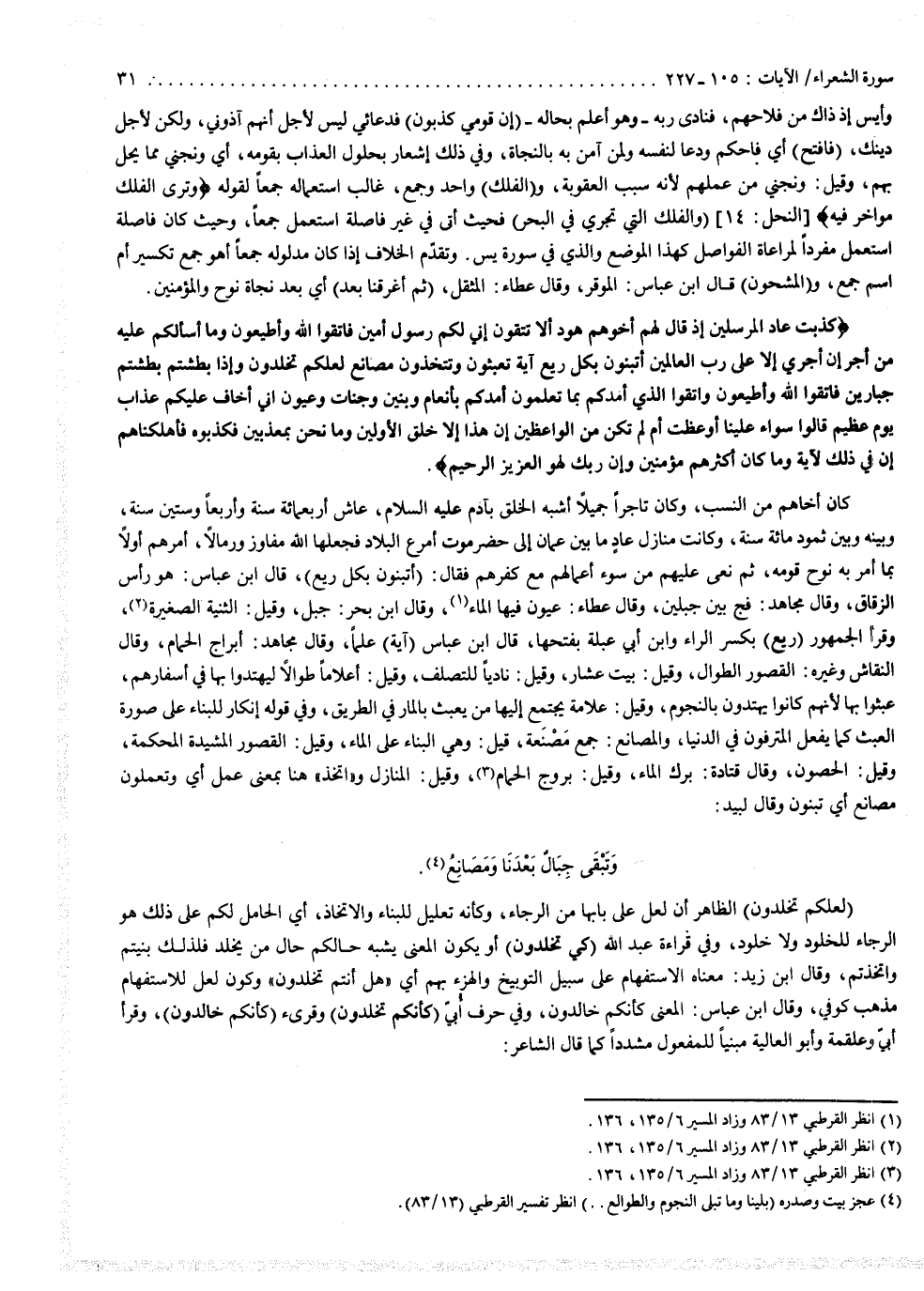 ) لَعَلَّكُمْ تَخْلُدُونَ ( : الظاهر أن لعل على بابها من الرجاء ، وكأنه تعليل للبناء والاتخاذ ، أي الحامل لكم على ذلك هو الرجاء للخلود ولا خلود . وفي قراءة عبد الله : كي تخلدون ، أو يكون المعنى يشبه حالكم حال من يخلد ، فلذلك بتيتم واتخذتم . وقال ابن زيد : معناه الاستفهام على سبيل التوبيخ والهزء بهم ، أي هل أنتم تخلدون : وكون لعل للاستفهام مذهب كوفي . وقال ابن عباس : المعنى كأنكم خالدون ، وفي حرف أبي : كأنكم تخلدون . وقرىء : كأنكم خالدون . وقرأ أبيّ ، وعلقمة ، وأبو العالية ، مبنياً للمفعول مشدداً ، كما قال الشاعر :