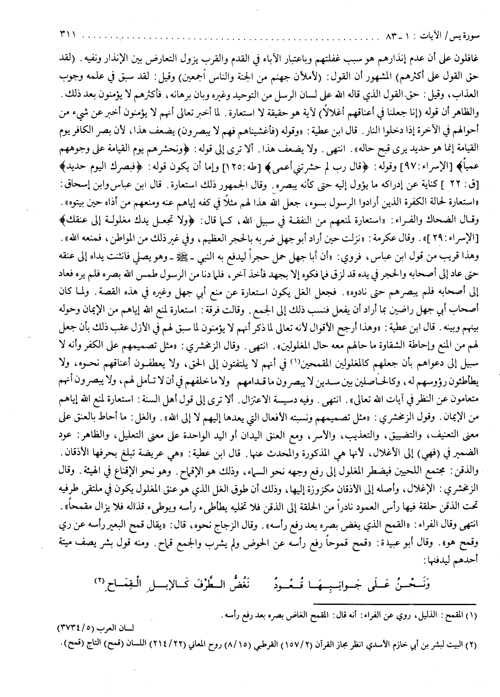 غافلون على أن عدم إنذارهم هو سبب غفلتهم وباعتبار الآباء في القدم والقرب يزول التعارض بين الإنذار ونفيه . ( لقد حق القول على أكثرهم ) المشهور أن القول : ( لأملأن جهنم من الجنة والناس أجمعين ) وقيل : لقد سبق في علمه وجوب العذاب ، وقيل : حق . القول الذي قاله الله على لسان الرسل من التوحيد وغيره وبان برهانه ، فأكثرهم لا يؤمنون بعد ذلك . والظاهر أن قوله ) غنا دجعلنا في أعناقهم أغلالا ( لآية هو حقيقة لا استعارة . لما أخبر تعالى أنهم لا يؤمنون أخبر عن شيء من أحوالهم في الآخرة إذا دخلوا النار . قال ابن عطية : ' وقوله ) فأغشيناهم فهم لا يبصرون ( يضعف هذا ، لأن بصر الكافر يوم القيامة إنما هو حديد يرى قبح حاله ' . انتهى . ولا يضعف هذا . ألا ترى إلى قوله : ) ونحشرهم يوم القيامة على وجوههم عميا ( [ الإسراء : 97 ] ووقوله : ) قال رب لم حشرتني أعمى ( [ طه : 125 ] وإما أن يكون قوله : ) فبصرك اليوم حديد ( [ ق : 22 ] كناية عن إدراكه ما يؤول إليه حتى كأنه يبصره . وقال الجمهور ذلك استعارة . قال ابن عباس وابن إسحاق : ' استعارة لحالة الكفرة الذين أرادوا الرسول بسوء ، جعل الله هذا لهم مثلا في كفه إياهم عنه ومنعهم من أذاه حين بيتوه ' وقال الضحاك والفراء : ' استعارة لمنعهم من النفقة في سبيل الله ، كما قال : ) ولا تجعل يدك مغلولة إلى عنقك ( [ الإسراء : 29 ] . وقال عكرمة : ' نزلت حين أراد أبو جهل ضربه بالحجر العظيم ، وفي غير ذلك من المواطن ، فمنعه الله ' وهذا قريب من ابن عباس ، فروي : ' أن أبا جهل حمل حجرا ليدفع به النبي ( صلى الله عليه وسلم ) وهو يصلي فانثنت يداه إلى عنقه حتى عاد إلى أصحابه والحجر في يده قد لزق فما فكوه إلا بجهد فأخذ آخر ، فلما دنا الرسول طمس الله بصره فلم يره فعاد إلى أصحابه فلم يبصرهم حتى نادوه ' . فجعل الغل يكون استعارة عن منع أبي جهل وغيره في هذه القصة . ولما كان أصحاب أبي جهل راضين بما أراد أن يفعل فنسب ذلك إلى الجمع . وقالت فرقة : استعارة لمنع الله إياهم من الإيمان وحوله بينهم وبينه . قال ابن عطية : ' وهذا أرجح الأقوال لأنه تعالى لما ذكر أنهم يؤمنون لما سبق لهم في الأزل عقب ذلك بأن جعل لهم من منع وإحاطة الشقاوة ما حالهم معه حال المغلولين ' . انتهى . وقال الزمخشري : ' مثل تصميمهم على الكفر وأنه لا سبيل إلى دعواهم بأن جعلهم كالمغلولين المقمحين في أنهم لا يلتفتون إلى الحق ، ولا يعطفون أعناقهم نحوه ، ولا يطأطئون رؤوسهم له ، وكالحاصلين بين سدين لا يبصرون ما قدامهم ولا خلفهم في أن لا تأمل لهم ، ولا يبصرون أنهم متعامون عن النظر في آيات الله تعالى ' . انتهى . وفيه دسيسة الاعتزال . ألا ترى إلى قول أهل السنة : استعارة لمنع الله إياهم من الإيمان . وقول الزمخشري : ' ومثل تصميمهم ونسبته الأفعال التي يعدها إليهم لا إلى الله ' . والغل : ما أحاط بالعنق على معنى التعنيف ، والتضييق ، والتعذيب ، والأسر ، ومع العنق اليدان أو اليد الواحدة على معنى التعليل ، والظاهر : عود الضمير في ( فهي ) إلى الأغلال ، لأنها هي المذكورة والمحدث عنها . قال ابن عطية : ' هي عريضة تبلغ بحرفها الأذقان . والذقن : مجتمع اللحيين فيضطر المغلول إلى رفع وجهه نحو السماء ، وذلك هو الإقماح . وهو نحو الإقناع في الهيئة . وقال الزمخشري : الإغلال ، وأصله إلى الأذقان مكروزة إليها ، وذلك أن طوق الغل الذي هو عنق المغلول يكون في ملتقى طرفية تحت الذقن حلقة فيها رأس العمود نادرا من الحلقة إلى الذقن فلا تخليه يطأطىء رأسه ويوطىء رأسه ويوطىء فداله فلا يزال مقمحا ' . انتهى وقال الفراء : ' القمح الذي يغض بصره بعد رفع رأسه ' . وقال الزجاج نحوه ، قال : ' يقال قمح البعير رأسه عن ري وقمح هو ' . وقال أبو عبيدة : ' قمح قموحا رفع رأسه عن الحوض ولم يشرب والجمع قماح . ومنه قول بشر يصف ميتة أحدهم ليدفنها : ونحن على جوانبها قعود