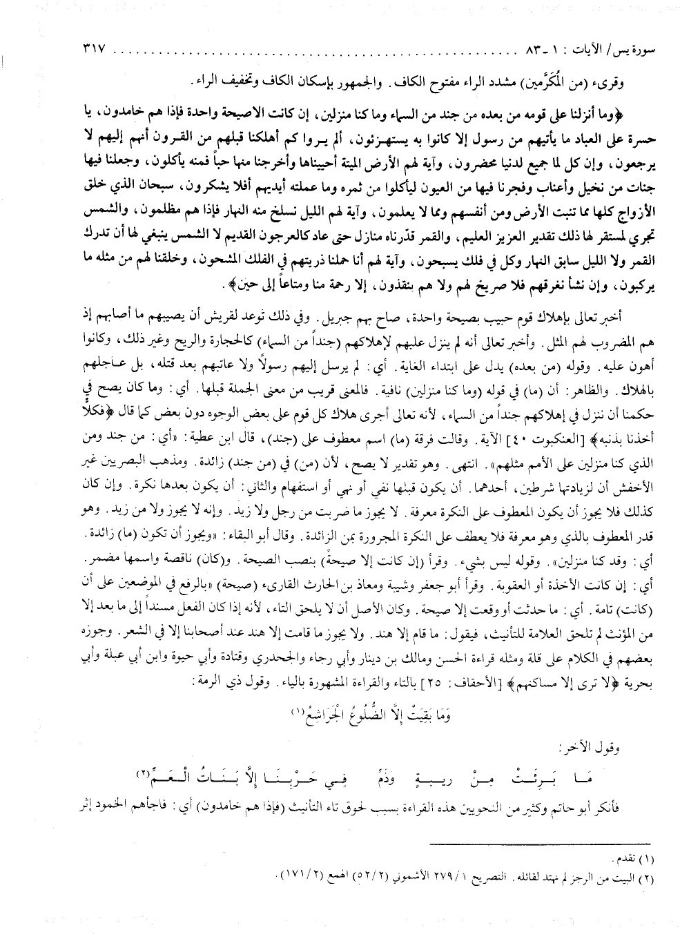 أخبر تعالى بإهلاك قوم حبيب بصيحة واحدة ، صاح بهم جبريل . وفي ذلك توعد لقريش أن يصيبهم ما أصابهم إذ هم المضروب لهم المثل . وأخبر تعالى أنه ينزل عليهم لإهلاكهم ( جندا من السماء ) كالحجارة والريح وغير ذلك ، وكانوا أهون عليه . وقوله ( من بعده ) يدل على ابتداء الغاية . أي : لم يرسل إليهم رسولا ولا عاتبهم بعد قتله ، بل عاجلهم بالهلاك . والظاهر : أن ( ما ) في قوله ( وما كنا منزلين ) نافية . فالمعنى قريب من معنى الجملة قبلها . أي : وما كان يصح في حكمنا أن ننزل في إهلاكهم جندا من السماء ، لأنه تعالى أجرى هلاك كل قوم على بعض الوجوه دون بعض كما قال ) فكلا أخذنا بذنبه ( [ العنكبوت 40 ] الآية . وقالت فرقت ( ما ) اسم معطوف على ( جند ) ، قال ابن عطية : ' أي : من جند ومن الذي منا منزلين على الأمم مثلهم ' . انتهى . وهو تقدير لا يصح ، لأن ( من ) في ( من جندد ) زائدة . ومذهب البصريين غير الأخفش أن لزيادتها شرطين ، أحدهما . أن يكون قبلها نفي أو نهي أو استفهام والثاني : أن يكون بعدها نكرة . وإن كان كذلك فلا يجوز أن يكون المعطوف على النكرة معرفة . لا يجوز ما ضربت من رجل ولا زيد . وإنه لا يجوز ولا من زيد . وهو . قدر المعطوف بالذي وهو معرفة فلا يعطف على النكرة المرورة بمن الزائدة . وقال أبو البقاء : ' ويجوز أن تكون ( ما ) زائدة . أي وقد كنا منزلين ' . وقوله ليس بشيء . وقرأ ( إن كانت إلا صيحة ) بنصب الصيحة . و ( كان ) ناقصة واسمها مضمر . أي : أن كانت الأخذة أو العقوبة . وقرأ أبو جعفر وشيبة ومعاذ بن الحارث القارىء ( صيحة ) ' بالرفع في الموضعين على أن ( كانت تامة . أي : ما حدثت أو وقعت إلا صيحة . وكان الأصل لا يلحق التاء ، لأنه إذا كان الفعل مسندا إلى ما بععد إلا من المؤنث لم تلحق العلامة للتأنيث ، فيقول : ما قام إلا هند . ولا يجوز ما قامت إلا هند عند أصحابنا إلا في الشعر . وجوزه بعضهم في الكلام على قلة ومثله قراءة الحسن ومالك بن دينار وأبي رجاء والجحدري وقتادة وأبي حيوة وابن أبي عبلة وأبي بحرية ) لا ترى غلا مساكنهم ( [ الأحقاف : 25 ] بالتاء والقراءة المشهورة بالياء . وقول ذي الرمة : وما بقيت إلا الضلوع الجراشع