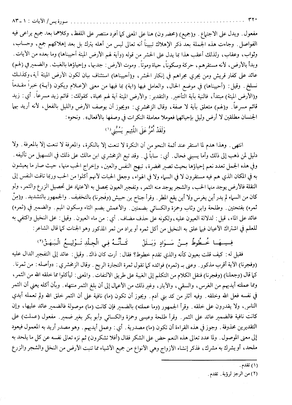 مفعول ويدل على الاجتماع . و ( جميع ) ( محضرون ) هنا على المعنى كما أفرد منتصر على اللفظ ، وكلاهما بعد جميع يراعى فيه الفواصل . وجاءت هذه الجملة بعد ذكر للإهلاك تبيينا أنه تعالى ليس من أهله يترك بل بعد إهلاكهم جمع ، وحساب ، وثواب ، وعقاب ، ولذلك أعقب هذا بما يدل على الحشر من قوله ( وآية لهم الأرض الميتة أحييناها ) وما بعده من الآيات . وبدأ بالأرض ، لأنه مستقرهم ، حركة وسكونا ، حياة وموتا . وموت الأرض : جدبها ، وإحياؤها بالغيث . والضمير في ( لهم ) عائد على كفار قريش ومن يجري مجراهم في إنكار الحشر ، و ( أحييناهم ) استئناف بيان لكون الأرض الميتة آية ، وكذلك نسلخ . وقيل : ( أحييناها ) في موضع الحال ، والعامل فيها ( آية ) بما فيها من معنى الإعلام ويكون ( آية ) خبرا مقدما و ( الأرض الميتة ) مبتدأ ، فالنية بآية التأخير . والتقدير : والأرض الميتة آية لهم محياة ، كقولك : قائم زيد مسرعا . أي : زيد قائم مسرعا . و ( لهم ) متعلق بآية لا صفة ، وقال الزمخشري : ' ويجوز أن يوصف الأرض والليل بالفعل ، لأنه أريد بهما الجنسان مطلقين لا أرض وليل بإحيائهما فعوملا معاملة النكرات في وصفها بالأفعال ' . ونحوه : ولقد أمر على اللئيم يسبني