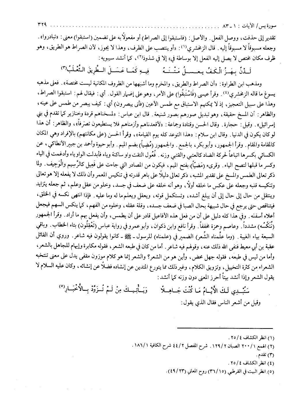 ومذهب بن الطراوة : ' أن الصراط والطريق ، والمخرم وما أشبهها من الظروف المكانية ليست مختصة ' . فعلى مذهبه يسوغ ما قاله الزمخشري . وقرأ عيسى ( فاستبقوا ) على الأمر ، وهو على إضمار القول . أي : فيقال لهم : استبقوا الصراط وهذا على سبيل التعجيز ، إذا لا يمكنهم الاستباق مع طمس الأعين ( فإنى يبصرون ) أي : كيف يبصر من طمس على عينه ، والظاهر : أن المسخ حقيقة ، وهو تبديل صورهم شنيعة . قال ابن عباس : ' لمسخناهم قردة وخنازير كما تقدم في بني إسرائيل ' . وقيل : حجارة . وقال الحسن وقتادة وجماعة : ' لأقعدناهم وأزمناهم فلا يستطعيون تصرفا ' ، والظاهر : أن هذا لو كان يكون في الدنيا . وقال ابن سلام : ' هذا التوعد كله يوم القيامة ' ، وقرأ الحسن ( على مكانتهم ) بالإفراد وهي المكان كالمقامة والمقام . وقرأ الجمهور ، وأبو بكر ، بالجمع . والجمهور ( مضيا ) بضم الميم . وأبو حيوة وأحمد بن جبير الأنطاكي ، عن الكسائي بكسرها اتباعا لحركة الضااد كالعتبي والقتبي وزنه . فعول التقت واو ساكنة وياء فأبدلت الواو ياء وأدغمت في الياء وكسر ما قبلها لتصح الياء . وقرىء ( مضيا ) بفتح الميم ، فيكون من المصادر التي جاءت على فعيل كالرسيم والوجيف . ولما ذكر تعالى الطمس والمسخ على تقدير المشبه ، ذكر تعالى دليلا على باهر قدرته في تنكيس المعمر وأن ذلك لا يفعله إلا هو تعالى وتنكيسه قلبه وجعله على عكس ما خلقه أولا ، وهو أنه خلقه على ضعف في جسد ، وخلو من عقل وعلم ، ثم جعله يتزايد وينتقل من حال إلى حال أن يبلغ أشده ، وتستكمل قوته ، ويعقل ويعلم ما له وما عليه . فإذا انتهى نكسه في الخلق ، فيتناقص حتى يرجع في حال شبيهة بحال الصبا في ضعف جسده ، وقلة عقله ، وخلو من الفهم ، كما ينكس السهم فيجعل أعلاه أسفله . وفي هذا كله دليل على ان من فعل هذه الأفاعيل قادر على أن يطمس ، وأن يفعل بهم ما أراد . وقرأ الجمهور ( ننكسه ) مشددا . وعاصم وحمزة مخففا . وقرأ نافع وابن ذكوان ، وأبو عمرو في رواية عباس ( تعقلون ) بتاء الخطاب . وباقي السبعة بياء الغيبة . ( وما علمناه الشعر ) الضمير في ( علمناه ) للرسول - ( صلى الله عليه وسلم ) - كانوا يقولون فيه شاعر . وروي أن القائل عقبة بن أبي معيط فنفى الله ضلك عنه ، وقولهم فيه شاعر . أما من كان في طبعه الشعر ، فقوله مكابرة وإيهام للجاهل بالشعر وأما من ليس في طبعه ، فقوله جهل محض ، وأين هو من الشعر ؟ والشعر إنما هو كلام موزون مقفي يدل على معنى تنتخبه الشعراء من كثرة التخييل ، وتزويق الكلام ، وغير ذلك مما يتورع المتدين عن إنشاده فضلا عن إنشائه ، وكان عليه السلام لا يقول الشعر وإذا أنشد بيتا أحرز المعنى دون وزنه كما أنشد : ستبدي بلك الأيام ما كنت جاهلا