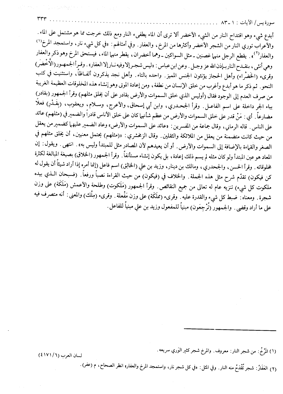 أبدع شيء وهو اقتداح النار من الشيء الأخضر ألا ترى أن الماء يطفىء النار ومع ذلك خرجت مما هو مشتمل على الماء . والأعراب توري النار من الشجر الأخضر وأكثرها من المرخ ، والعفار . وفي أمثالهم : ' في كل شيء نار ، واستمجد المرخ والعفار ' . يقطع الرجل منهما غصنين - مثل السواكين - وهما أخضران ، يقطر منهما الماء ، فيستحق المرخ وهو ذكر والعفار وهي أنثي ، ينقدح النار بإذن الله عز وجل . وعن ابن عباس : ' ليس شجر إلا وفيه نار إلا العفار ' . وقرأ الجمهور ( الأخضر ) وقرىء ( الخضراء ) وأهل الحجاز يؤنثون الجنس المميز واحده بالتاء . وأهل نجد يذكرون ألفاظا ، واستثنيت في كتب النحو . ثم ذكر ما هو أبدع وأغرب من خلق الأنسان من نطفة ، ومن غعادة الموتى وهو إنشاء هذه المخلوقات العظيمة الغريبة من صرف عدم العدم إلى الوجود فقال ( أوليس الذي خلق السموات والأرض بقادر على أن يخلق مثلهم ) وقرأ الجمهور ( بقادر ) بباء الجر داخله على اسم الفاعل . وقرأ الجحدري ، وابن أبي إسحاق ، والأعرج ، وسلام ، ويعقوب ، ( بقدر ) فعلا مضارعا . أي : من قدر على خلق السموات والأرض من عظم شأنهما كان على خلق الأناس قادرا والضمير في ( مثلهم ) عائد على الناس . قاله الرماني ، وقال جماعة من المفسرين : ' عائد على السموات والأرض ' وعاد الضمير عليهما كضمير من يعقل من حيث كانت متضمنه من يعقل من الملائكة والثقلين . وقال الزمخشري : ' مثلهم ' يحتمل معنيين ، أن يخلق مثلهم في الصغر والقماءة بالإضافة إلى السموات والأرض . أو أن يعيدهم لأن المصادر مثل للمبتدأ وليس به ' . انتهى . ويقول : إن المعاد هو عين المبتدأ ولو كان مثله لم يسم ذلك إعادة ، بل يكون إنشاء مستأنفا . وقرأ الجمهور ( الخلاق ) بصيغة المبالغة لكثرة مخلوقاته . وقرأ الحسن ، والجحدري ، ومالك بن دينار ، وزيد بن علي ( الخالق ) اسم فاعل ( إنما أمره إذا أراد شيئا أن يقول له كن فيكون ) تقدم شرح مثل هذه الجملة . والخلاف في ( فيكون ) من حيث القراءة نصبا ورفعا . ( فسبحان الذي بيده ملكوت كل شيء ) تنزيه عام له تعالى من جميع النقائص . وقرأ الجمهور ( ملكوت ) وطلحة والأعمش ( ملكه ) على وزن شجرة . ومعناه : ضبط كل شيء والقدرة عليه . وقرىء ( مملكة ) على وزن مفعلة . وقرىء ( ملك ) والمعنى : أنه متصرف فيه على ما أراد وقضى . والجمهور ( ترجعون ) مبنيا للمفعول وزيد بن علي مبنيا للمفعول للفاعل .