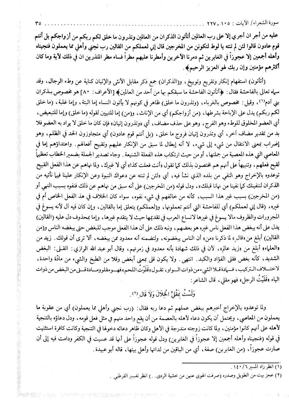 عَلَيْهِ مِنْ أَجْرٍ إِنْ أَجْرِىَ إِلاَّ عَلَى رَبّ الْعَالَمِينَ أَتَأْتُونَ الذُّكْرَانَ مِنَ الْعَالَمِينَ وَتَذَرُونَ مَا خَلَقَ لَكُمْ رَبُّكُمْ مّنْ أَزْواجِكُمْ بَلْ أَنتُمْ قَوْمٌ عَادُونَ قَالُواْ لَئِن لَّمْ تَنتَهِ يالُوطُ لُوطٍ لَتَكُونَنَّ مِنَ الْمُخْرَجِينَ قَالَ إِنّى لِعَمَلِكُمْ مّنَ الْقَالِينَ رَبّ نَّجِنِى وَأَهْلِى مِمَّا يَعْمَلُونَ فَنَجَّيْنَاهُ وَأَهْلَهُ أَجْمَعِينَ إِلاَّ عَجُوزاً فِى الْغَابِرِينَ ثُمَّ دَمَّرْنَا الاْخَرِينَ وَأَمْطَرْنَا عَلَيْهِم مَّطَراً فَسَاء مَطَرُ الْمُنذَرِينَ إِنَّ فِي ذَلِكَ لايَةً وَمَا كَانَ أَكْثَرُهُمْ مُّؤْمِنِينَ وَإِنَّ رَبَّكَ لَهُوَ الْعَزِيزُ الرَّحِيمُ ).