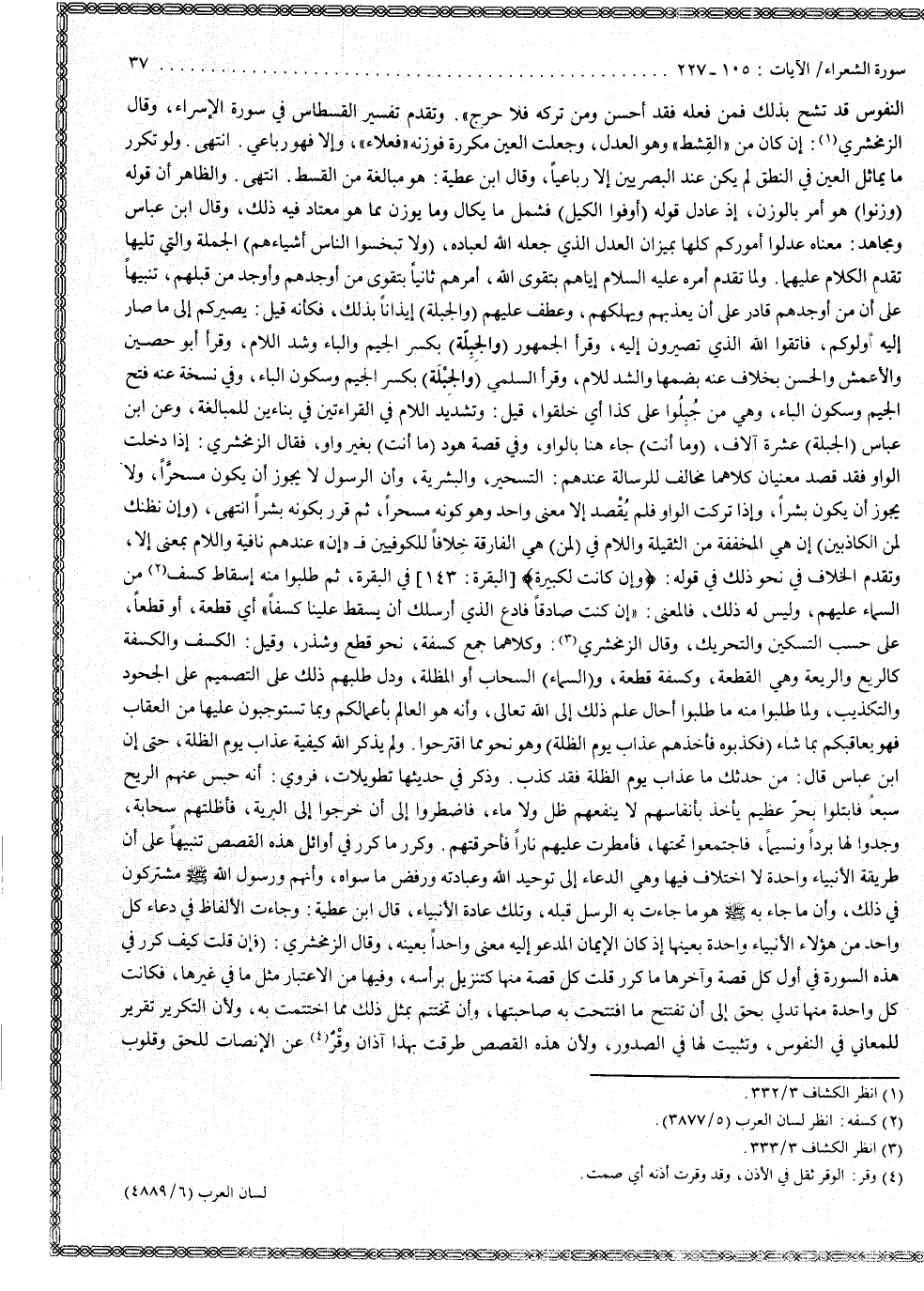 ( وَلاَ تَبْخَسُواْ النَّاسَ أَشْيَاءهُمْ ( : الجملة والتي تليها تقدم الكلام عليهما . ولما تقدم أمره عليه السلام إياهم بتقوى الله ، أمرهم ثانياً بتقوى من أوجدهم وأوجد من قبلهم ، تنبيهاً على أن من أوجدهم قادر على أن يعذبهم ويهلكهم . وعطف عليهم ) وَالْجِبِلَّةَ ( إيذاناً بذلك ، فكأنه قيل : يصيركم إلى ما صار إليه أولوكم ، فاتقوا الله الذي تصيرون إليه . وقرأ الجمهور : والجبلة بكسر الجيم والباء وشد اللام . وقرأ أبو حصين ، والأعمش ، والحسن : بخلاف عنه ، بضمها والشد للام . وقرأ السلمي : والجبلة ، بكسر الجيم وسكون الباء ، وفي نسخة عنه : فتح الجيم وسكون الباء ، وهي من جبلوا على كذا ، أي خلقوا . قيل : وتشديد اللام في القراءتين في بناءين للمبالغة . وعن ابن عباس : الجبلة : عشرة آلاف . ) وَمَا أَنتَ ( : جاء هنا بالواو ، وفي قصة هود : ) مَا أَنتَ ( ، بغير واو . فقال الزمخشري : إذا دخلت الواو فقد قصد معنيان ، كلاهما مخالف للرسالة عندهم ، التسخير والبشرية ، وأن الرسول لا يجوز أن يكون مسحراً ، ولا يجوز أن يكون بشراً ، وإذا تركت الواو فلم يقصد إلا معنى واحد ، وهو كونه مسحراً ، ثم قرر بكونه بشراً . انتهى .