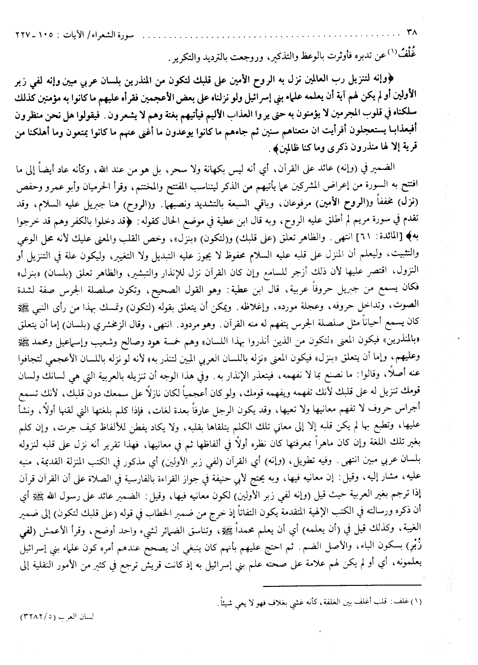( وَإِنَّهُ لَتَنزِيلُ رَبّ الْعَالَمِينَ نَزَلَ بِهِ الرُّوحُ الاْمِينُ عَلَى قَلْبِكَ لِتَكُونَ مِنَ الْمُنْذِرِينَ بِلِسَانٍ عَرَبِىّ مُّبِينٍ وَإِنَّهُ لَفِى زُبُرِ الاْوَّلِينَ أَوَ لَمْ يَكُن لَّهُمْ ءايَةً أَن يَعْلَمَهُ عُلَمَاء بَنِى إِسْراءيلَ وَلَوْ نَزَّلْنَاهُ عَلَى بَعْضِ الاْعْجَمِينَ فَقَرَأَهُ عَلَيْهِم مَّا كَانُوا بِهِ مُؤْمِنِينَ كَذَلِكَ سَلَكْنَاهُ فِي قُلُوبِ الْمُجْرِمِينَ لاَ يُؤْمِنُونَ بِهِ حَتَّى يَرَوُاْ الْعَذَابَ الاْلِيمَ فَيَأْتِيَهُم بَغْتَةً وَهُمْ لاَ يَشْعُرُونَ فَيَقُولُواْ هَلْ نَحْنُ مُنظَرُونَ أَفَبِعَذَابِنَا يَسْتَعْجِلُونَ أَفَرَأَيْتَ إِن مَّتَّعْنَاهُمْ سِنِينَ ثُمَّ جَاءهُم مَّا كَانُواْ يُوعَدُونَ مَا أَغْنَى عَنْهُمْ مَّا كَانُواْ يُمَتَّعُونَ وَمَا أَهْلَكْنَا مِن قَرْيَةٍ إِلاَّ لَهَا مُنذِرُونَ ذِكْرَى وَمَا كُنَّا ظَالِمِينَ ).