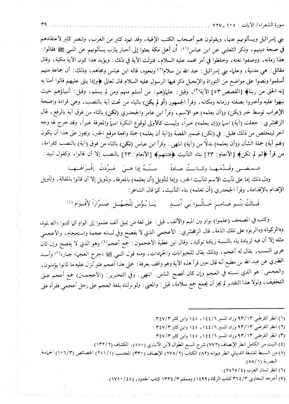 ( مَعِىَ بَنِى إِسْراءيلَ ( : عبد الله بن سلام ونحوه ، قاله ابن عباس ومجاهد ، وذلك أن جماعة منهم أسلموا ونصوا على مواضع من التوراة والإنجيل ذكر فيها الرسول عليه السلام ، قال تعالى : ) وَإِذَا يُتْلَى عَلَيْهِمْ قَالُواْ ءامَنَّا بِهِ إِنَّهُ الْحَقُّ مِن رَّبّنَا ( الآية . وقيل : علماؤهم من أسلم منهم ومن لم يسلم . وقيل : أنبياؤهم ، حيث نبهوا عليه وأخبروا بصفته وزمانه ومكانة . وقرأ الجمهور : ) أَوَ لَمْ يَكُن ( ، بالياء من تحت ، ( ءايَةً ( : بالنصب ، وهي قراءة واضحة الإعراب توسط خبر يكن ، و ) أَن يَعْلَمَهُ ( : هو الاسم . وقرأ ابن عامر ، والجحدري : تكن بالتاء من فوق ، آية : بالرفع . قال الزمخشري : جعلت آية اسماً ، وأن يعلمه خبراً ، وليست كالأولى لوقوع النكرة اسماً والمعرفة خبراً ، وقد خرج لها وجه آخر ليتخلص من ذلك فقيل : في تكن ضمير القصة ، وآية أن يعلمه جملة واقعة الخبر ، ويجوز على هذا أن يكون لهم آية جملة الشأن ، وأن يعلمه بدلاً من آية . انتهى . وقرأ ابن عباس : تكن بالتاء من فوق ، آية بالنصب ، كقراءة من قرأ : ثم ) لَمْ تَكُنْ ( ، بتاء التأنيث ، ( فِتْنَتُهُمْ ( بالنصب ، إلا أن قالوا ، وكقول لبيد : فمضى وقدمها وكانت عادة
