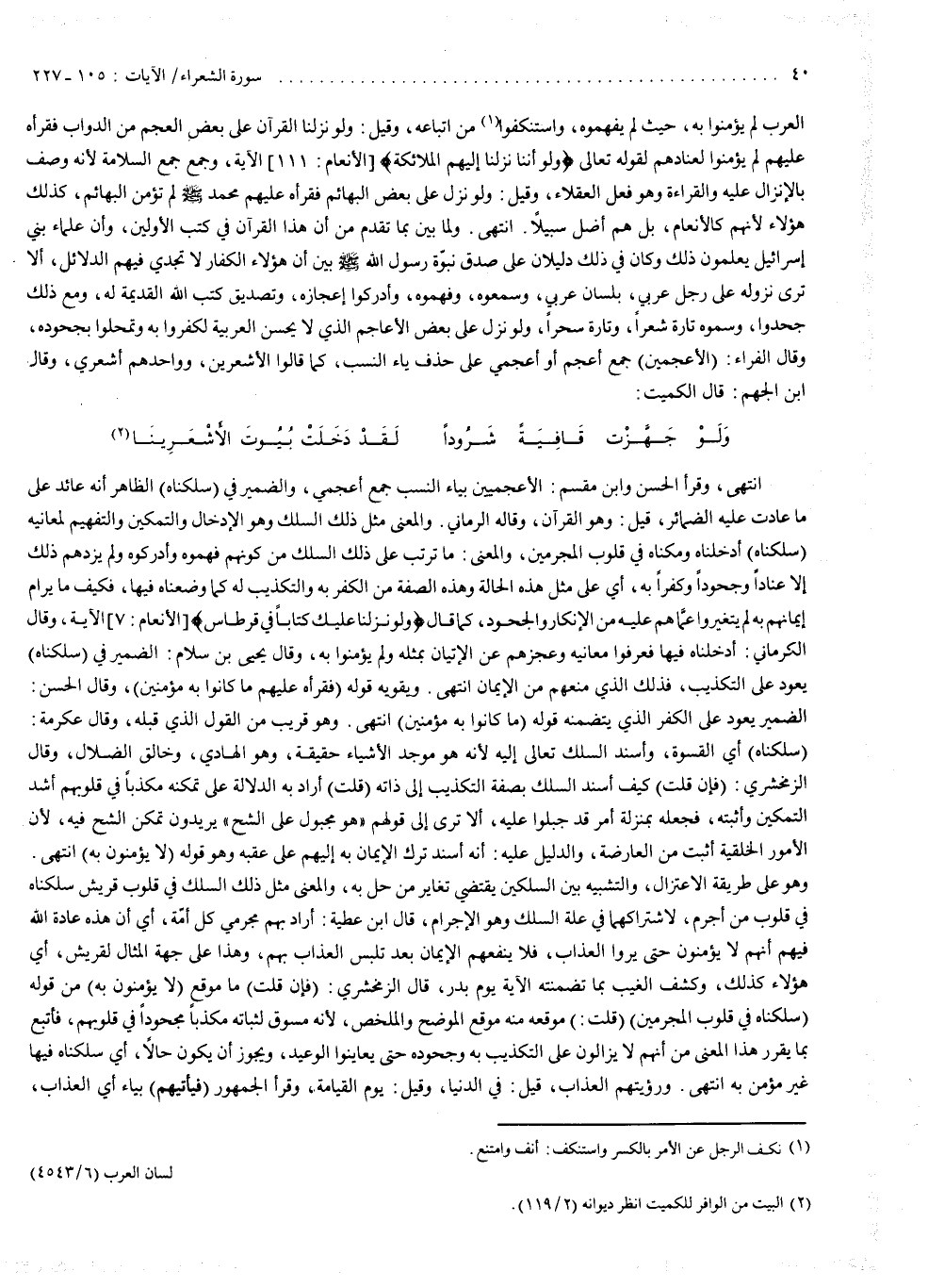 انتهى . وقرأ الحسن ، وابن مقسم : الأعجمين ، بياء النسب : جمع أعجمي . والضمير في ) سَلَكْنَاهُ ( ، الظاهر أنه عائد على ما عادت عليه الضمائر . قيل : وهو القرآن ، وقاله الرماني . والمعنى : مثل ذلك السلك ، وهو الإدخال والتمكين والتفهيم لمعانيه . ) سَلَكْنَاهُ ( : أدخلناه ومكناه في ) قُلُوبِ الْمُجْرِمِينَ ). والمعنى : ما ترتب على ذلك السلك من كونهم فهموه وأدركوه ، ولم يزدهم ذلك إلا عناداً وجحوداً وكفرا به ، أي على مثل هذه الحالة وهذه الصفة من الكفر به والتكديب له ، كما وضعناه فيها . فكيف ما يرام إيمانهم به لم يتغير ؟ وأعماهم عليه من الإنكار والجحود ، كما قال : ) وَلَوْ نَزَّلْنَا عَلَيْكَ كِتَاباً فِى قِرْطَاسٍ ( الآية . وقال الكرماني : أدخلناه فيها ، فعرفوا معانيه ، وعجزهم عن الأتيان الإيمان بمثله ، ولم يؤمنوا به . وقال يحيى بن سلام : الضمير في سلكناه يعود على التكذيب ، فذلك الذي منعهم من الإيمان . انتهى . ويقويه قوله : ) فَقَرَأَهُ عَلَيْهِم مَّا كَانُوا بِهِ مُؤْمِنِينَ ). وقال الحسن : الضمير يعود على الكفر الذي يتضمنه قوله : ) مَّا كَانُوا بِهِ مُؤْمِنِينَ ). انتهى . وهو قريب من القول الذي قبله . وقال عكرمة : سلكناه ، أي القسوة ، وأسند السلك تعالى إليه ، لأنه هو موجد الأشياء حقيقة ، وهو الهادي وخالق الضلال .