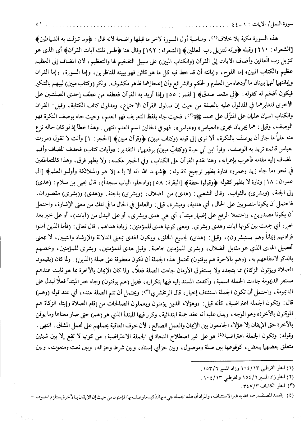هذه السورة مكية بلا خلاف . ومناسبة أول السورة لآخر ما قبلها واضحة ، لأنه قال : ) وَمَا تَنَزَّلَتْ بِهِ الشَّيَاطِينُ ( ، وقبله : ) وَإِنَّهُ لَتَنزِيلُ رَبّ الْعَالَمِينَ ( ، وقال هنا : ) طس تِلْكَ ءايَاتُ الْقُرْءانِ ( : أي الذي هو تنزيل رب العالمين . وأضاف الآيات إلى القرآن والكتاب المبين على سبيل التفخيم لها والتعظيم ، لأن المضاف إلى العظيم عظيم . والكتاب المبين ، إما اللوح ، وإبانته أن قد خط فيه كل ما هو كائن فهو يبينه للناظرين ، وإما السورة ، وإما القرآن ، وإبانتهما أنهما يبينان ما أودعاه من العلوم والحكم والشرائع . وأن إعجازهما ظاهر مكشوف ونكر . ) وَكِتَابٌ مُّبِينٌ ( ، ليبهم بالتنكير ، فيكون أفخم له كقوله : ) فِى مَقْعَدِ صِدْقٍ ). وإذا أريد به القرآن ، فعطفه من عطف إحدى الصفتين على الأخرى ، لتغايرهما في المدلول عليه بالصفة ، من حيث أن مدلول القرآن الاجتماع ، ومدلول كتاب الكتابة . وقيل : القرآن والكتاب اسمان علمان على المنزل على محمد ( صلى الله عليه وسلم ) ) ، فحيث جاء بلفظ التعريف ، فهو العلم ، وحيث جاء بوصف النكرة ، فهو الوصف ، وقيل : هما يجريان مجرى العباس ، وعباس فهو في الحالين اسم العلم . انتهى . وهذا خطأ ، إذ لو كان حاله نزع منه علماً ، ما جاز أن يوصف بالنكرة . ألا ترى إلى قوله : ) وَكِتَابٌ مُّبِينٌ ( ، ( الرَ تِلْكَ ( ، وأنت لا تقول : مررت بعباس قائم ، تريد به الوصف ؟ وقرأ ابن أبي عبلة : وكتاب مبين ، برفعهما ، التقدير : وآيات كتاب ، فحذف المضاف ، وأقيم المضاف إليه مقامه ، فأعرب بإعرابه . وهنا تقدم القرآن على الكتاب ، وفي الحجر عكسه ، ولا يظهر فرق ، وهذا كالمعاطفين في نحو : ما جاء زيد وعمرو . فتارة يظهر ترجيح كقوله : ) شَهِدَ اللَّهُ أَنَّهُ لا إِلَاهَ إِلاَّ هُوَ وَالْمَلَائِكَةُ وَأُوْلُواْ الْعِلْمِ ( ، وتارة لا يظهر كقوله : ) وَقُولُواْ حِطَّةٌ وَادْخُلُواْ الْبَابَ سُجَّدًا ).