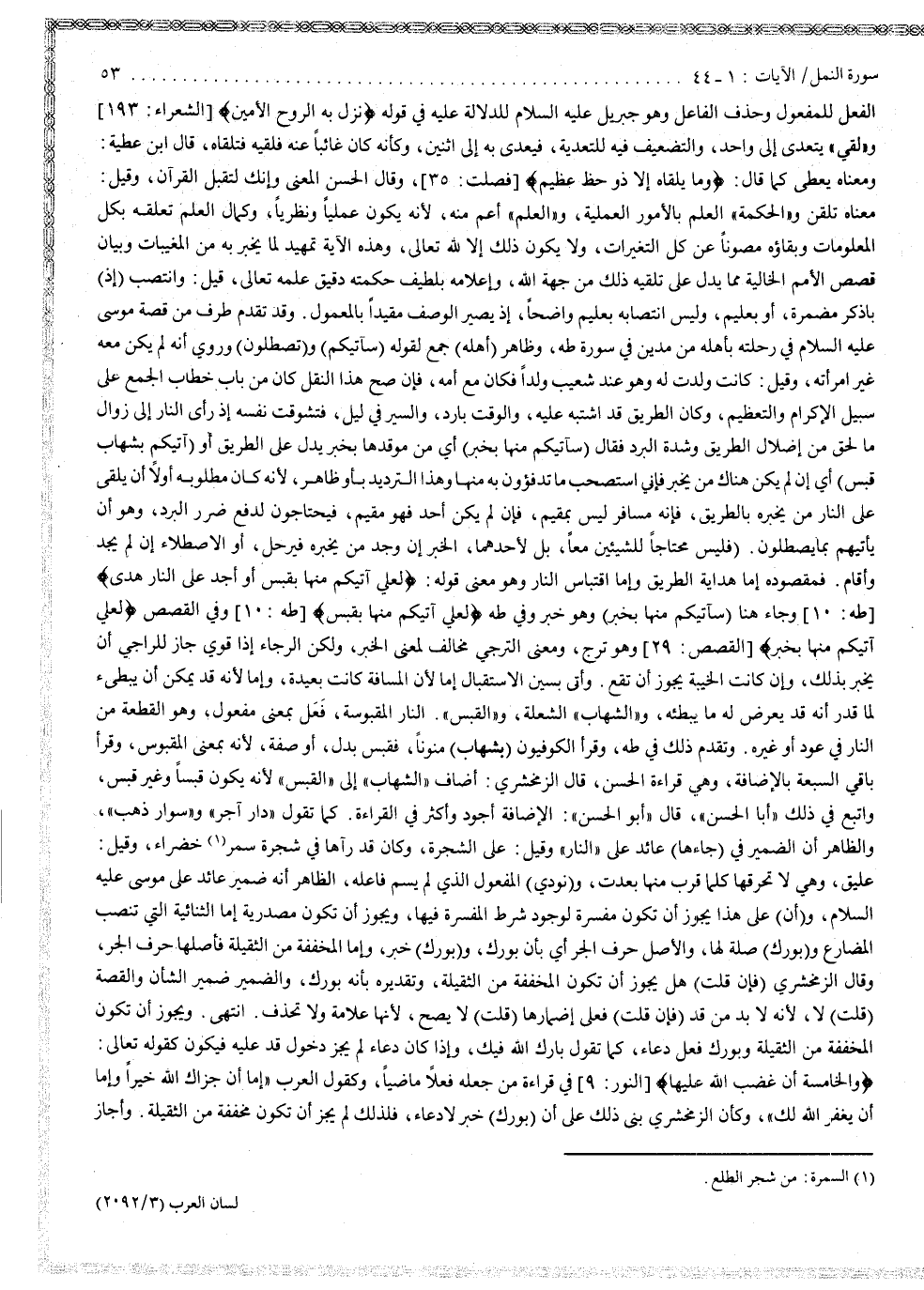 وجاء هنا : ) إِذْ قَالَ مُوسَى ( ، وهو خبر ، وفي طه : ) لَّعَلّى اتِيكُمْ مّنْهَا بِقَبَسٍ ( ، وفي القصص : ) فَلَمَّا قَضَى مُوسَى بِخَيْرٍ ( ، وهو ترج ، ومعنى الترجي مخالف لمعنى الخبر . ولكن الرجاء إذا قوي ، جاز للراجي أن يخبر بذلك ، وإن كانت الخيبة يجوز أن تقع . وأتى بسين الاستقبال ، إما لأن المسافة كانت بعيدة ، وإما لأنه قد يمكن أن تبطىء لما قدر أنه قد يعرض له ما يبطئه . والشهاب : الشعلة ، والقبس : النار المقبوسة ، فعل بمعنى مفعول ، وهو القطعة من النار في عود أو غيره ، وتقدم ذلك في طه . وقرأ الكوفيون : بشهاب منوناً ، فقبس بدل أو صفة ، لأنه بمعنى المقبوس . وقرأ باقي السبعة : بالإضافة ، وهي قراءة الحسن . قال الزمخشري : أضاف الشهاب إلى القبس ، ، واتبع في ذلك أبا الحسن . قال أبو الحسن : الإضافة أجود وأكثر في القراءة ، كما تقول : دار آجر ، وسوار ذهب . والظاهر أن الضمير في ) جَاءهَا ( عائد على النار ، وقيل : على الشجرة ، وكان قد رآها في شجرة سمر . وقيل : عليق ، وهي لا تحرقها ، كلما قرب منها بعدت . و ) نُودِىَ ( المفعول الذي لم يسم فاعله ، الظاهر أنه ضمير عائد على موسى عليه السلام . و ) ءانٍ ( على هذا يجوز أن تكون مفسرة لوجود شرط المفسرة فيها ، ويجوز أن تكون مصدرية . أما الثنائية التي تنصب المضارع ، وبورك صلة لها ، والأصل حرف الجر ، أي بأن بورك ، وبورك خبر . وأما المخففة من الثقيلة فأصلها حرف الجر . وقال الزمخشري : فإن قلت : هل يجوز أن تكون المخففة من الثقيلة ، وتقديره بأنه بورك ، والضمير ضمير الشأن والقصة ؟ قلت : لا ، لأنه لا بد من قد . فإن قلت : فعلى إضمارها ؟ قلت : لا يصح ، لأنها علامة ولا تحذف . انتهى . ويجوز أن تكون المخففة من الثقيلة ، وبورك فعل دعاء ، كما تقول : بارك الله فيك . وإذا كان دعاء ، لم يجز دخول قد عليه ، فيكون كقوله تعالى : ) وَالْخَامِسَةَ أَنَّ غَضَبَ اللَّهِ عَلَيْهَا ( في قراءة من جعله فعلاً ماضياً ، وكقول العرب : إما أن جزاك الله خيراً ، وإما أن يغفر الله لك ، وكان الزمخشري بنى ذلك على ) أَن بُورِكَ ( خبر لا دعاء ، فلذلك لم يجز أن تكون مخففة من الثقيلة ، وأجاز