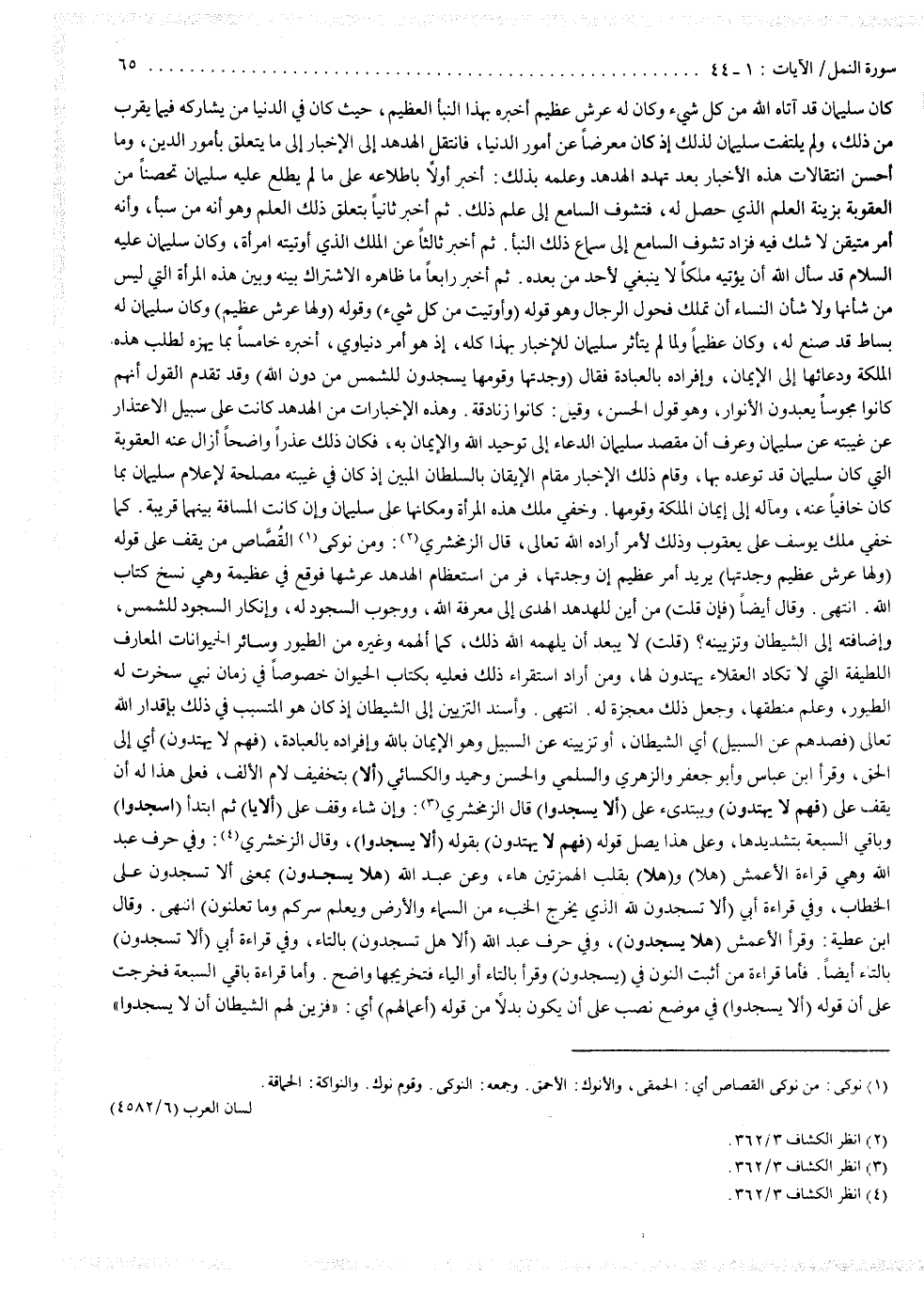 وهذه الإخبارات من الهدهد كانت على سبيل الاعتذار عن غيبته عن سليمان ، وعرف أن مقصد سليمان الدعاء إلى توحيد الله والإيمان به ، فكان ذلك عذراً واضحاً أزال عنه العقوبة التي كان سليمان قد توعده بها . وقام ذلك الإخبار مقام الإيقان بالسلطان المبين ، إذ كان في غيبته مصلحة لإعلام سليمان بما كان خافياً عنه ، ومآله إلى إيمان الملكة وقومها . وفي ملك هذه المرأة ومكانها على سليمان ، وإن كانت المسافة بينهما قريبة ، كما خفي ملك يوسف على يعقوب ، وذلك لأمر أراده الله تعالى . قال الزمخشري : ومن نوكي القصاص من يقف على قوله : ) وَلَهَا عَرْشٌ عَظِيمٌ ( ، وجدتها يريد أمر عظيم ، إن وجدتها فر من استعظام الهدهد عرشها ، فوقع في عظيمة وهي نسخ كتاب الله . انتهى . وقال أيضاً فإن قلت : من أين للهدهد الهدى إلى معرفة الله ووجوب السجود له ، وإنكار السجود للشمس ، وإضافته إلى الشيطان وتزيينه ؟ قلت : لا يبعد أن يلهمه الله ذلك ، كما ألهمه وغيره من الطيور وسائر الحيوانات المعارف اللطيفة الت لا تكاد العقلاء يهتدون لها . ومن أراد استقراء ذلك فعليه بكتاب الحيوان خصوصاً في زمان بني سخرت له الطيور وعلم منطقها ، وجعل ذلك معجزة له . انتهى .