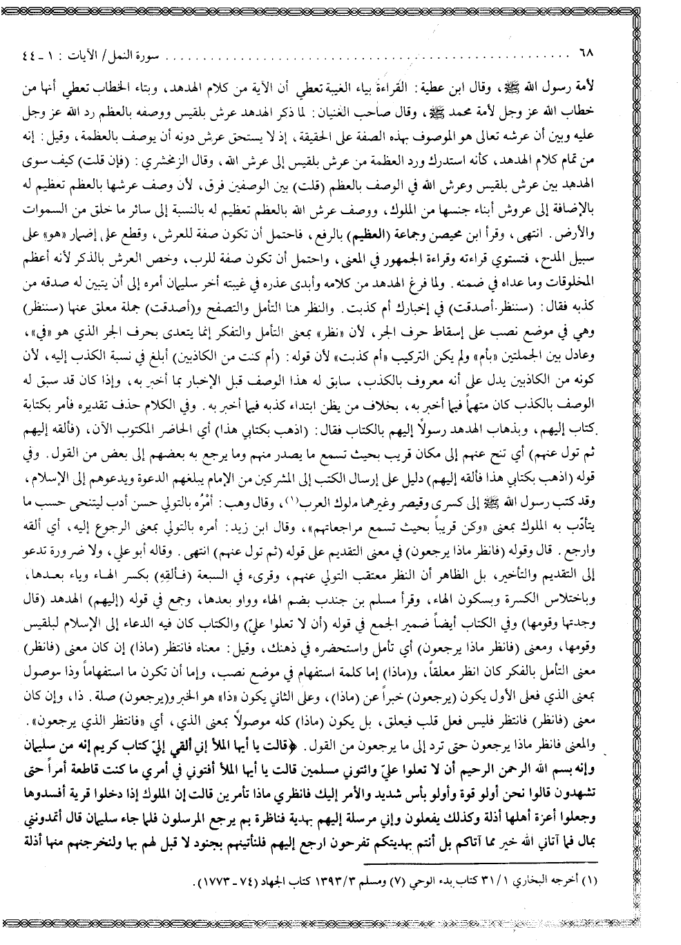 لأمة رسول الله ( صلى الله عليه وسلم ) ) . وقال ابن عطية : القراءة بياء الغيبة تعطي أن الآية من كلام الهدهد ، وبتاء الخطاب تعطي أنها من خطاب الله عز وجل لأمة محمد ( صلى الله عليه وسلم ) ) .