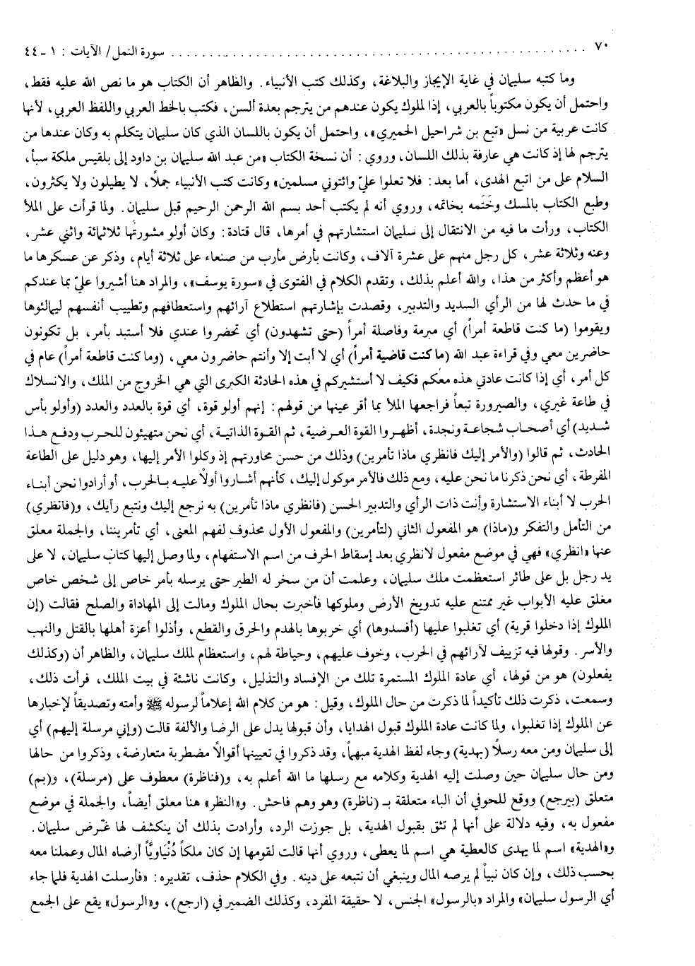 ولما وصل إليها كتاب سليمان ، لا على يد رجل بل على طائر ، استعظمت ملك سليمان ، وعلمت أن من سخر له الطير حتى يرسله بأمر خاص إلى شخص خاص مغلق عليه الأبواب ، غير ممتنع عليه تدويخ الأرض وملوكها ، فأخبرت بحال الملوك ومالت إلى المهاداة والصلح فقالت : ) إِنَّ الْمُلُوكَ إِذَا دَخَلُواْ قَرْيَةً ( : أي تغلبوا عليها ، ( أَفْسَدُوهَا ( : أي خربوها بالهدم والحرق والقطع ، وأذلوا أعزة أهلها بالقتل والنهب والأسر ، وقولها فيه تزييف لآرائهم في الحرب ، وخوف عليهم وحياطة لهم ، واستعظام لملك سليمان . والظاهر أن ) وَكَذالِكَ يَفْعَلُونَ ( هو من قولها ، أي عادة الملوك المستمرة تلك من الإفساد والتذليل ، وكانت ناشئة في بيت الملك ، فرأت ذلك وسمعت . ذكرت ذلك تأكيداً لما ذكرت من حال الملوك . وقيل : هو من كلام الله إعلاماً لرسوله ( صلى الله عليه وسلم ) ) وأمته ، وتصديقاً لإخبارها عن الملوك إذا تغلبوا .