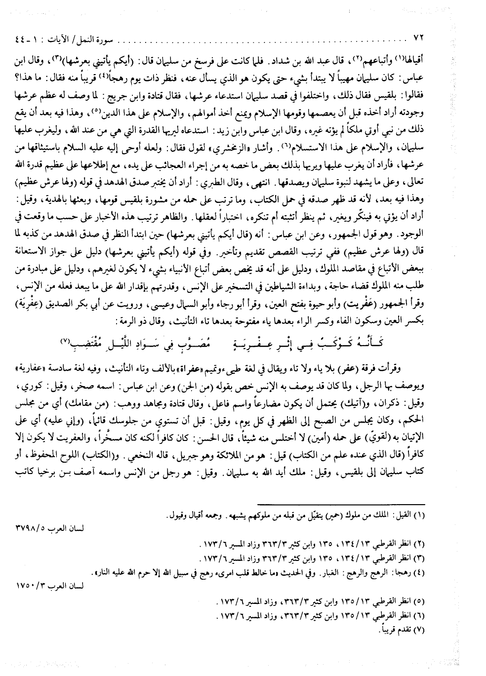 قال عبد الله بن شداد : فلما كانت على فرسخ من سليمان ، قال : ) أَيُّكُمْ يَأْتِينِى بِعَرْشِهَا ( ؟ وقال ابن عباس : كان سليمان مهيباً ، لا يبتدأ بشيء حتى يكون هو الذي يسأل عنه . فنظر ذات يوم رهجاً قريباً منه فقال : ما هذا ؟ فقالوا : بلقيس ، فقال ذلك . واختلفوا في قصد سليمان استدعاء عرشها . فقال قتادة ، وابن جريج : لما وصف له عظم عرشها وجودته ، أراد أخذه قبل أن يعصمها وقومها الإسلام ويمنع أخذ أموالهم ، والإسلام على هذا الدين ، وهذا فيه بعد أن يقع ذلك من نبي أوتي ملكاً لم يؤته غيره . وقال ابن عباس ، وابن زيد : استدعاه ليريها القدرة التي هي من عند الله ، وليغرب عليها سليمان والإسلام على هذا الاستسلام . وأشار الزمخشري لقول فقال : ولعله أوحي إليه عليه السلام باستيثاقها من عرشها ، فأراد أن يغرب عليها ويريها بذلك بعض ما خصه به من إجراء العجائب على يده ، مع اطلاعها على عظيم قدرة الله تعالى ، وعلى ما يشهد لنبوة سليمان ويصدقها . انتهى . وقال الطبري : أراد أن يختبر صدق الهدهد في قوله : ) وَلَهَا عَرْشٌ عَظِيمٌ ( ، وهذا فيه بعد ، لأنه قد ظهر صدقة في حمل الكتاب ، وما ترتب على حمله من مشورة بلقيس قومها وبعثها بالهدية . وقيل : أراد أن يؤتي به ، فينكر ويغير ، ثم ينظر أتثبته أم تنكره ، اختباراً لعقلها . والظاهر ترتيب هذه الأخبار على حسب ما وقعت في الوجود ، وهو قول الجمهور . وعن ابن عباس أنه قال : ) أَيُّكُمْ يَأْتِينِى بِعَرْشِهَا ( ؟ حين ابتدأ النظر في صدق الهدهد من كذبه لما قال : ) وَلَهَا عَرْشٌ عَظِيمٌ ). ففي ترتيب القصص تقديم وتأخير ، وفي قوله : ) أَيُّكُمْ يَأْتِينِى بِعَرْشِهَا ( دليل على جواز الاستعانة ببعض الاتباع في مقاصد الملوك ، ودليل على أنه قد يخص بعض أتباع الأنبياء بشيء لا يكون لغيرهم ، ودليل على مبادرة من طلبه منه الملوك قضاء حاجة ، وبداءة الشياطين في التسخير على الإنس ، وقدرتهم بأقدار الله على ما يبعد فعله من الإنس . وقرأ الجمهور : عفريت ، وأبو حيوة : بفتح العين . وقرأ أبو رجاء ، وأبو السمال ، وعيسى ، ورويت عن أبي بكر الصديق : عفرية ، بكسر العين ، وسكون الفاء ، وكسر الراء ، بعدها ياء مفتوحة ، بعدها تاء التأنيث . وقال ذو الرمة : كأنه كوكب في إثر عفرية