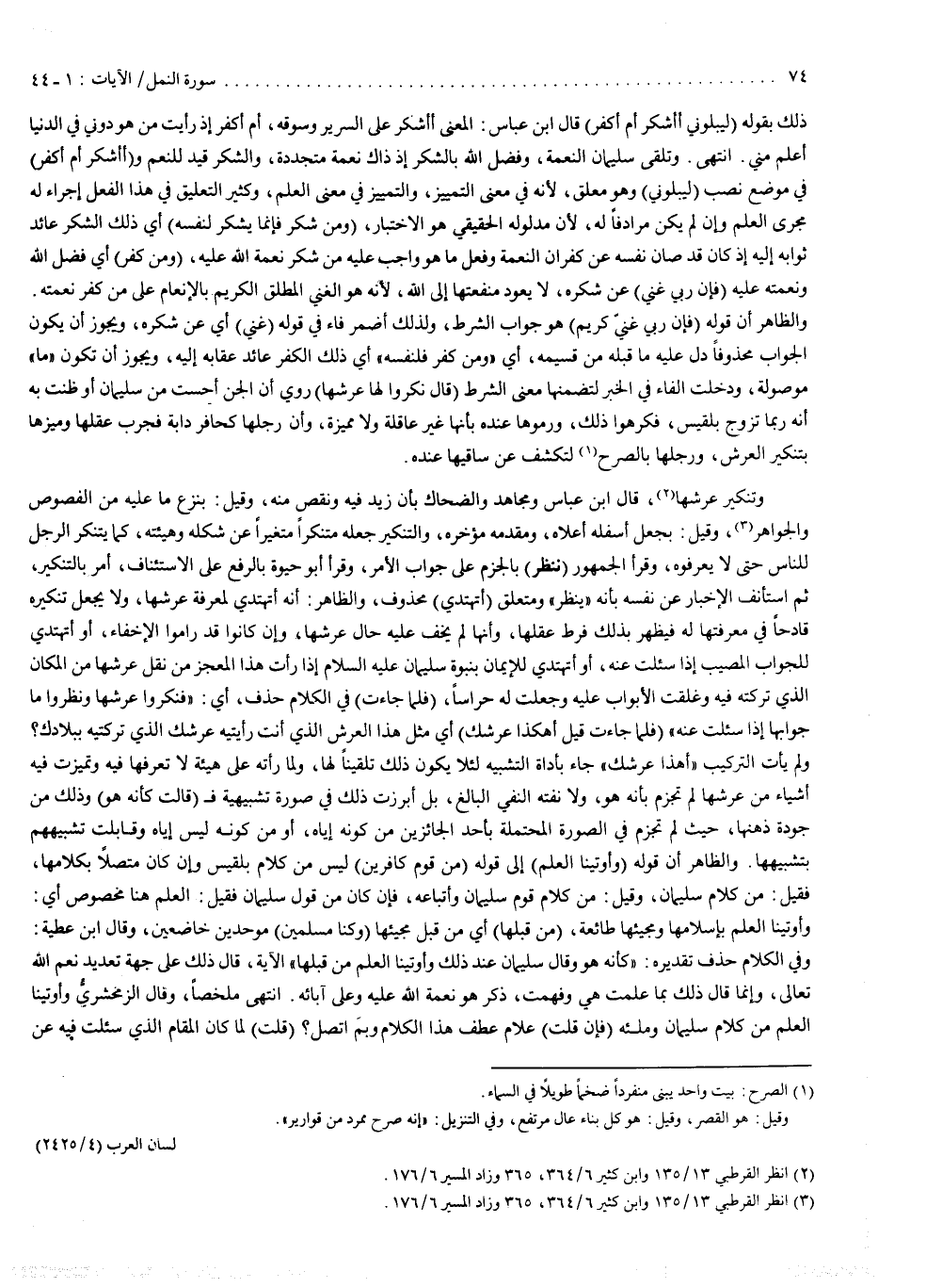( فَلَمَّا جَاءتْ ( ، في الكلام حذف ، أي فنكروا عرشها ونظروا ما جوابها إذا سئلت عنه . ) فَلَمَّا جَاءتْ قِيلَ أَهَكَذَا عَرْشُكِ ( : أي مثل هذا العرش الذي أنت رأيتيه عرشك الذي تركتيه ببلادك ؟ ولم يأت التركيب : أهذا عرشك ؟ جاء بأداة التشبيه ، لئلا يكون ذلك تلقيناً لها . ولما رأته على هيئة لا تعرفها فيه ، وتميزت فيه أشياء من عرشها ، لم تجزم بأنه هو ، ولا نفته النفي البالغ ، بل أبرزت ذلك في صورة تشبيهية فقالت : ) كَأَنَّهُ هُوَ ( ، وذلك من جودة ذهنها ، حيث لم تجزم في الصورة المحتملة بأحد الجائزين من كونه إياه أو من كونه ليس إياه ، وقابلت تشبيههم بتشبيهها . والظاهر أن قوله : ) وَأُوتِينَا الْعِلْمَ ( إلى قوله : ) مِن قَوْمٍ كَافِرِينَ ( ليس من كلام بلقيس ، وإن كان متصلاً بكلامها . فقيل : من كلام سليمان . وقيل : من كلام قوم سليمان وأتباعه . فإن كان من قول سليمان فقيل : العلم هنا مخصوص ، أي وأوتينا العلم بإسلامها ومجيئها طائعة . ) مِن قَبْلِهَا ( أي من قبل مجيئها . ) وَكُنَّا مُسْلِمِينَ ( : موحدين خاضعين . وقال ابن عطية : وفي الكلام حذف تقديره كأنه هو ، وقال سليمان عند ذلك : ) وَأُوتِينَا الْعِلْمَ مِن قَبْلِهَا ( الآية ، قال ذلك على جهة تعديد نعم الله تعالى ، وإنما قال ذلك بما علمت هي وفهمت ، ذكر هو نعمة الله عليه وعلى آبائه . انتهى ملخصاً . وقال الزمخشري : وأوتينا العلم من كلام سليمان وملائه ، فإن قلت : علام عطف هذا الكلام وبما اتصل ؟ قلت : لما كان المقام الذي سئلت فيه عن