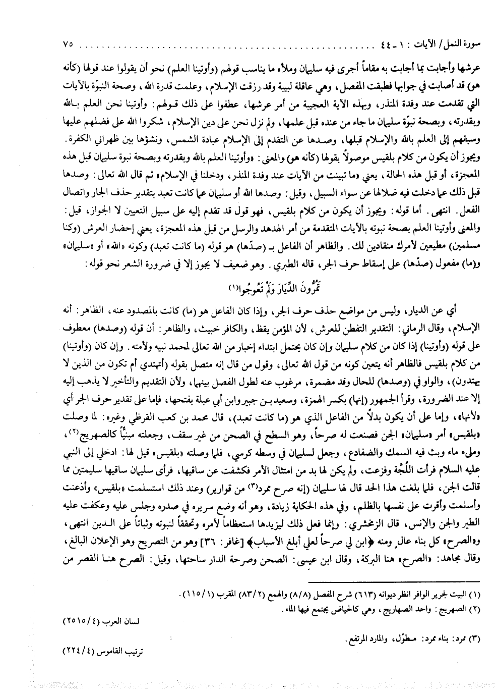 أي عن الديار ، وليس من مواضع حذف حرف الجر . وإذا كان الفاعل هو ما كانت بالمصدود عنه ، الظاهر أنه الإسلام . وقال الرماني : التقدير التفطن للعرش ، لأن المؤمن يقظ والكافر خبيث . والظاهر أن قوله : ) وَصَدَّهَا ( معطوف على قوله : ) وَأُوتِينَا ( ، إذا كان من كلام سليمان ، وإن كان يحتمل ابتداء إخبار من الله تعالى لمحمد نبيه ولأمته . وإن كان وأوتينا من كلام بلقيس ، فالظاهر أنه يتعين كونه من قول الله تعالى وقول من قال إنه متصل بقوله : ) أَتَهْتَدِى أَمْ تَكُونُ مِنَ الَّذِينَ لاَ يَهْتَدُونَ ). والواو في صدها للحال ، وقد مضمرة مرغوب عنه لطول الفصل بينهما ، ولأن التقديم والتأخير لا يذهب إليه إلا عند الضرورة . وقرأ الجمهور : إنها بكسر الهمزة ، وسعيد بن جبير ، وابن أبي عبلة : بفتحها ، فإما على تقدير حرف الجر ، أي لأنها ، وإما على أن يكون بدلاً من الفاعل الذي هو ما كانت تعبد .
