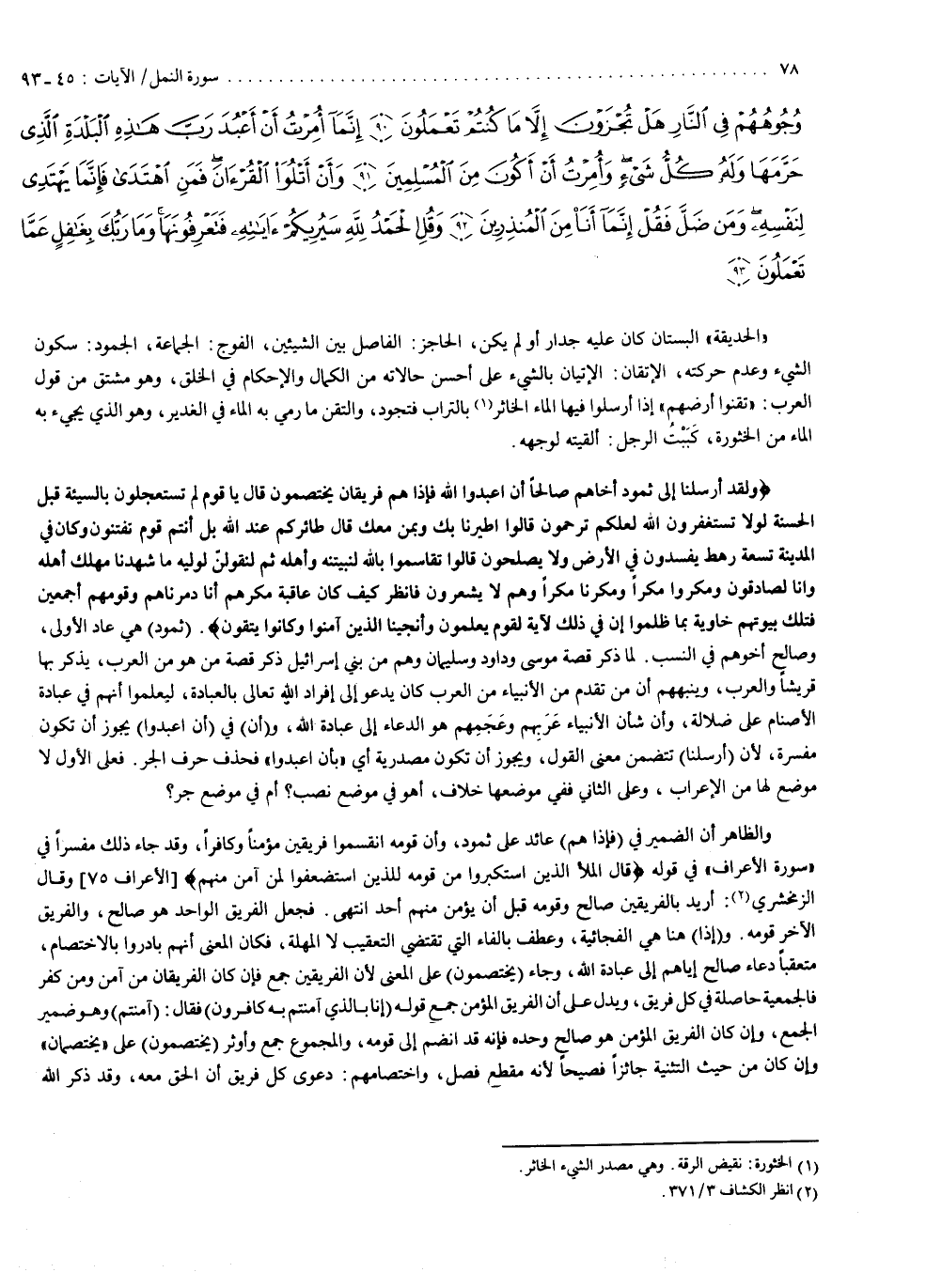 والحديقة : البستان ، كان عليه جدار أو لم يكن . الحاجز : الفاصل بين الشيئين . الفوج : الجماعة . الجمود : سكون الشيء وعدم حركته . الإتقان : الإتيان بالشيء على أحسن حالاته من الكمال والإحكام في الخلق ، وهو مشتق من قول العرب : تقنوا أرضهم إذا أرسلوا فيها الماء الخاثر بالتراب فتجود ، والتقن : ما رمي به الماء في الغدير ، وهو الذي يجيء به الماء من الخثورة . كبيت الرجل : ألقيته لوجهه .
